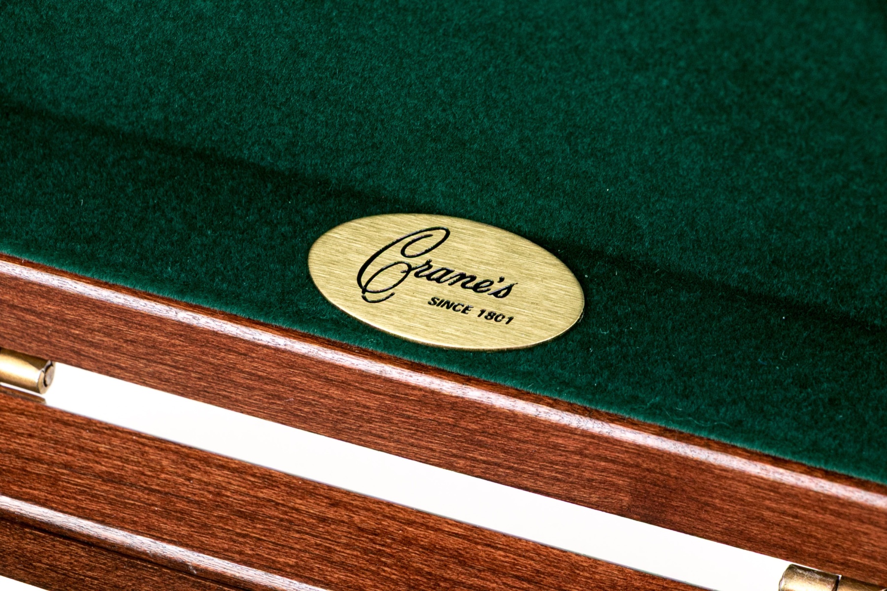 A quality duo of Crane's stationery boxes well crafted in warm-toned medium brown wood with hinged lids opening to forest green felt lined interiors. Both include removable tray inserts. The larger features two compartments bisected by a central pen rest, including a green pen.