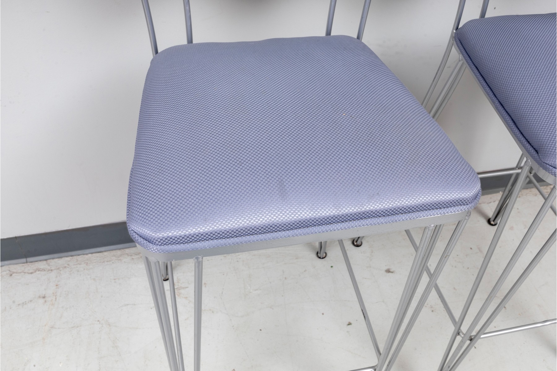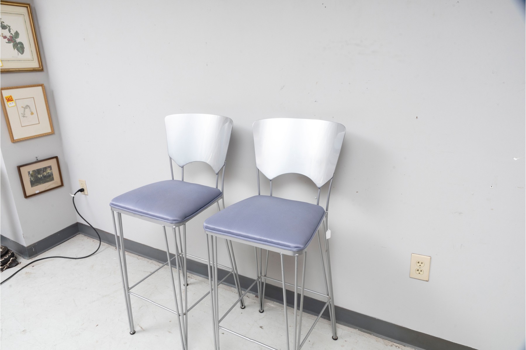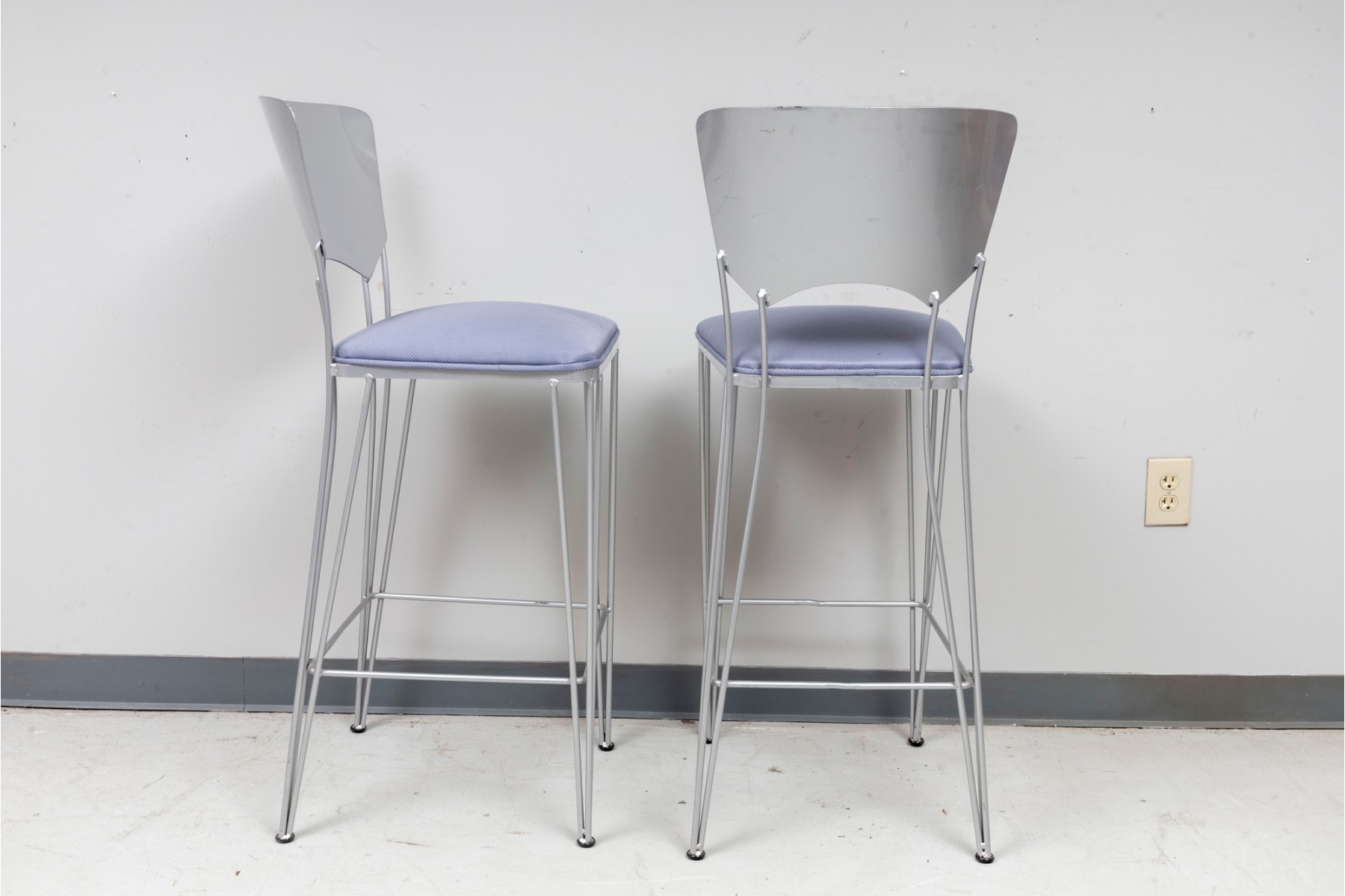 Pair of vintage retro stainless steel bar-stools or parlor chairs upholstered in muted violet in satin.