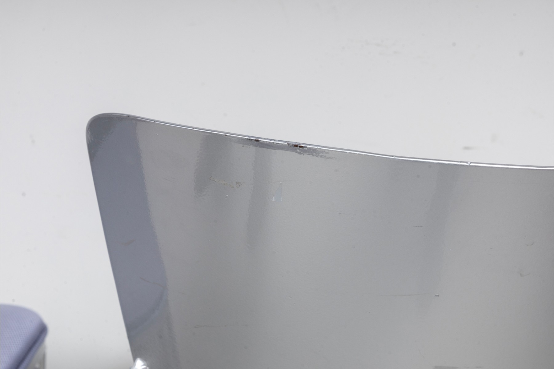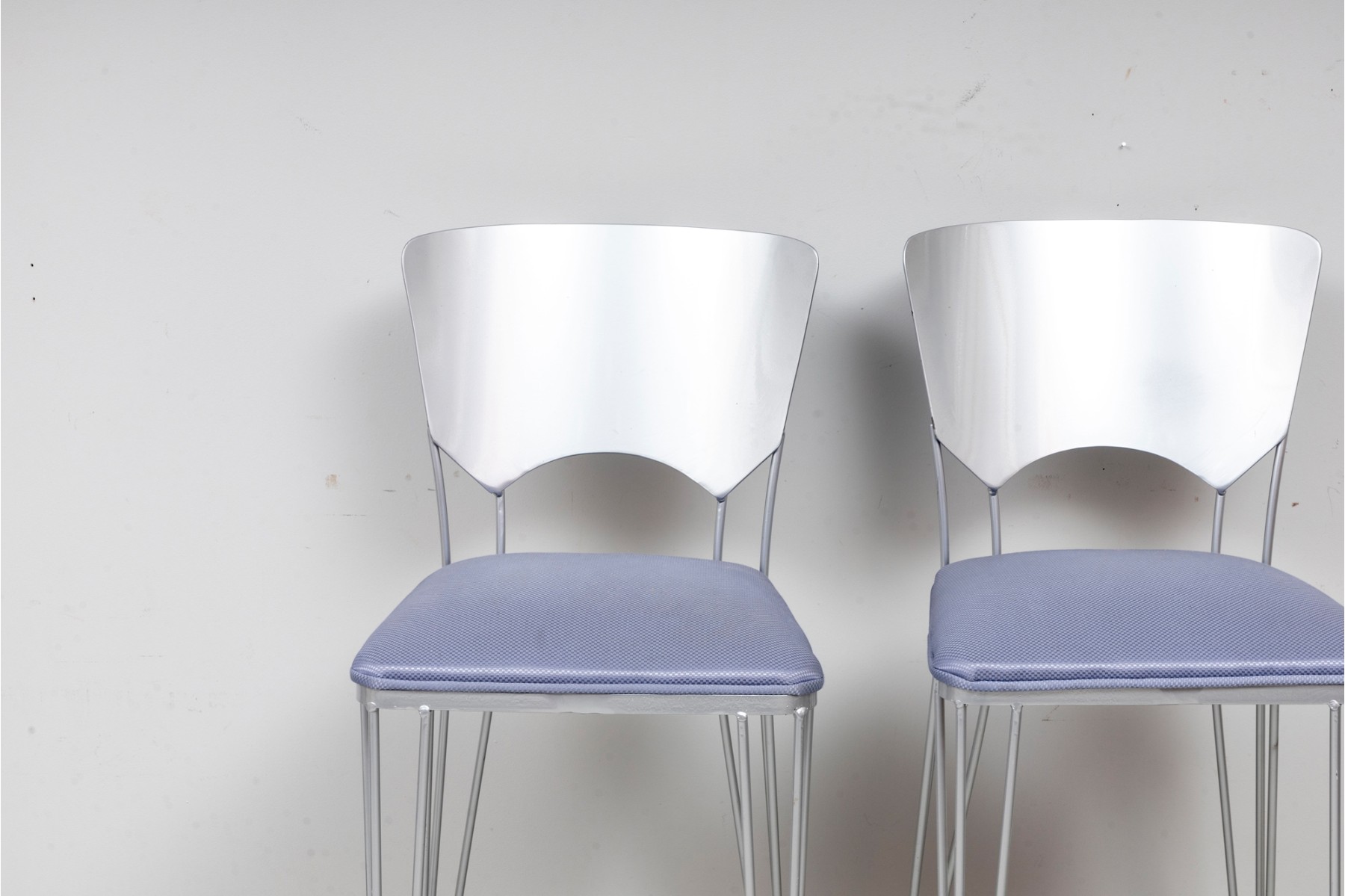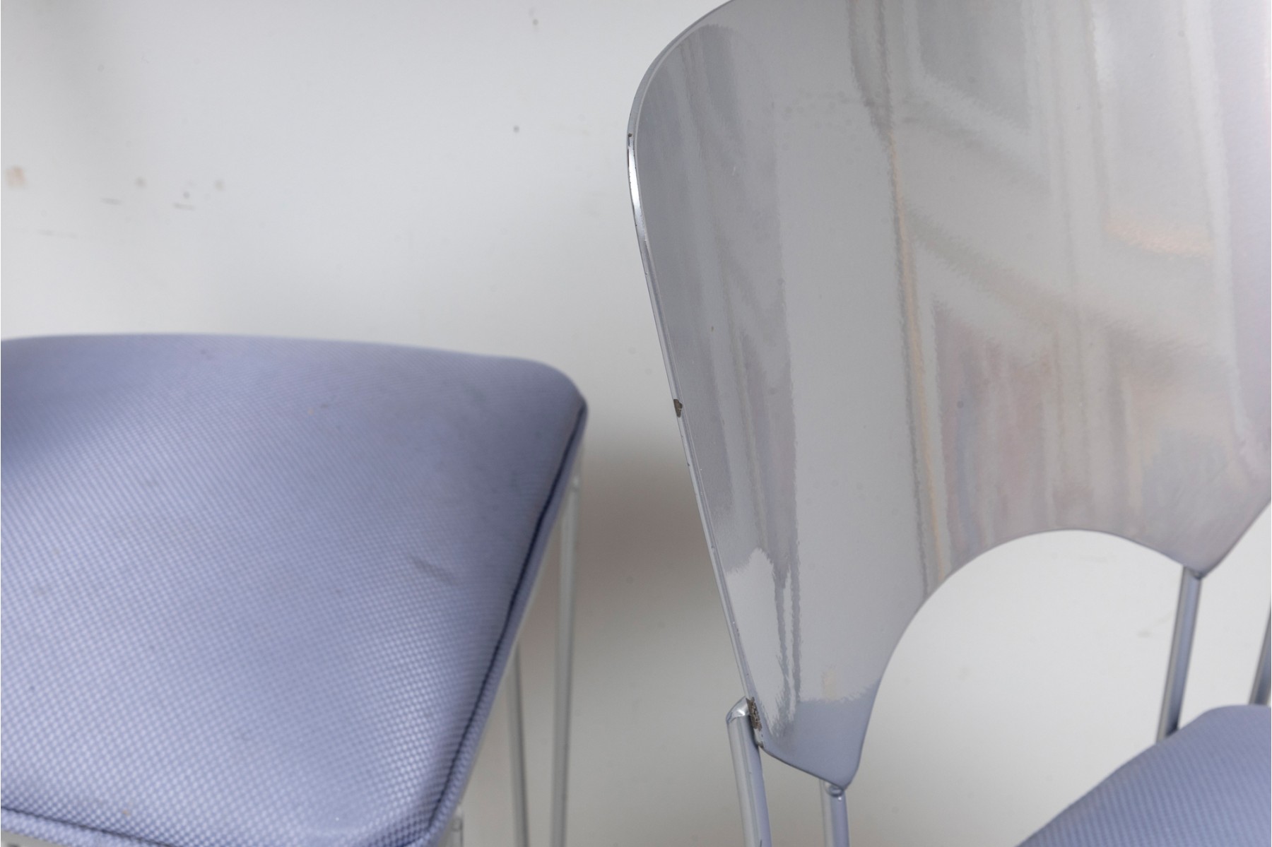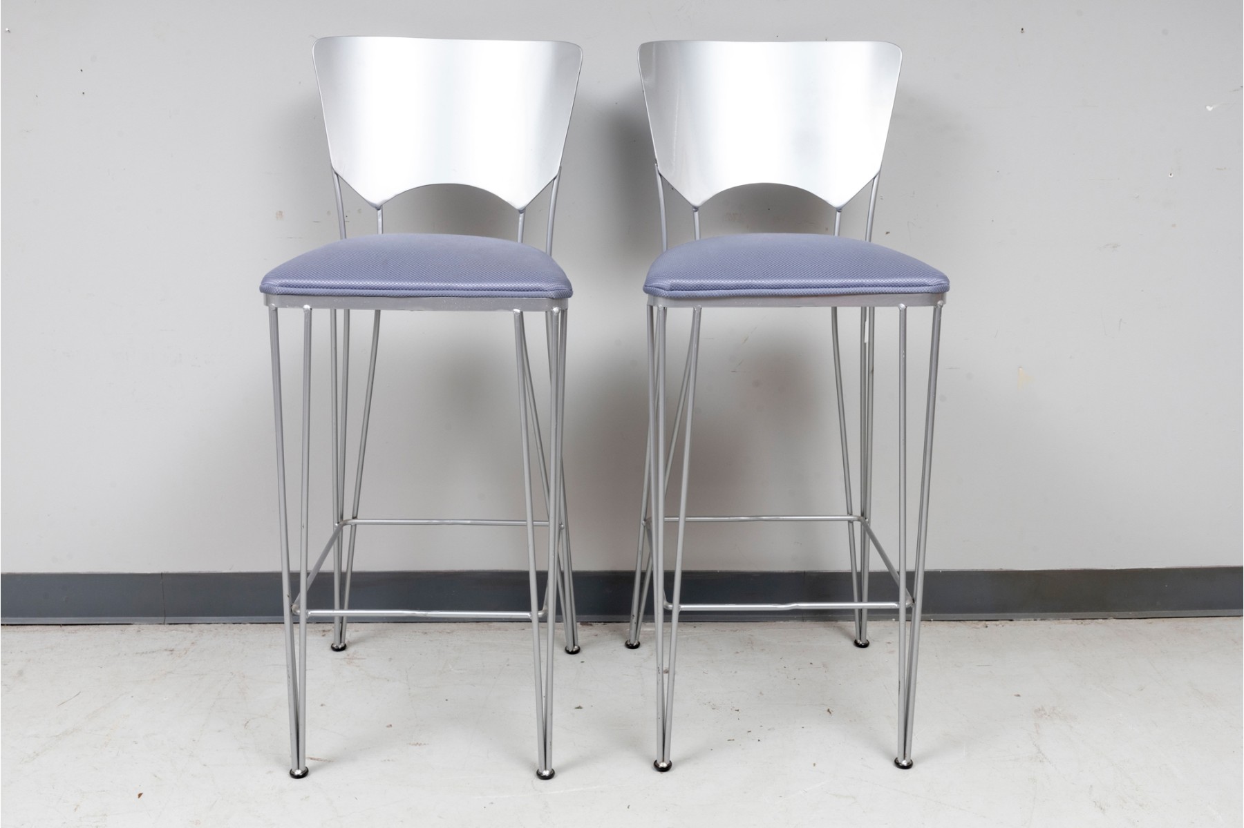 Pair of vintage retro stainless steel bar-stools or parlor chairs upholstered in muted violet in satin.