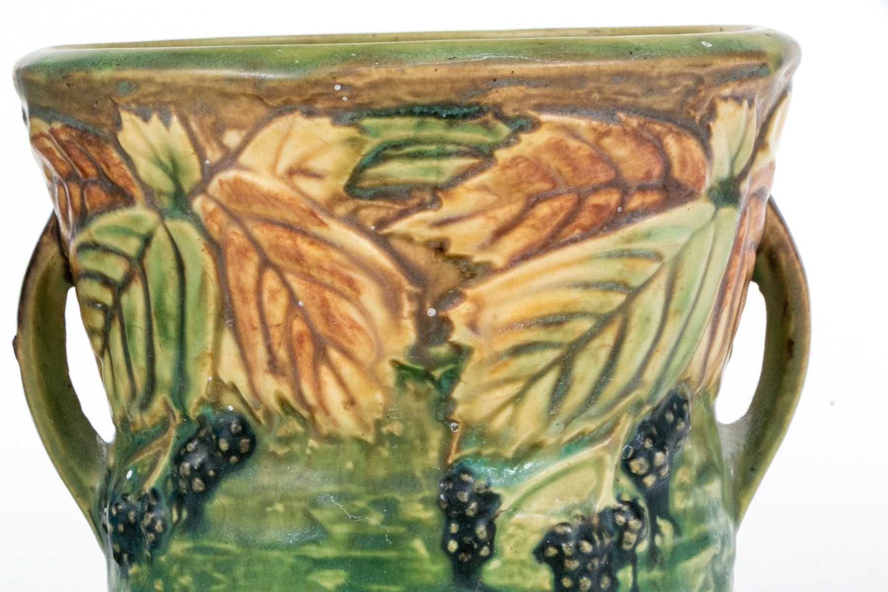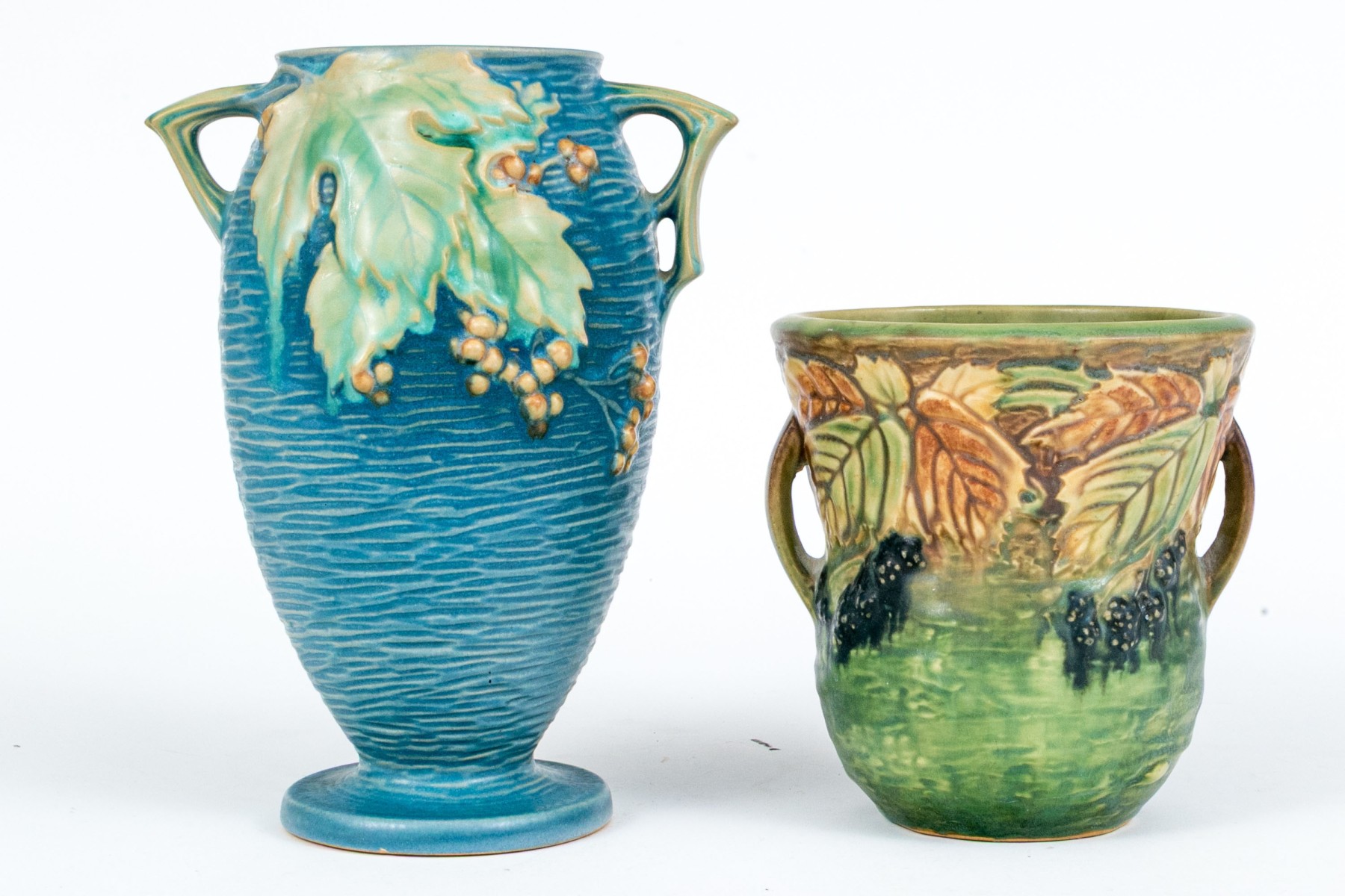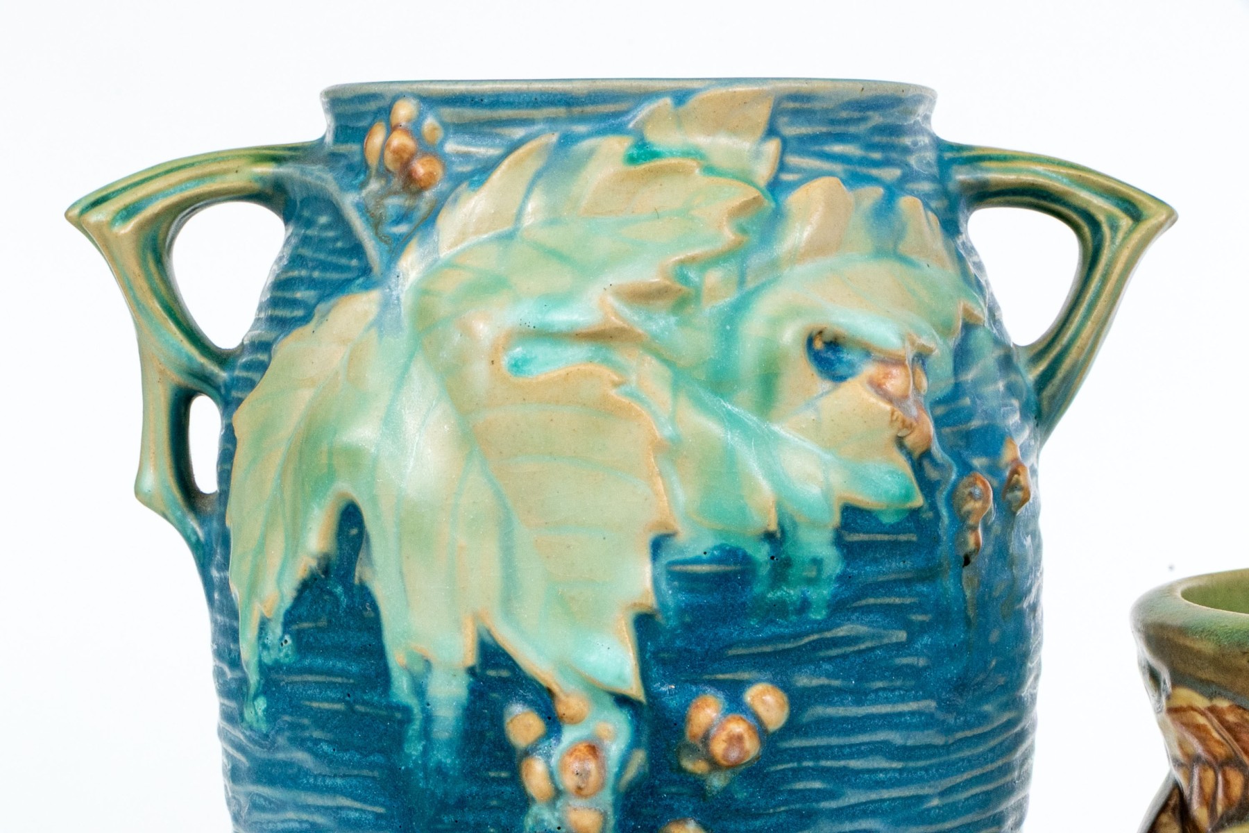A delightful duo of Roseville ceramic vases with beautiful moulded and glazed foliate features.