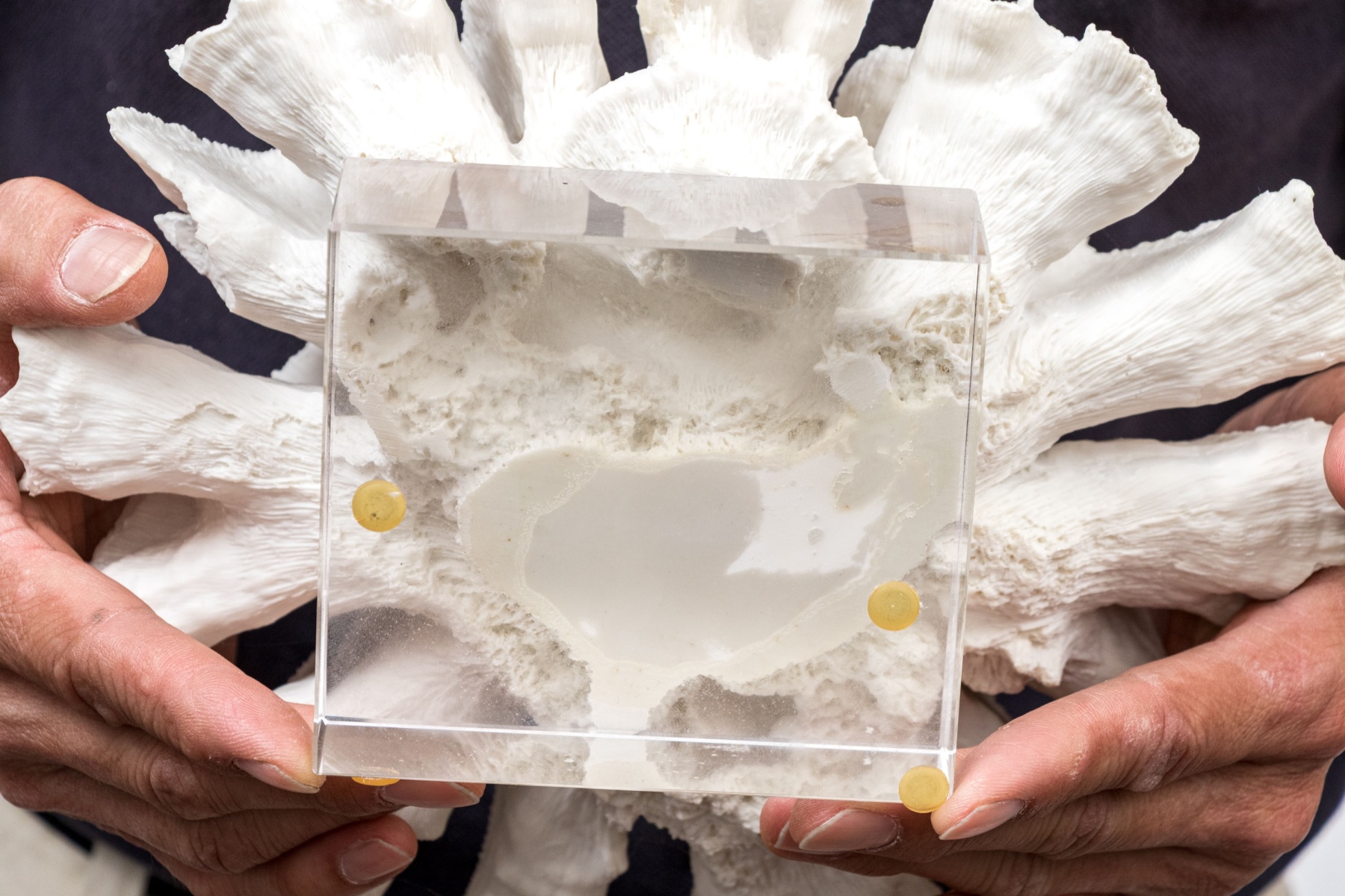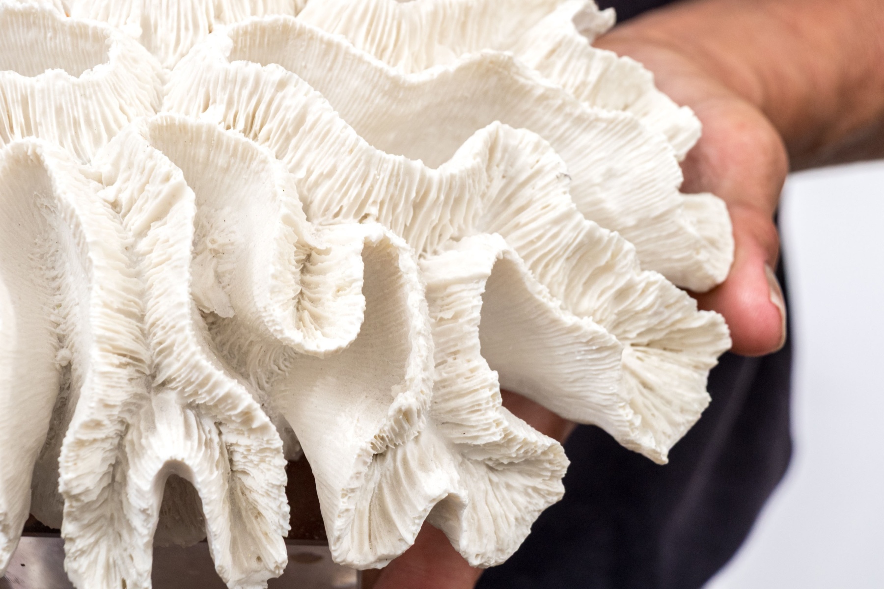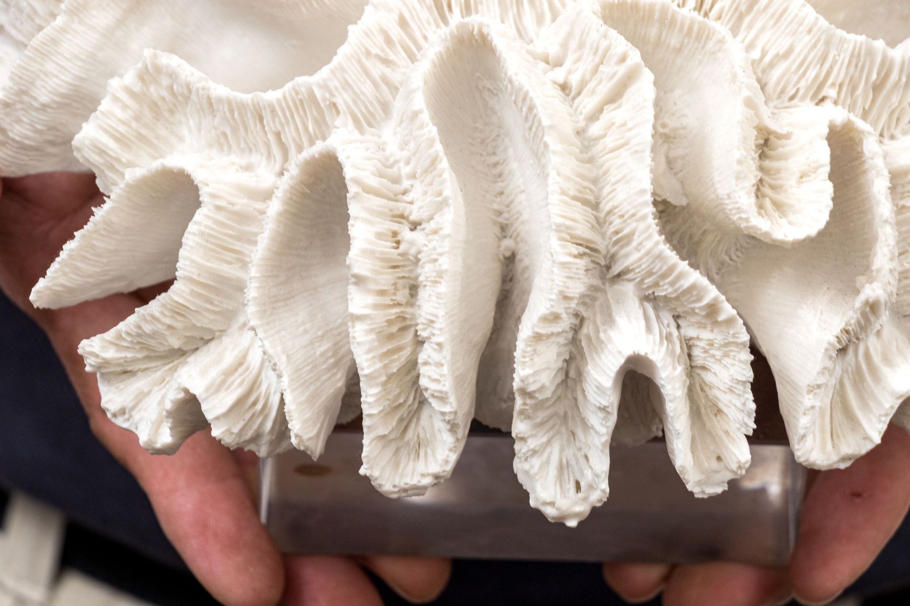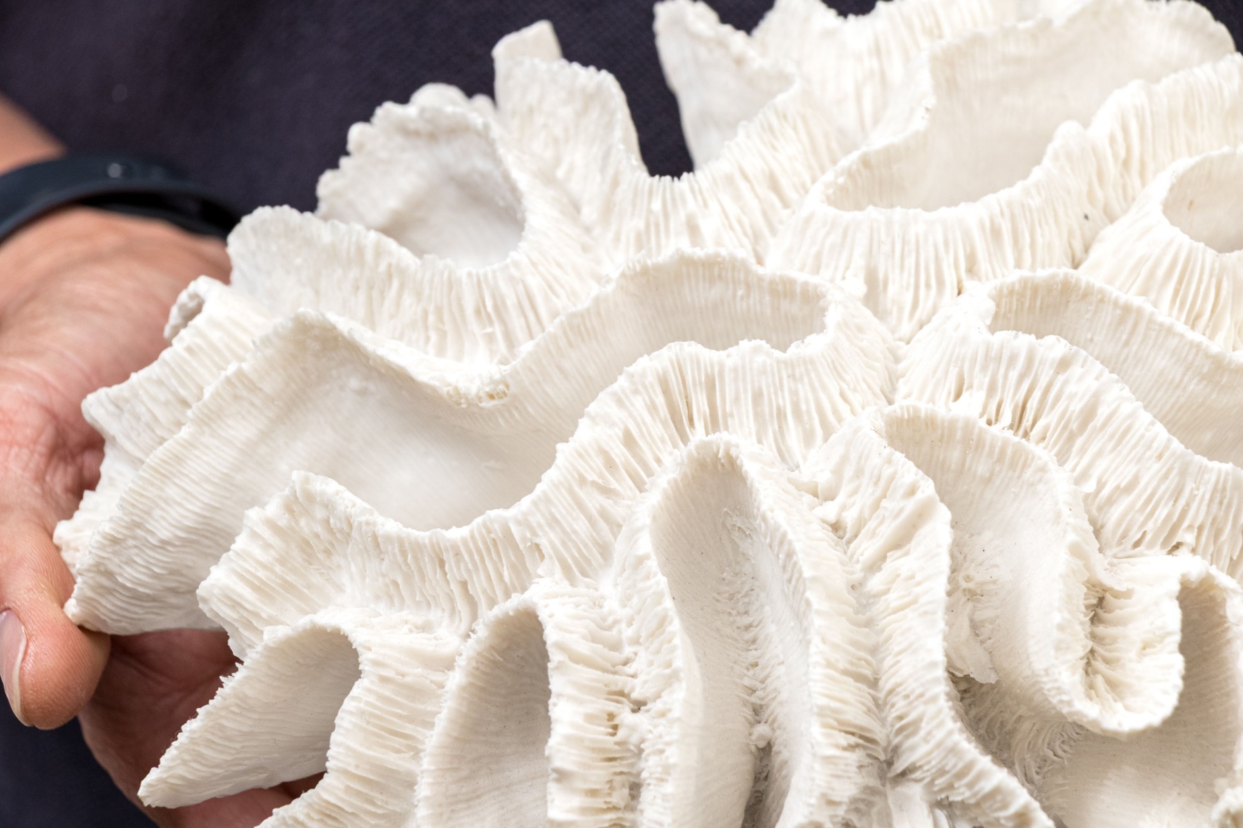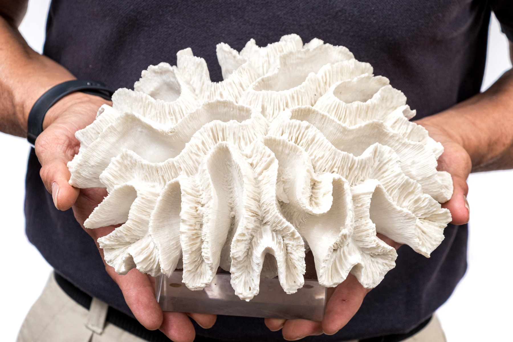 A naturalistically formed and highly decorative Two's Company coral with striking meandering ridges, mounted to a clear acrylic base.