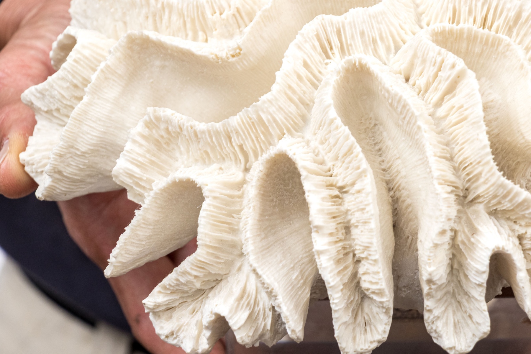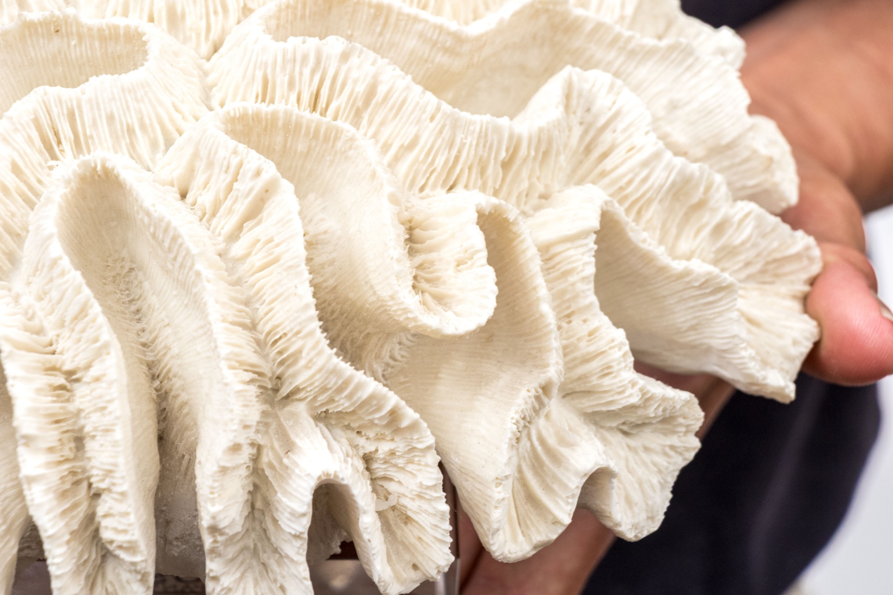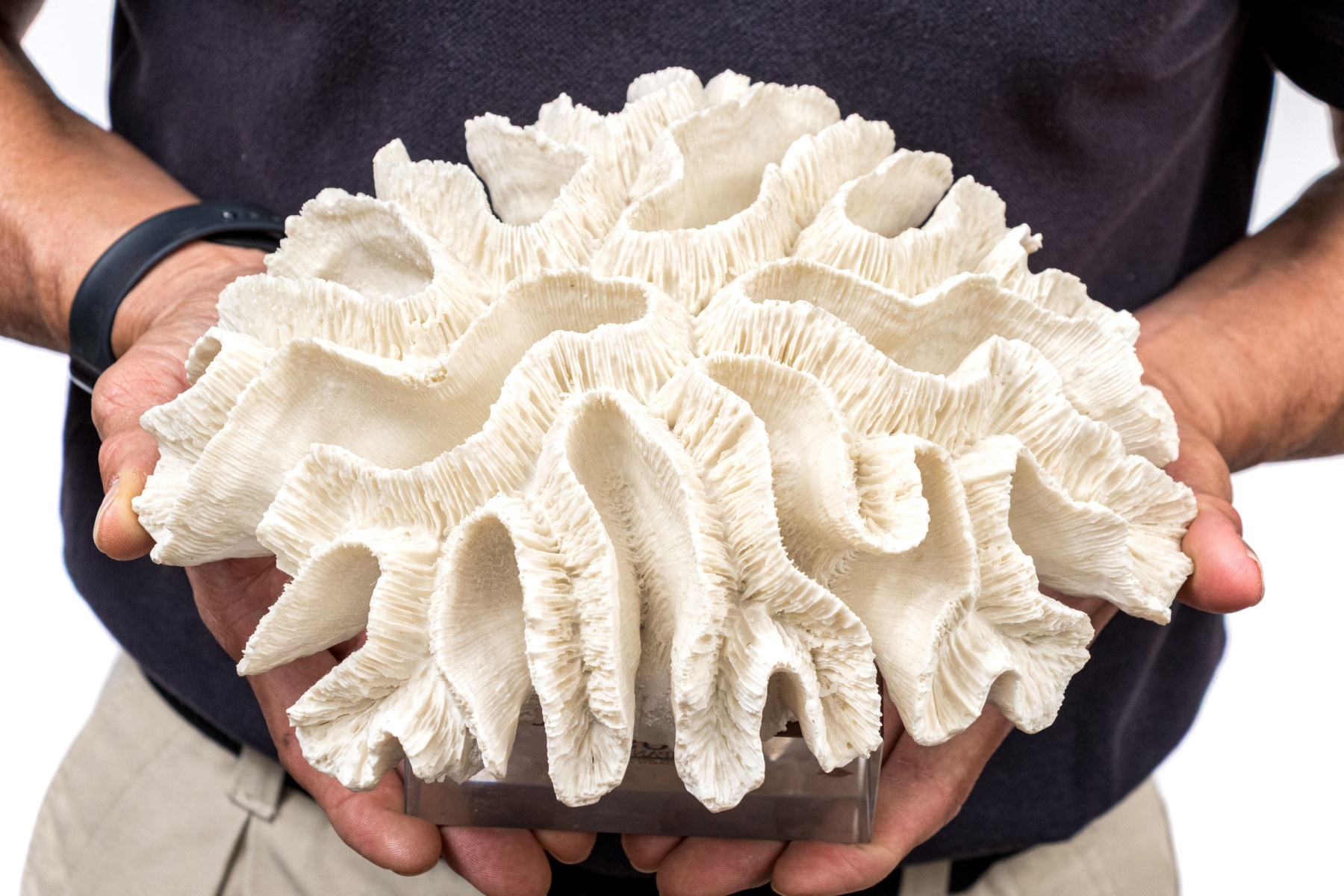 A naturalistically formed and highly decorative Two's Company coral with striking meandering ridges, mounted to a clear acrylic base.