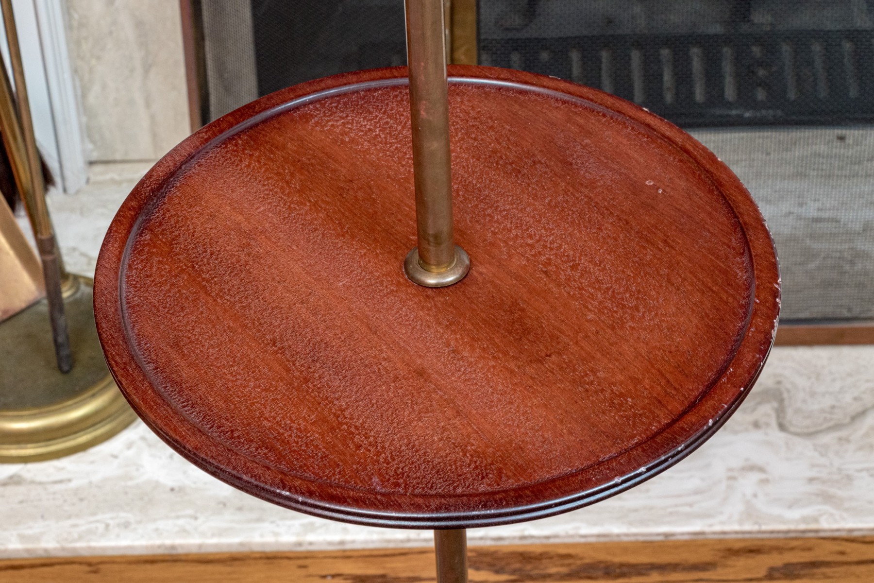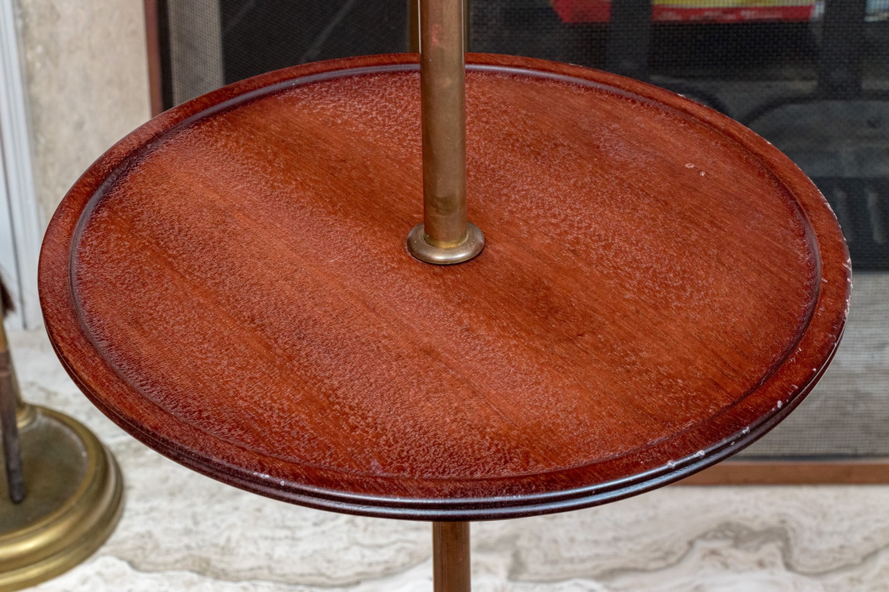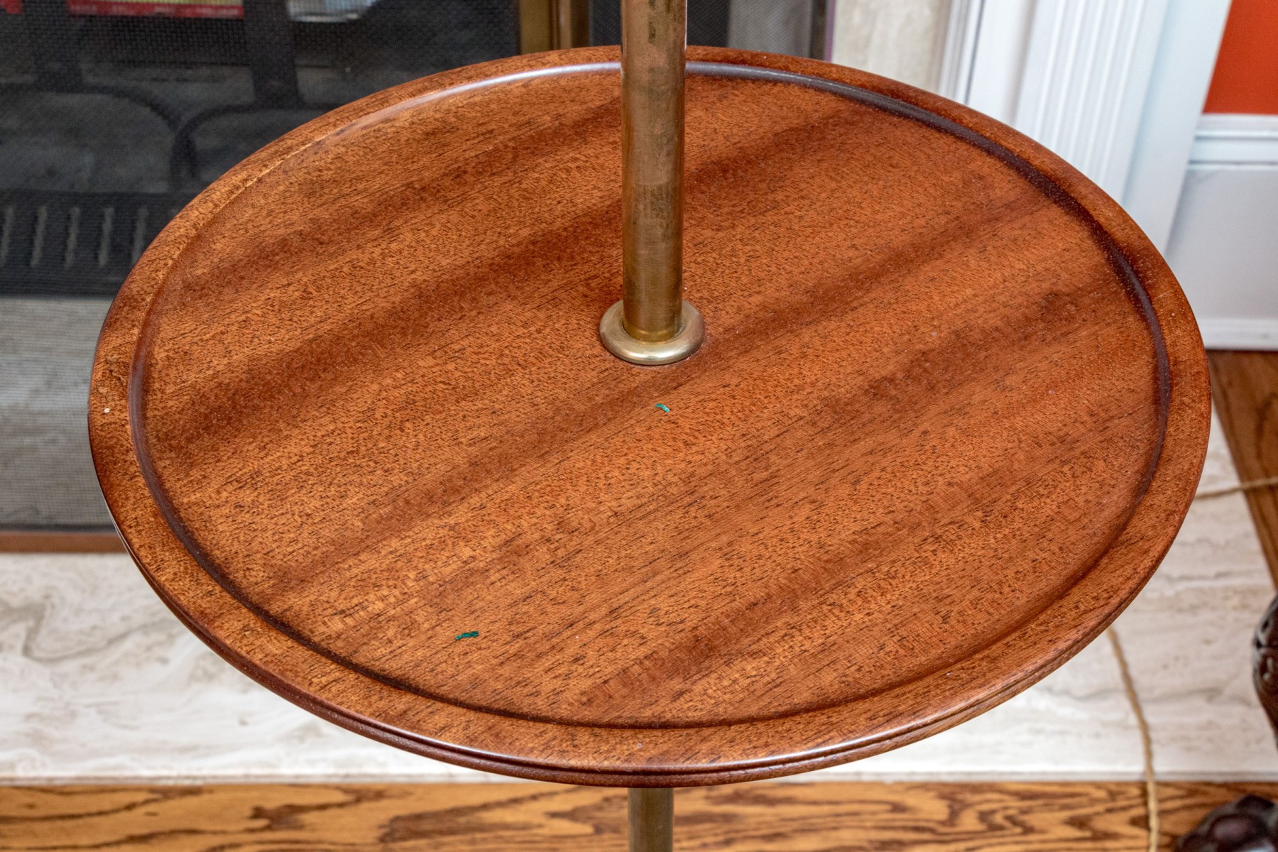 Each adjustable height, delicate brass floor lamp having a floating mahogany table on sculptural spur feet joined with a ball to the brass standard, operates with foot pedal.