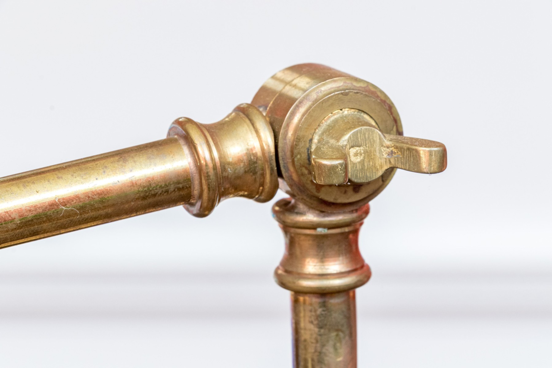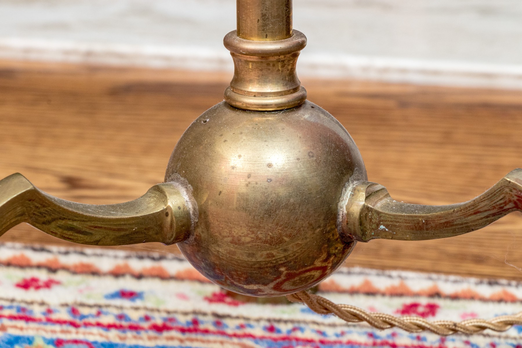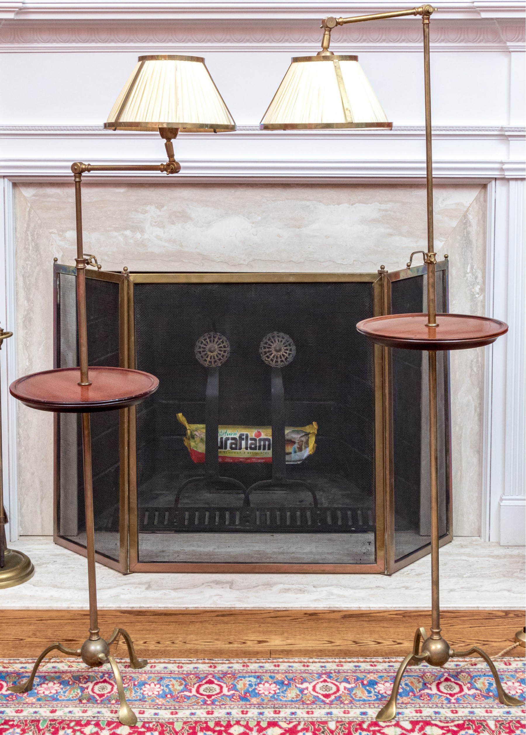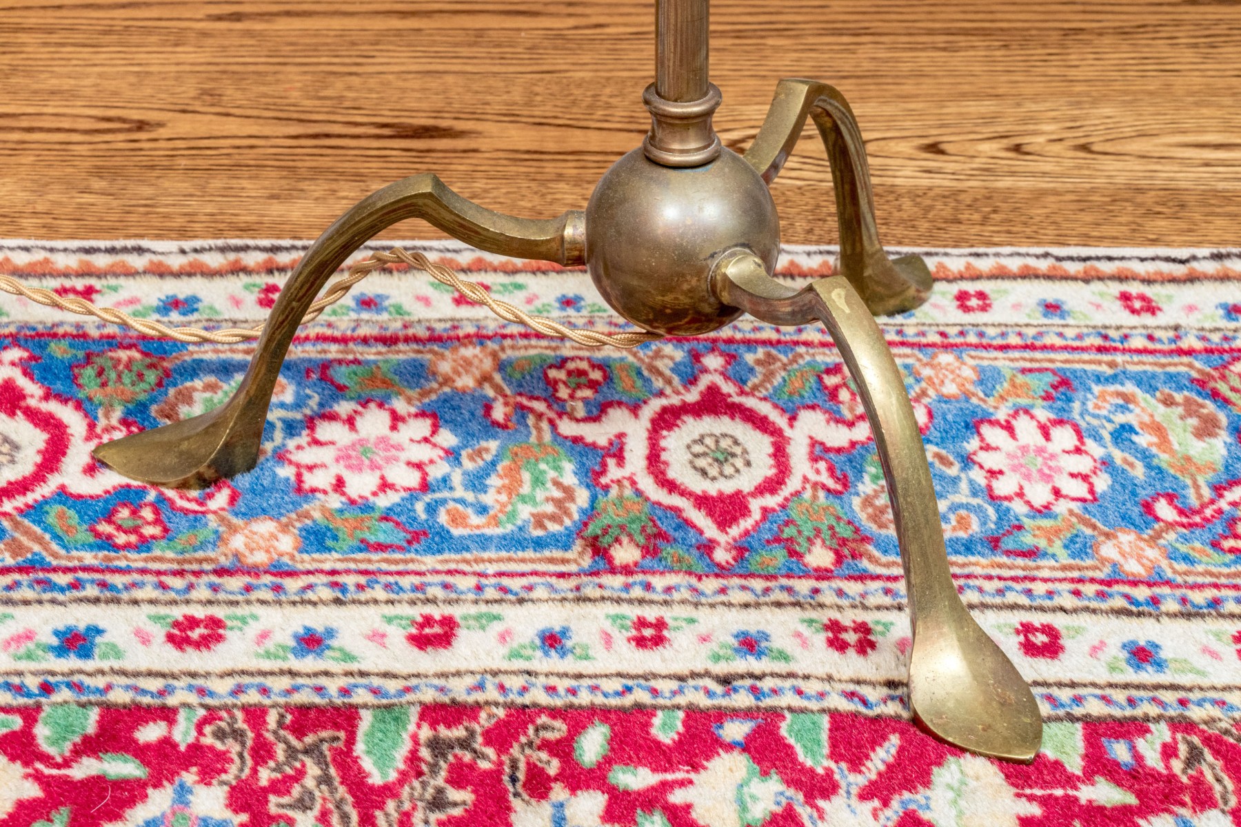Each adjustable height, delicate brass floor lamp having a floating mahogany table on sculptural spur feet joined with a ball to the brass standard, operates with foot pedal.