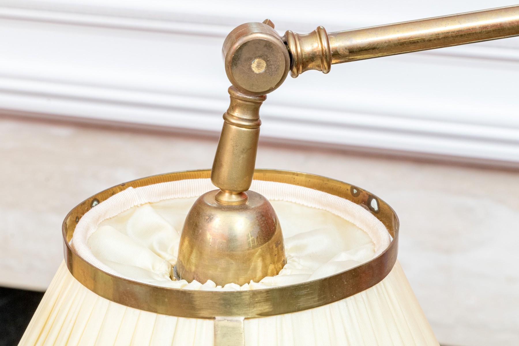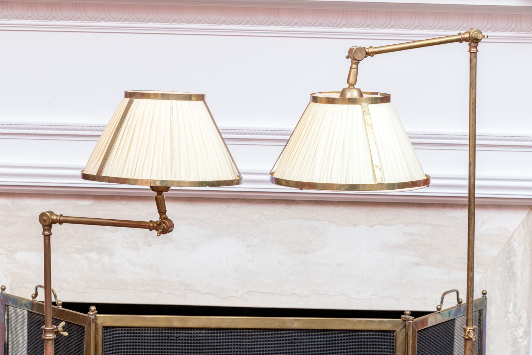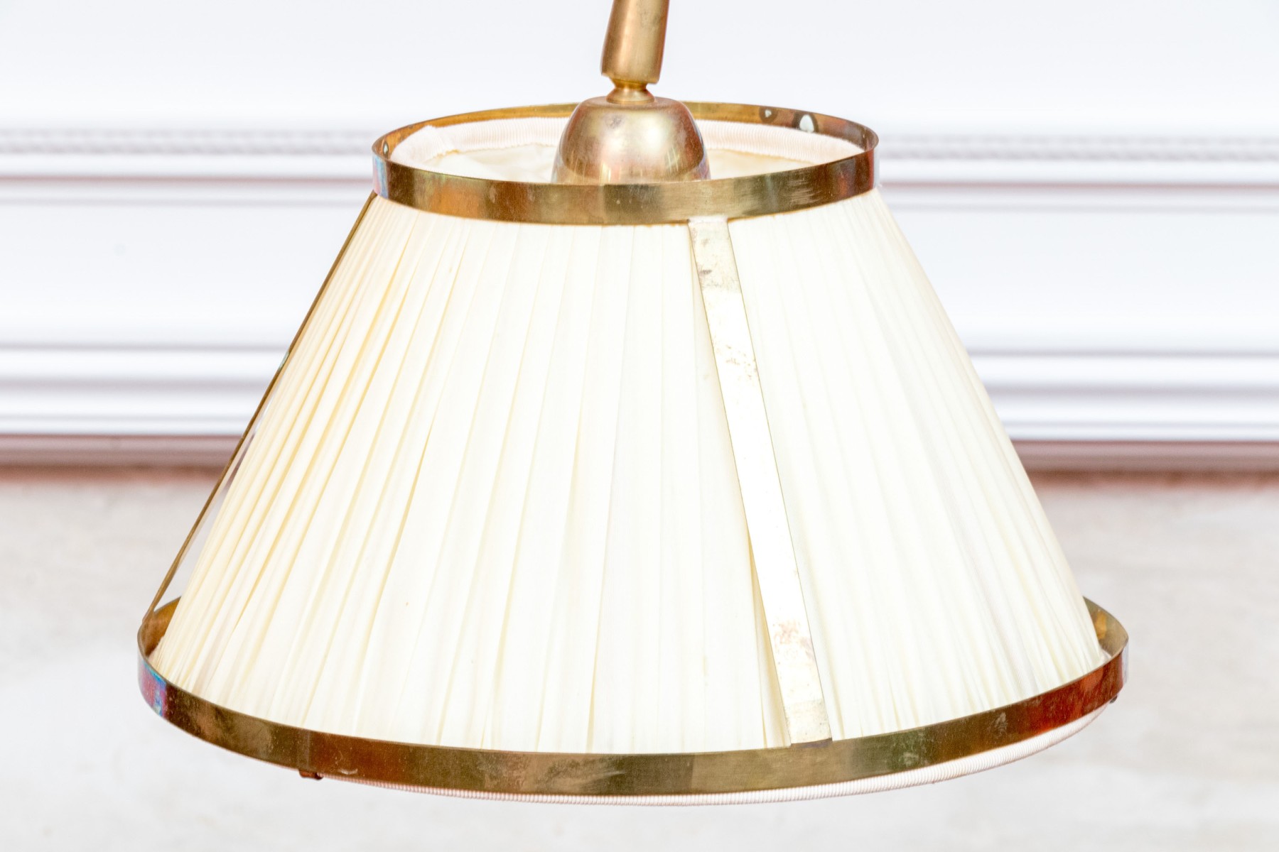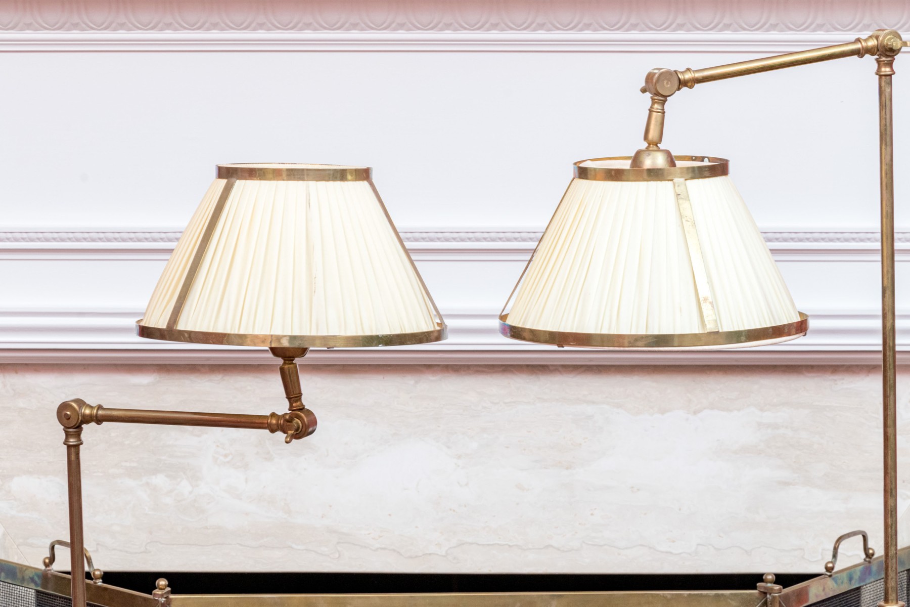The pleated silk shades with brass surrounds, on suspended arms, one from above, the other below.