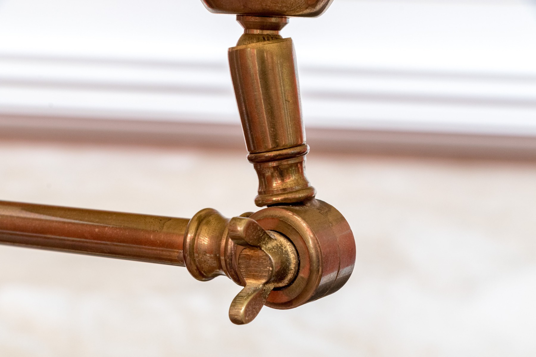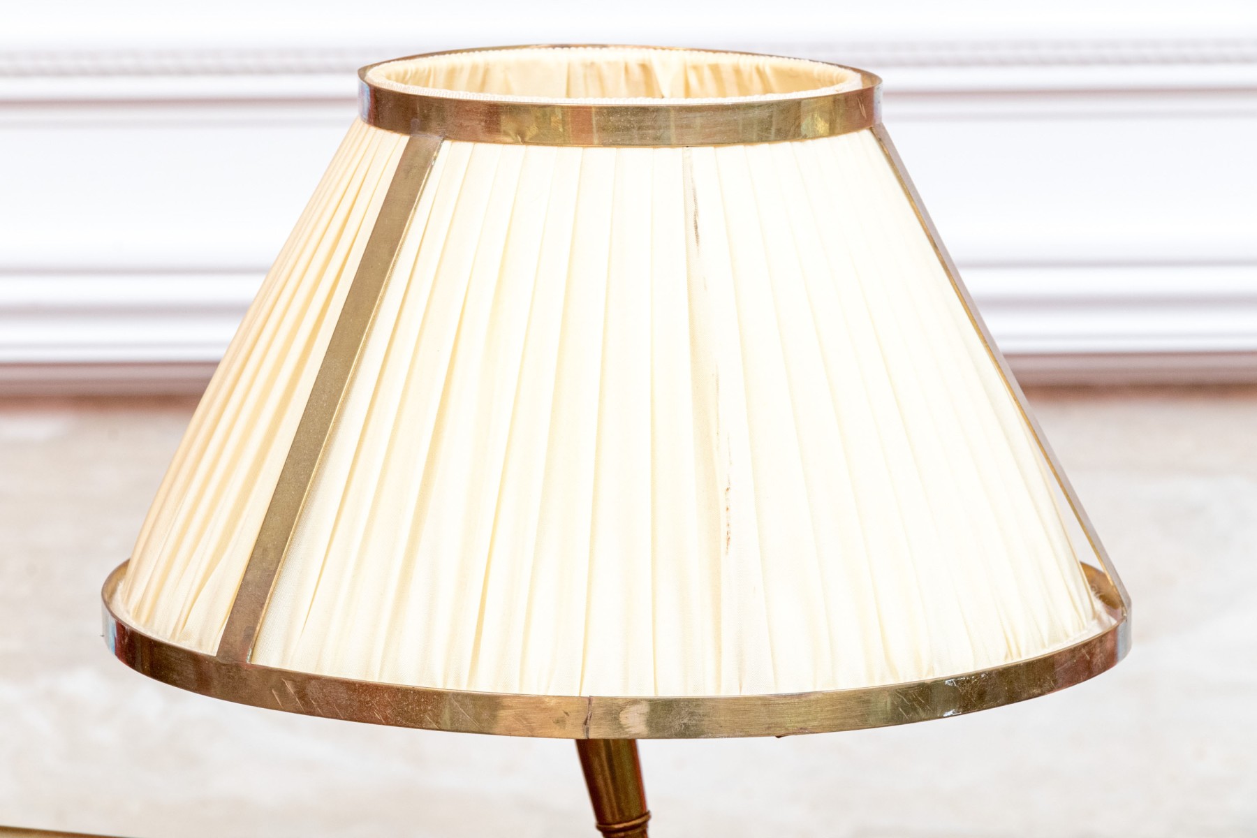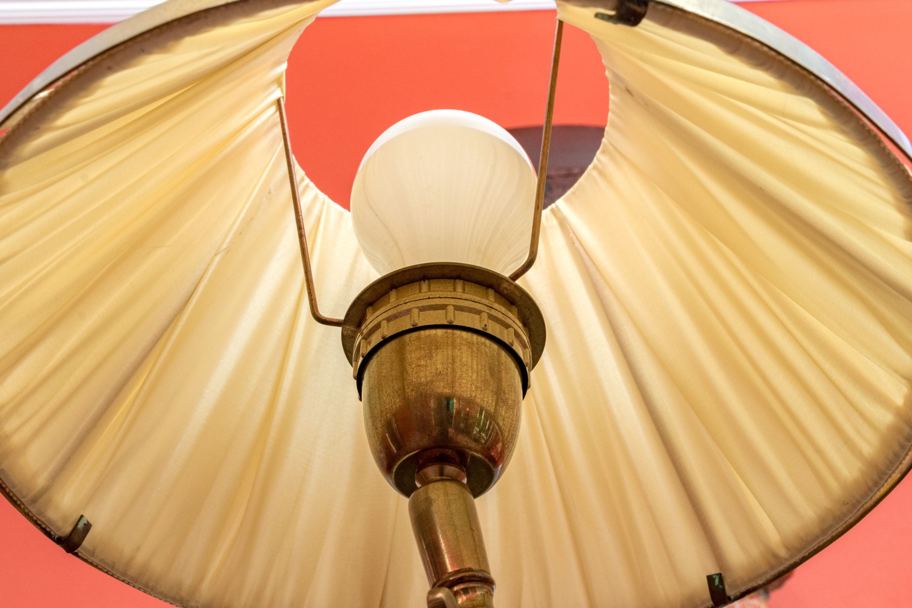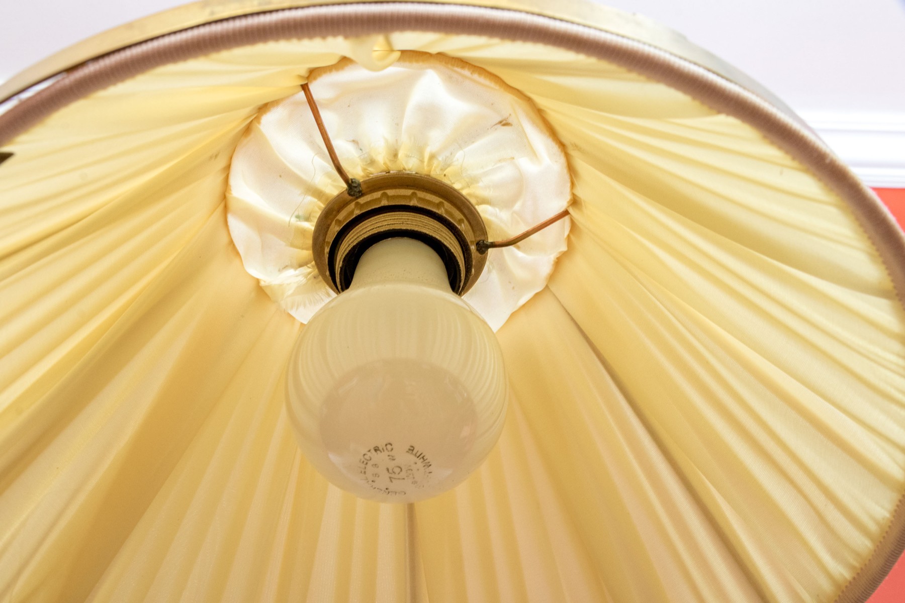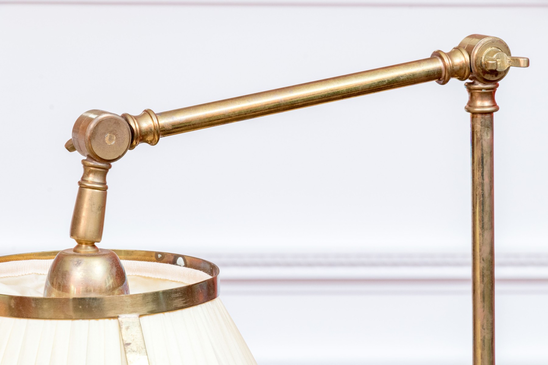 The pleated silk shades with brass surrounds, on suspended arms, one from above, the other below.