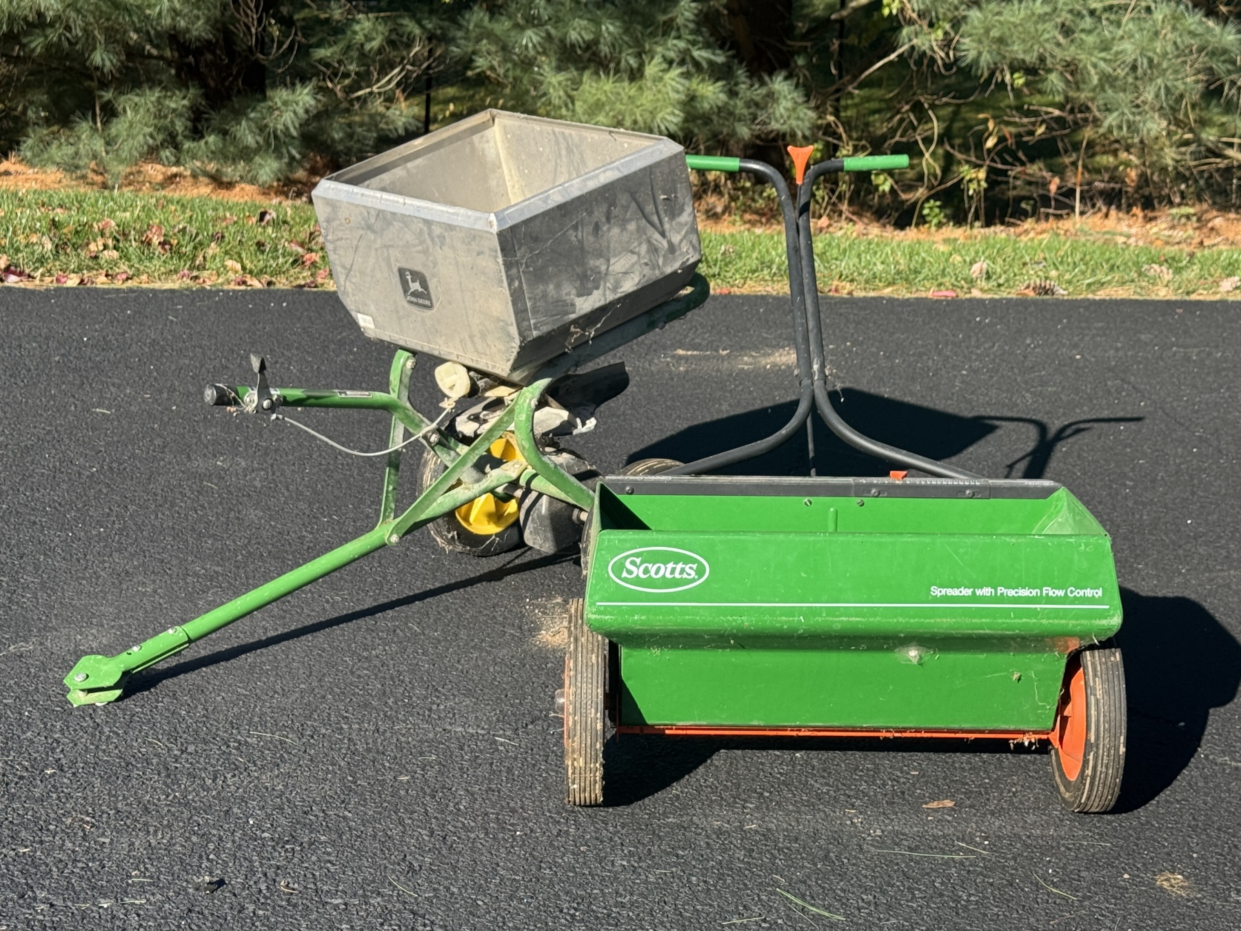 A handy duo of seed spreaders including a John Deere with a gray basin and a tow-behind design, accompanied by a hand pull Scotts spreader in green.