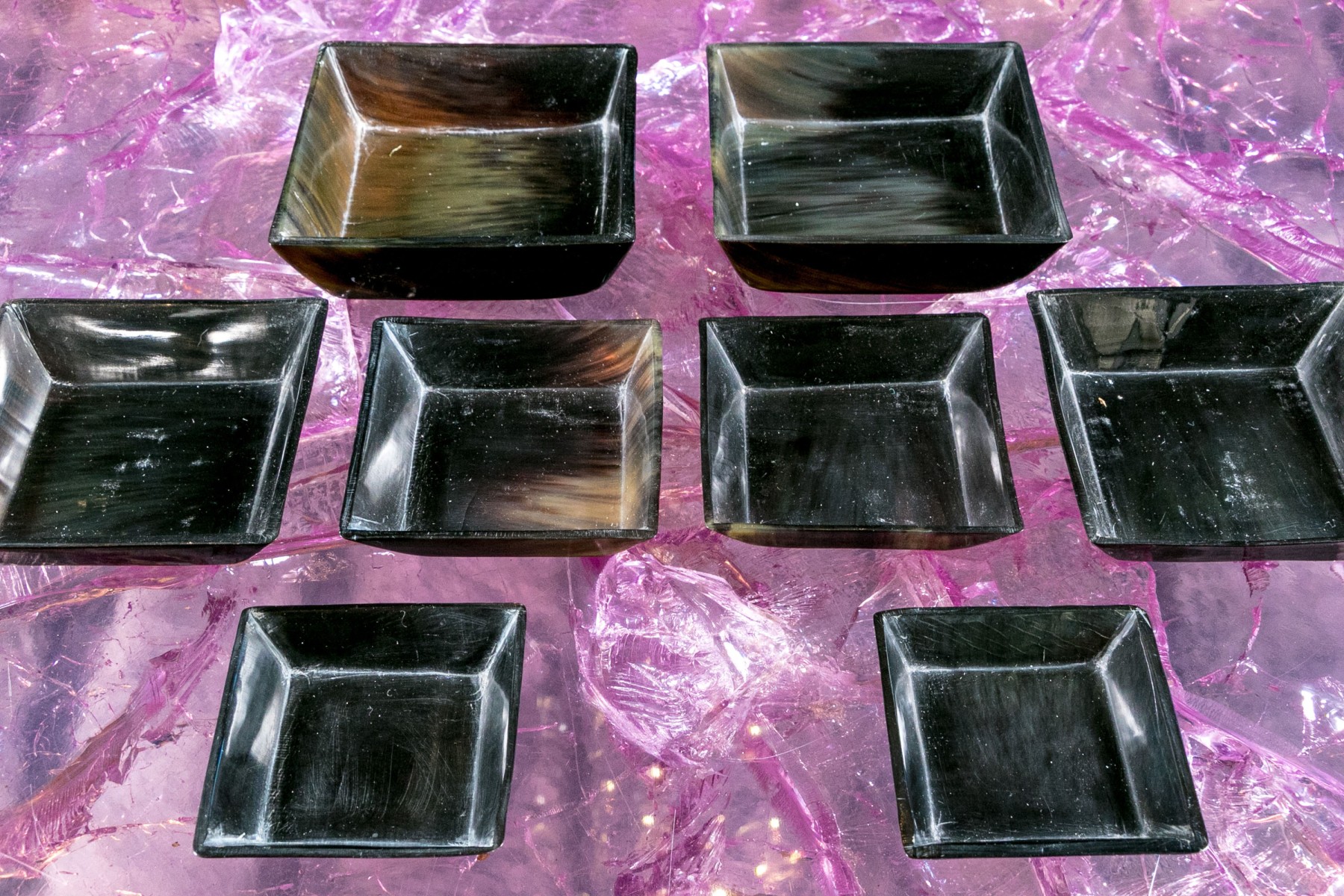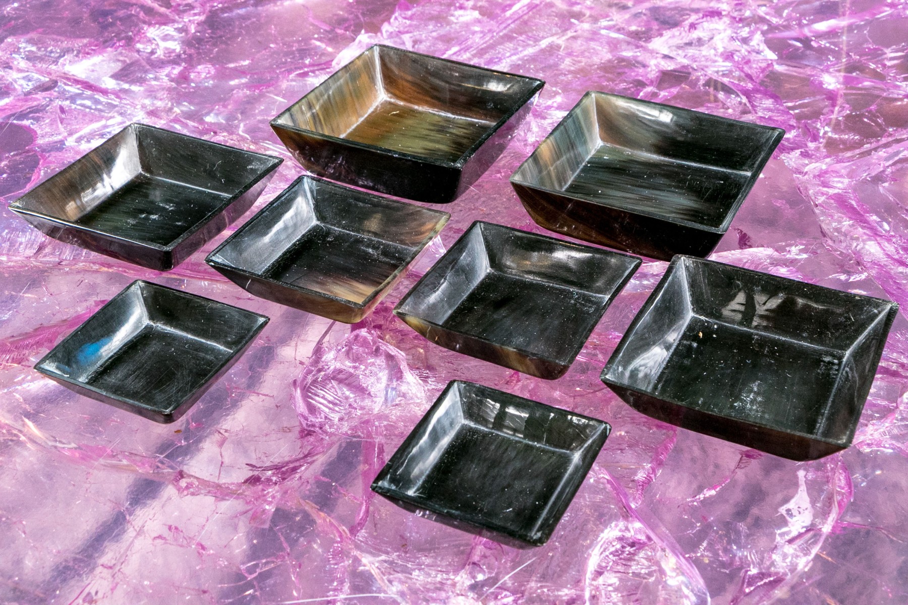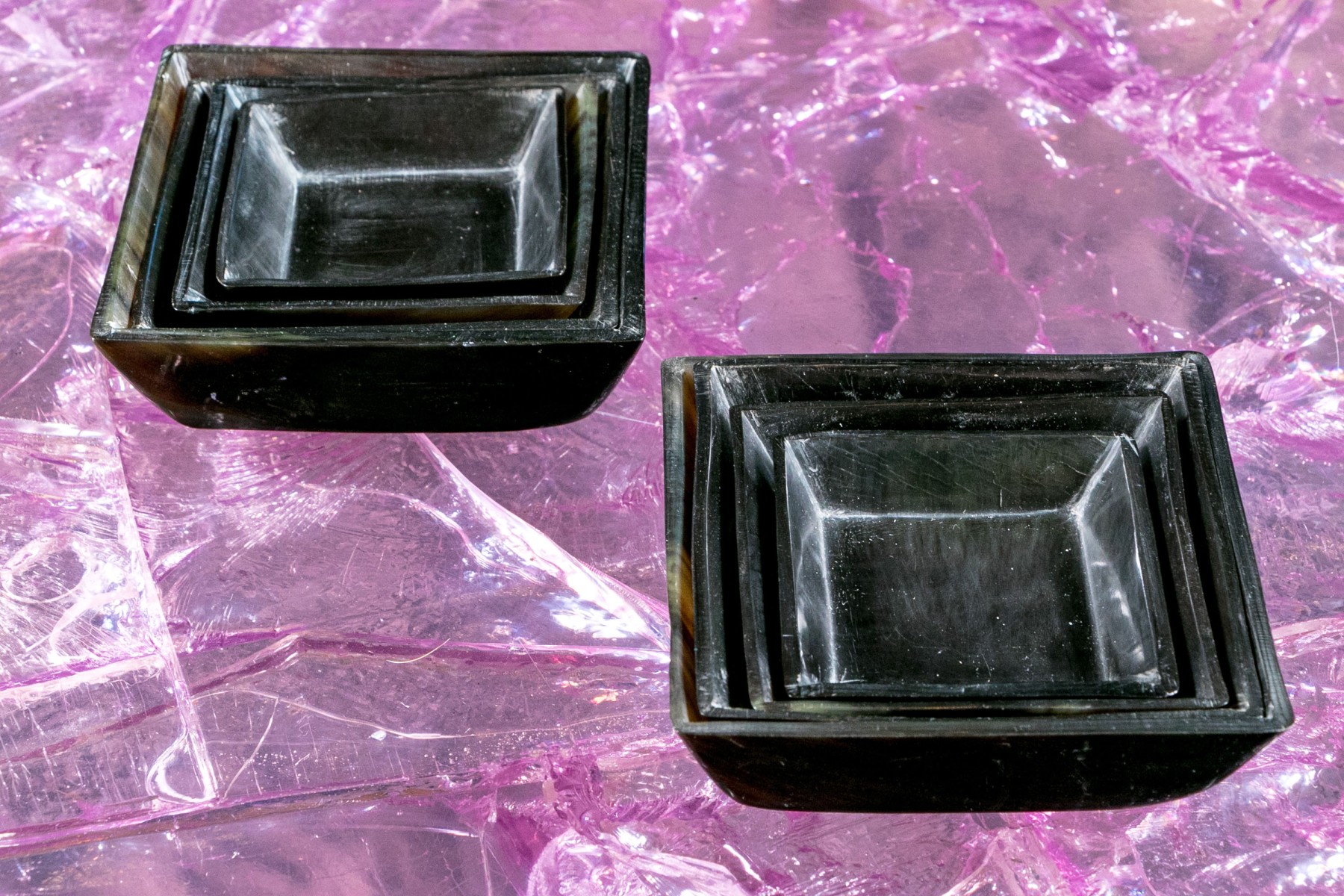Comprised of two sets of four carved horn nesting bowls.