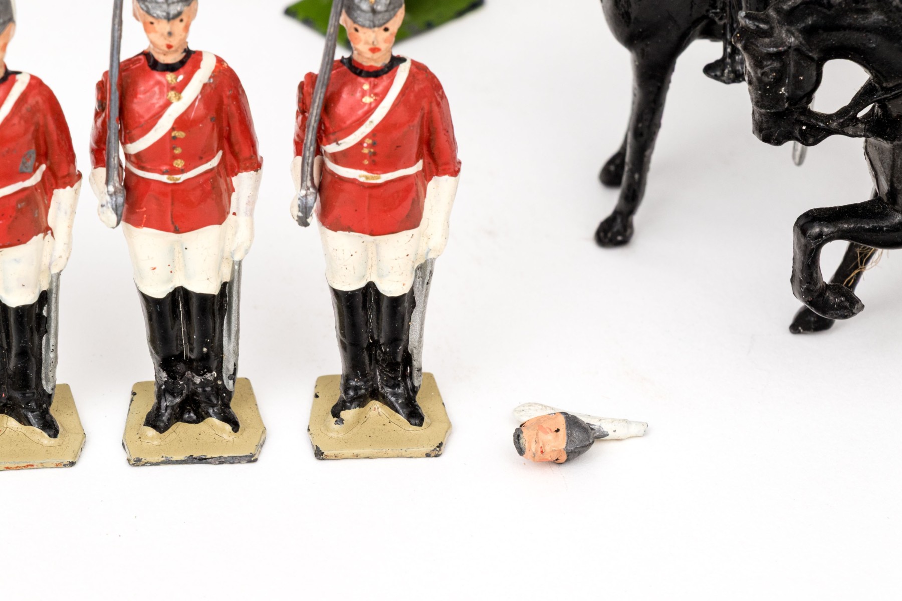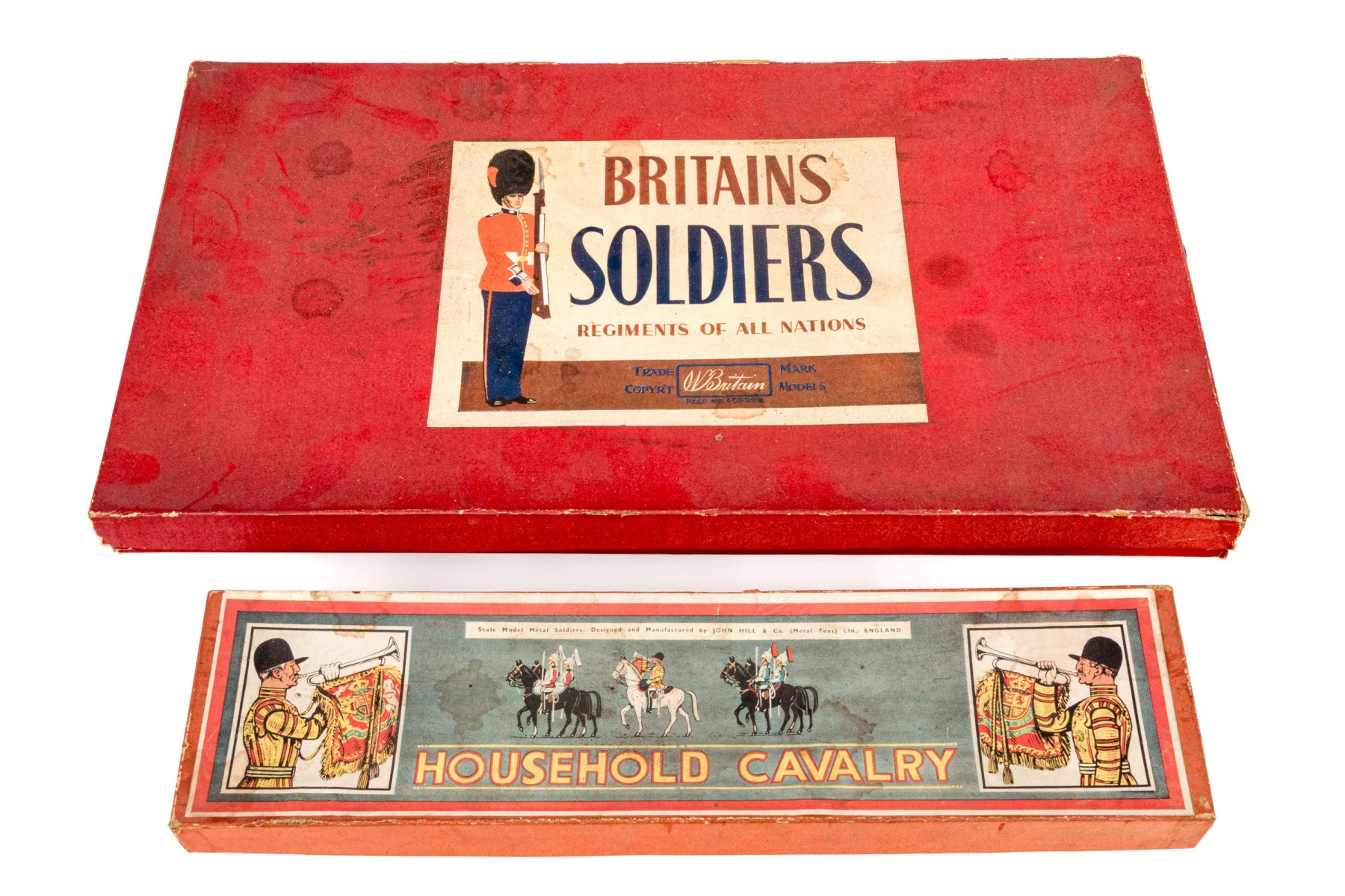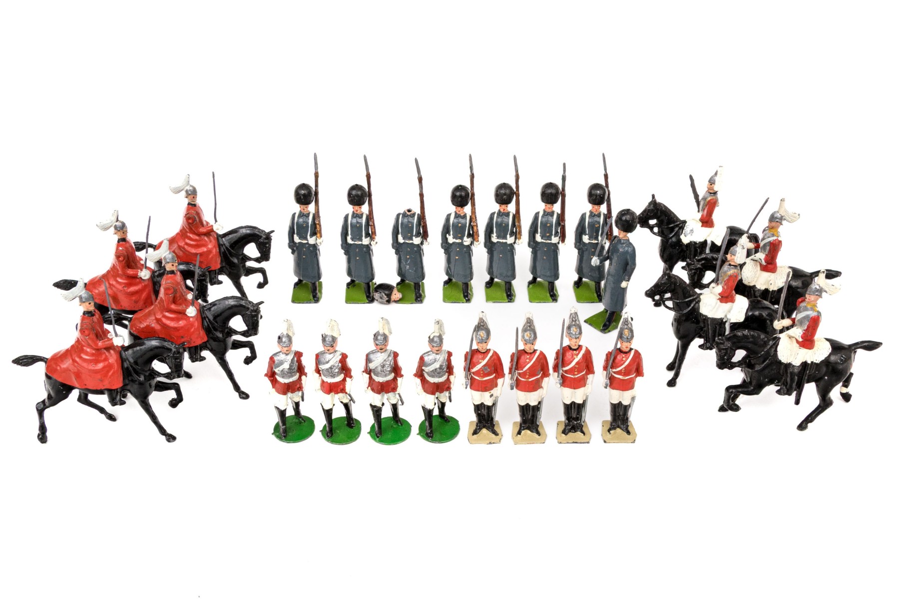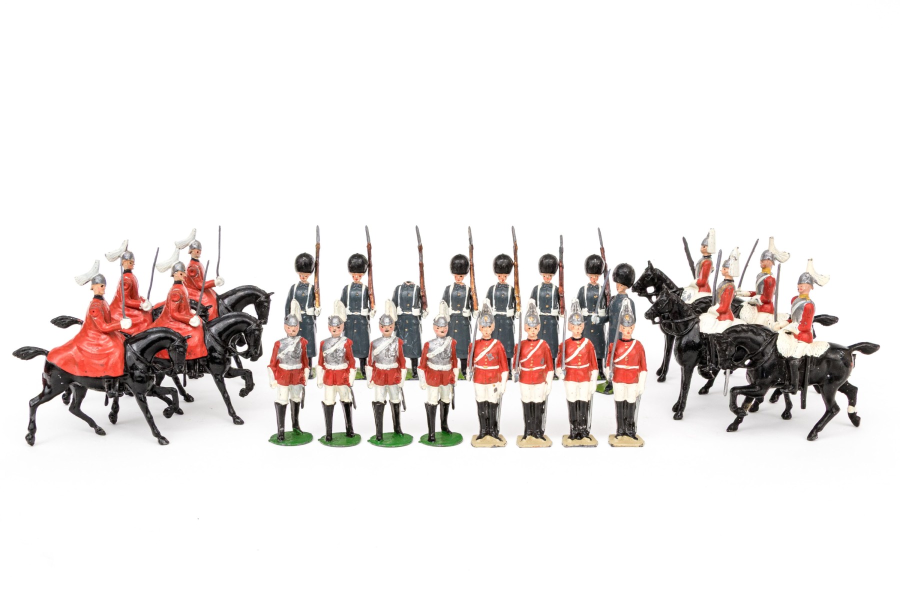 Along with Britain's Soldiers, Regiments of all Nations by W. Britain. A set of four riders on horseback, eight standing soldiers, four of each in red coats, and eight standing in gray long coats (one head is loose but preserved).