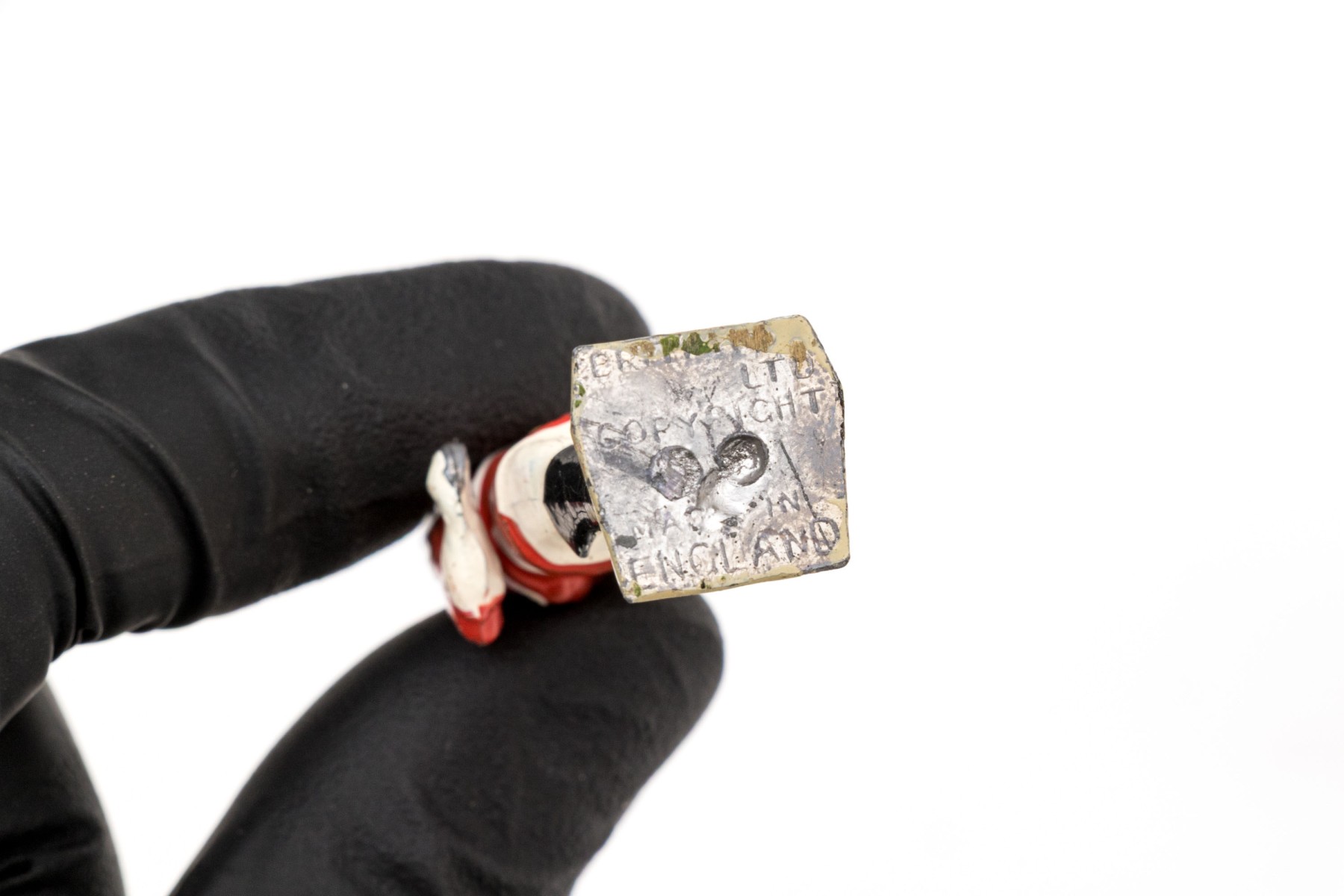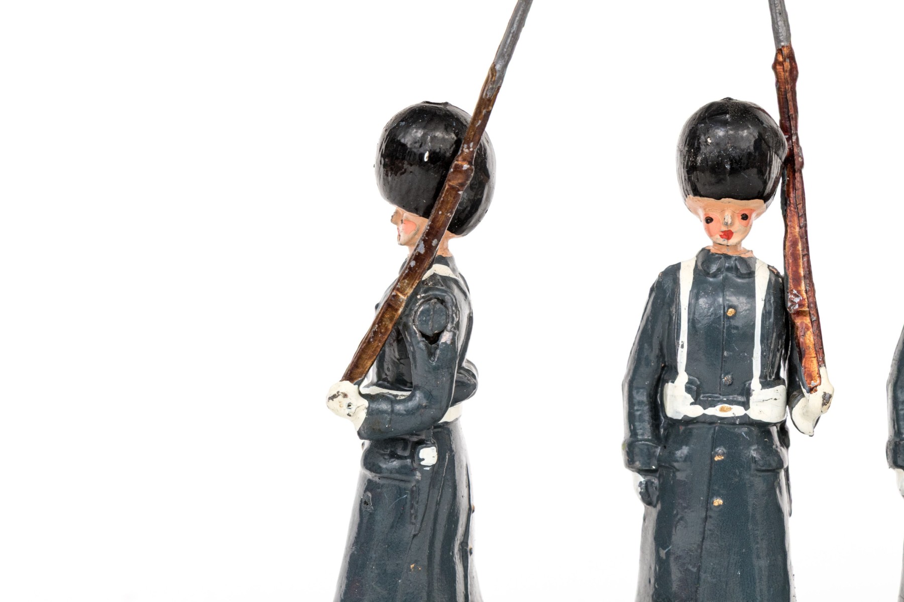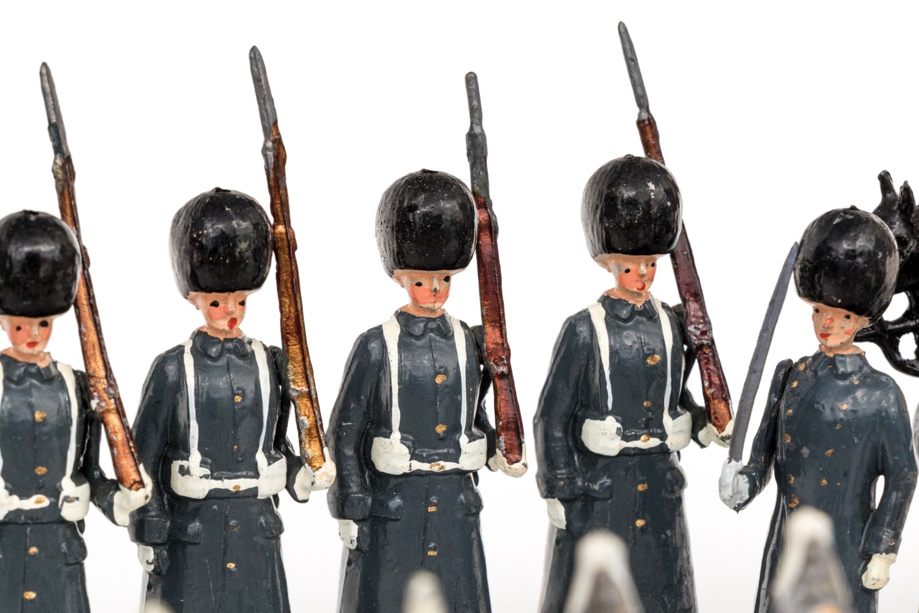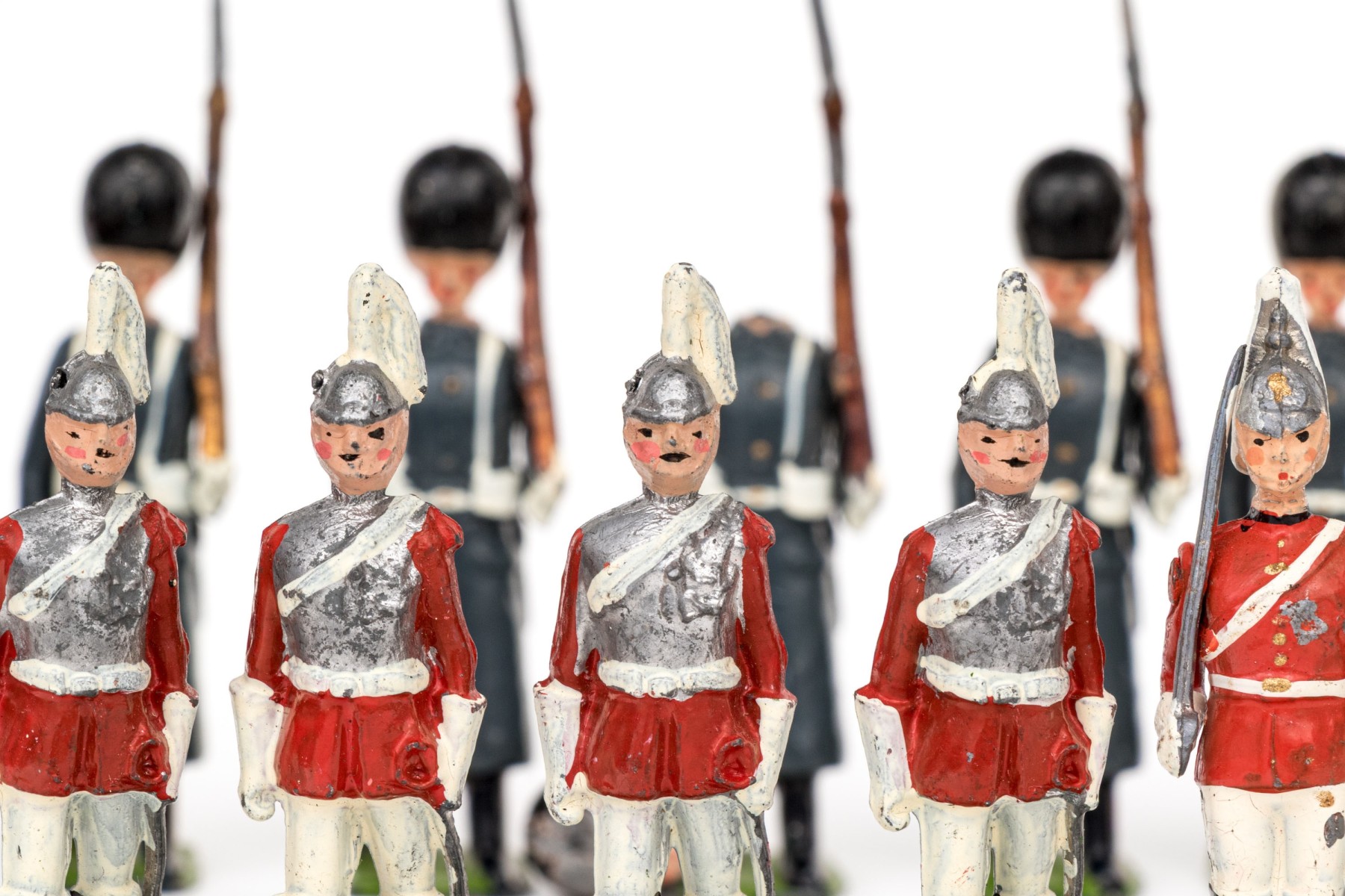 Along with Britain's Soldiers, Regiments of all Nations by W. Britain. A set of four riders on horseback, eight standing soldiers, four of each in red coats, and eight standing in gray long coats (one head is loose but preserved).