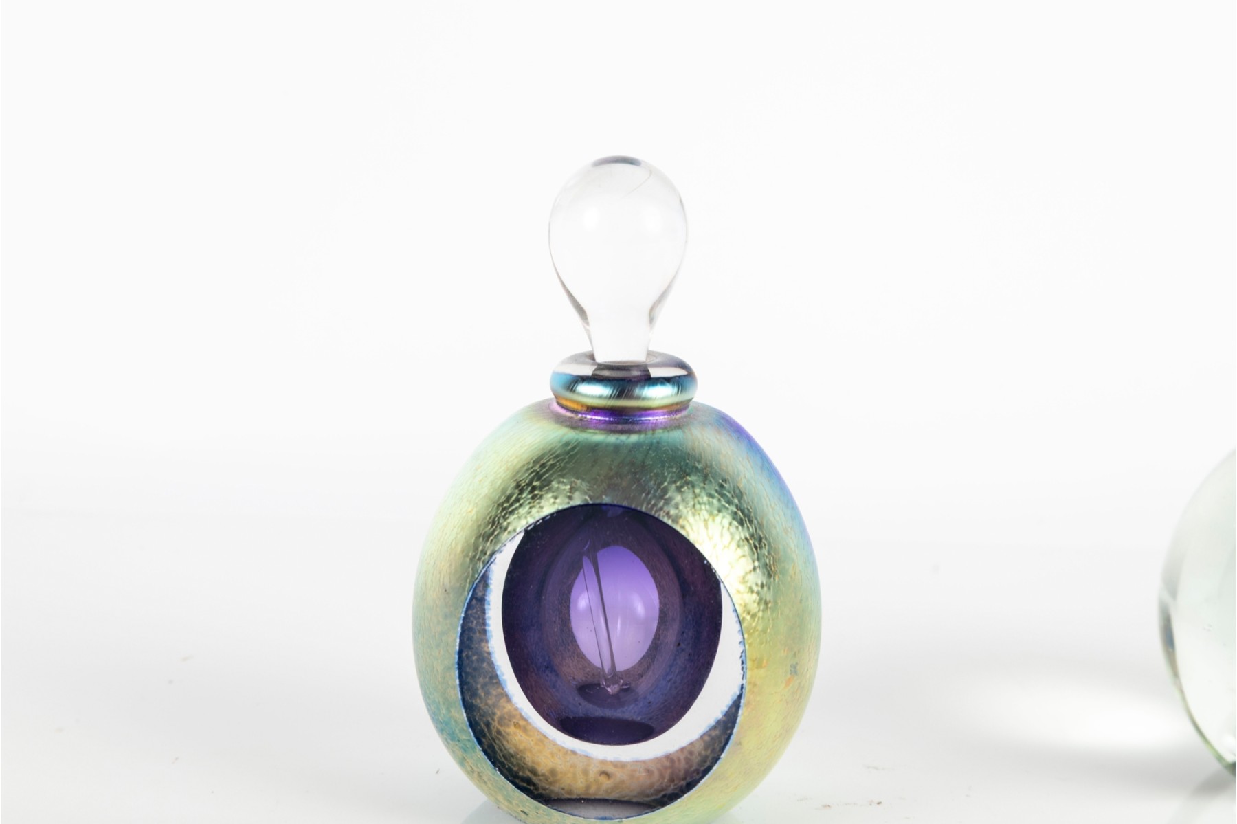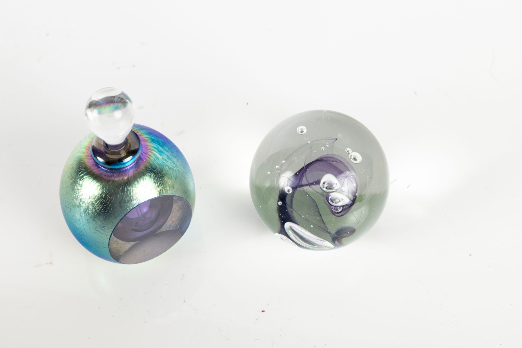 Pair of colorful art glass paperweights, each signed by the artist, with one designed with a lidded core complete with stopper. Review photos for signatures.