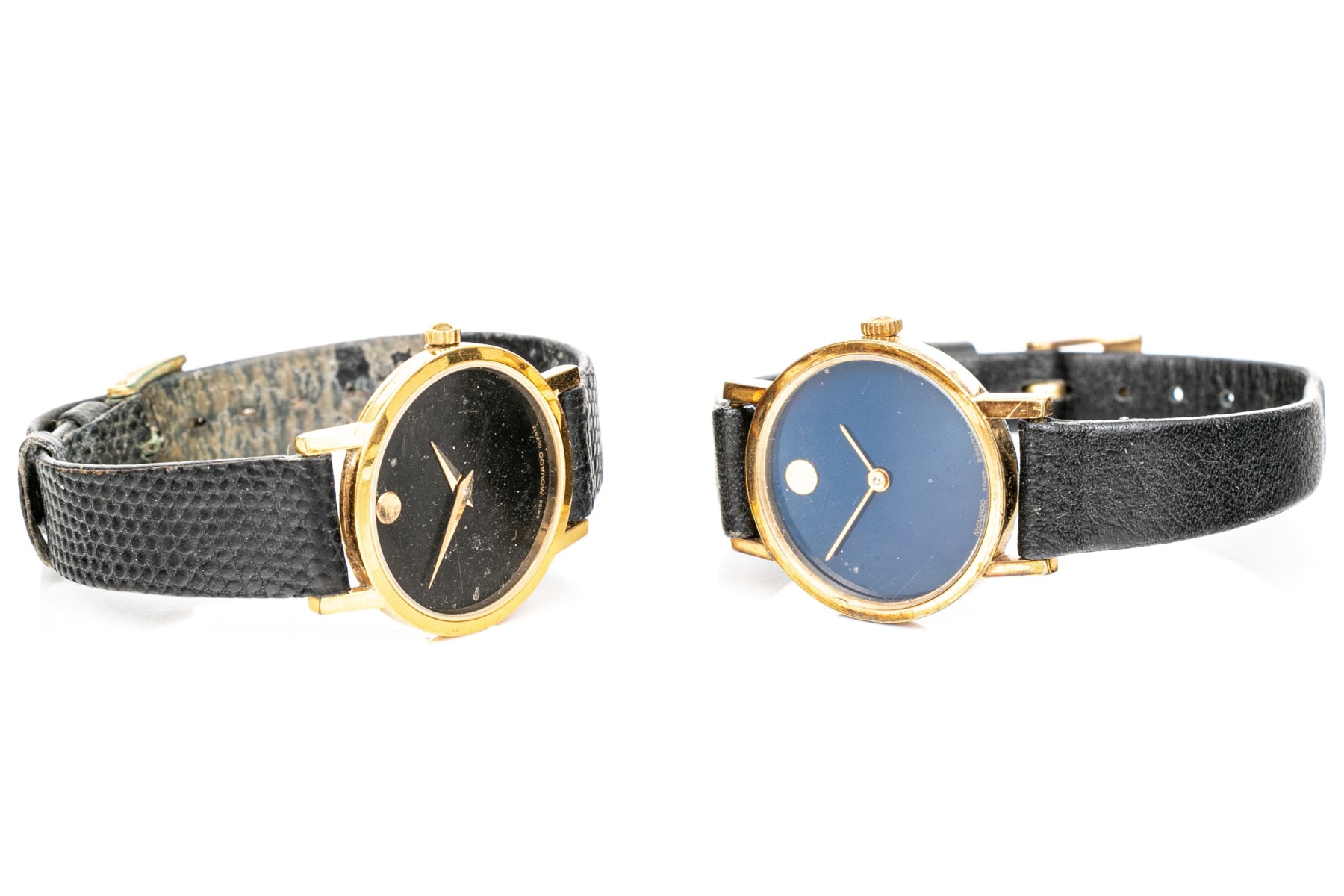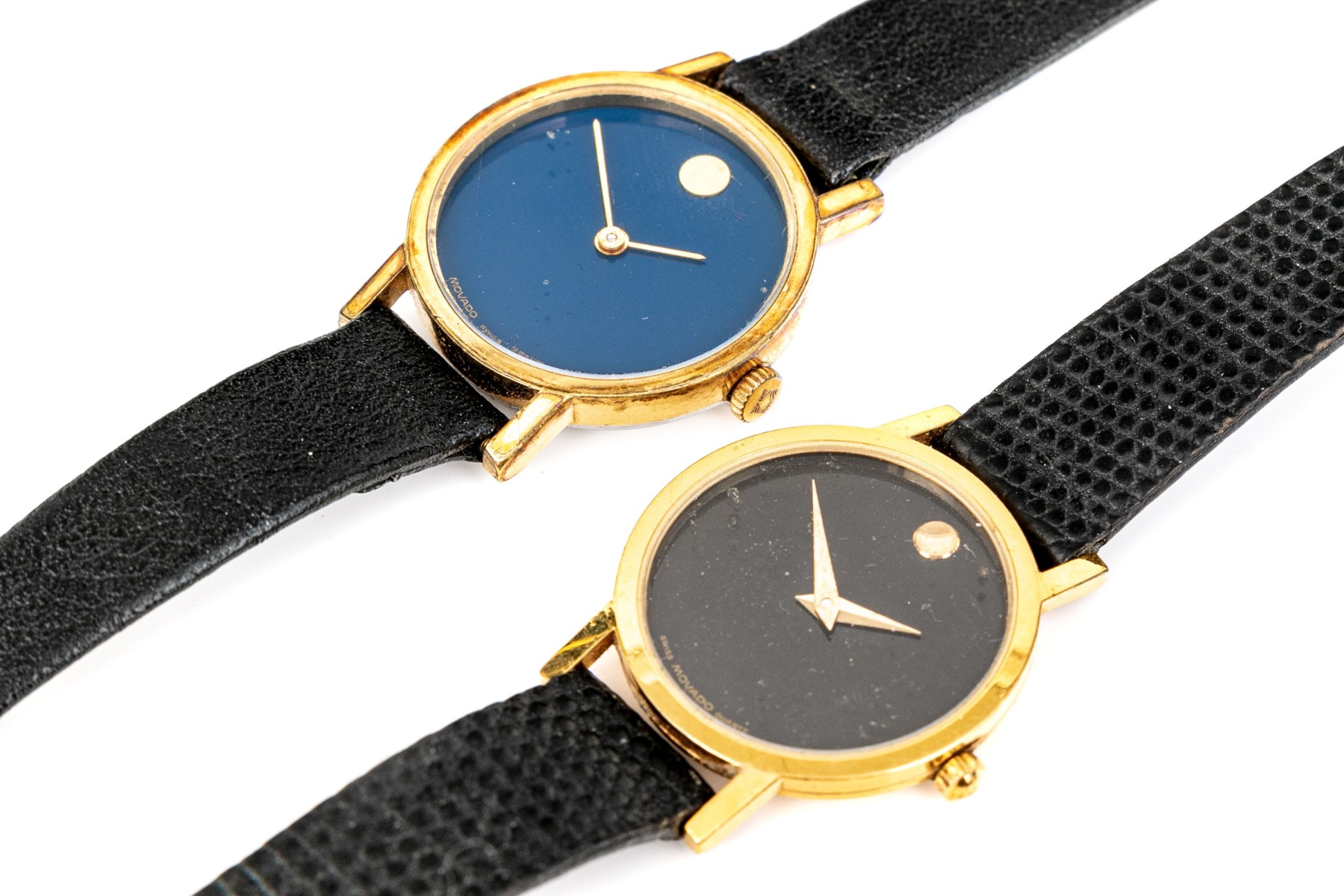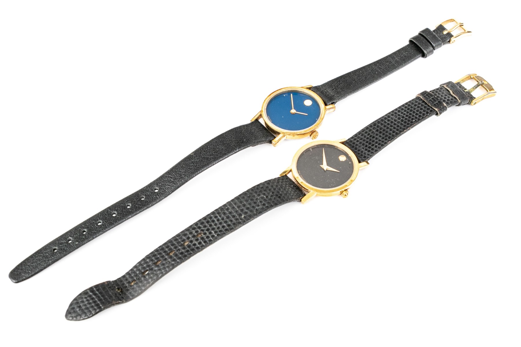 Two simple Movado quartz watches with round dials, one black the other blue. Single dot indices at the 12 position, centered hour and minute hands. Black leather straps with buckle clasps.
