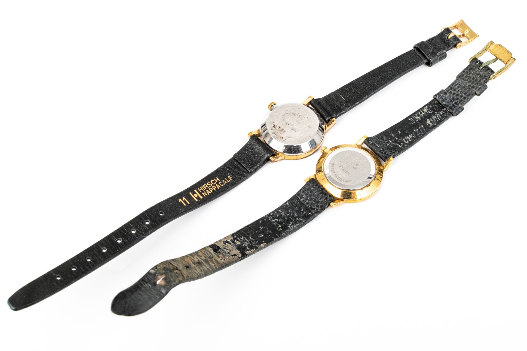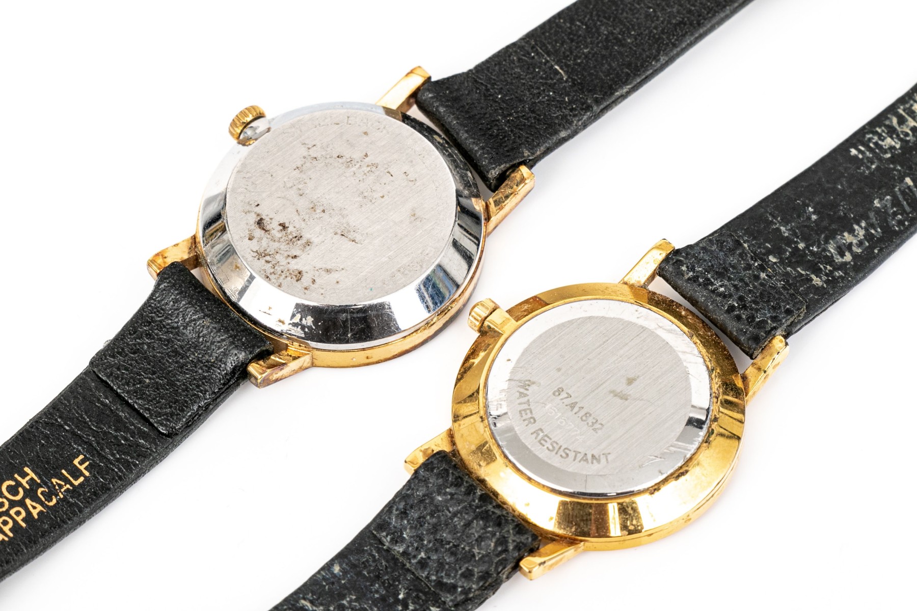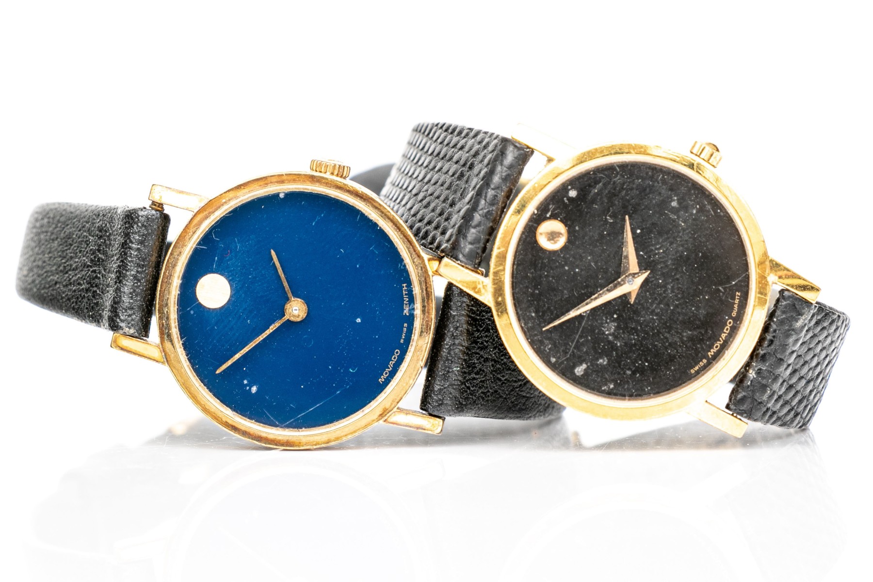 Two simple Movado quartz watches with round dials, one black the other blue. Single dot indices at the 12 position, centered hour and minute hands. Black leather straps with buckle clasps.