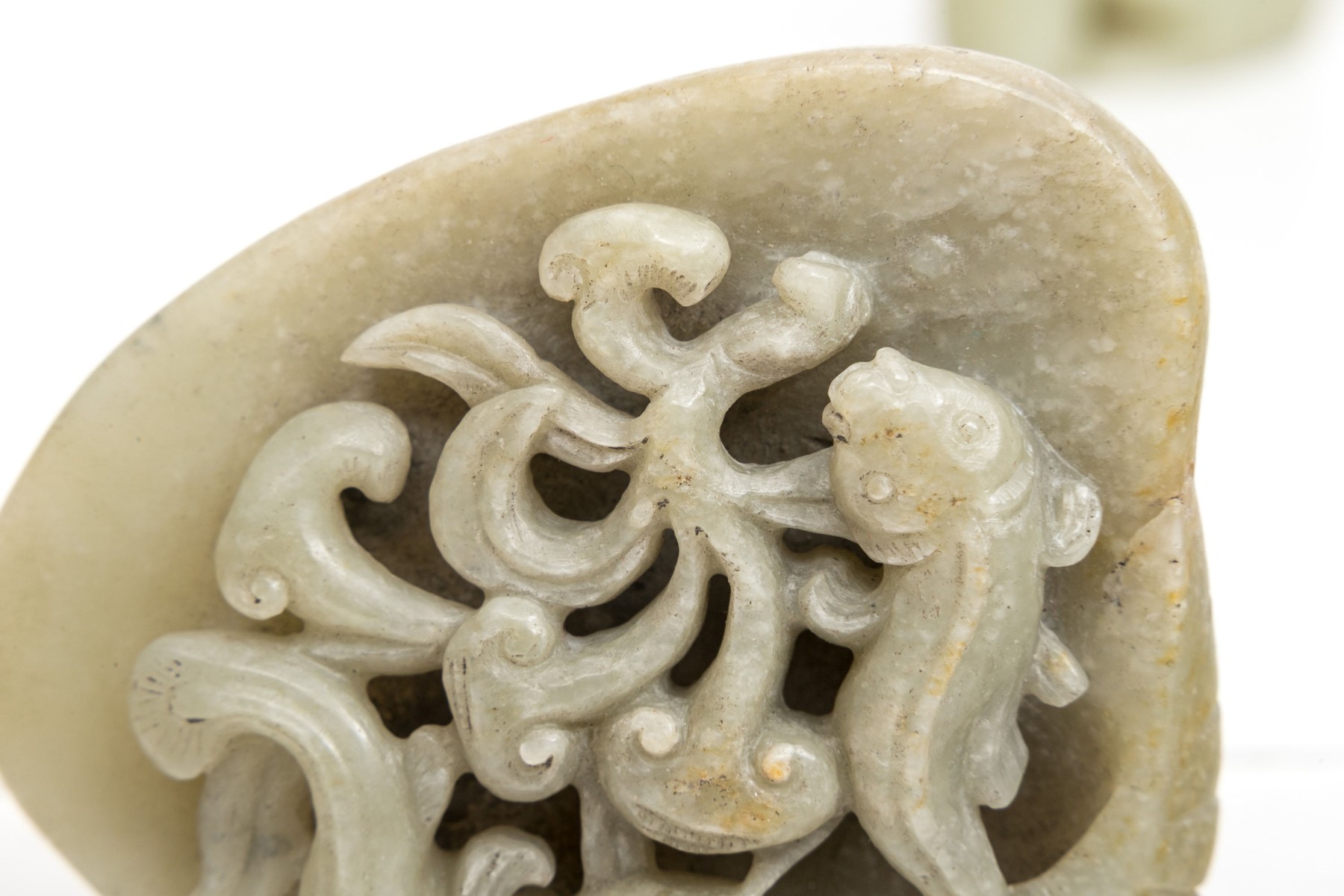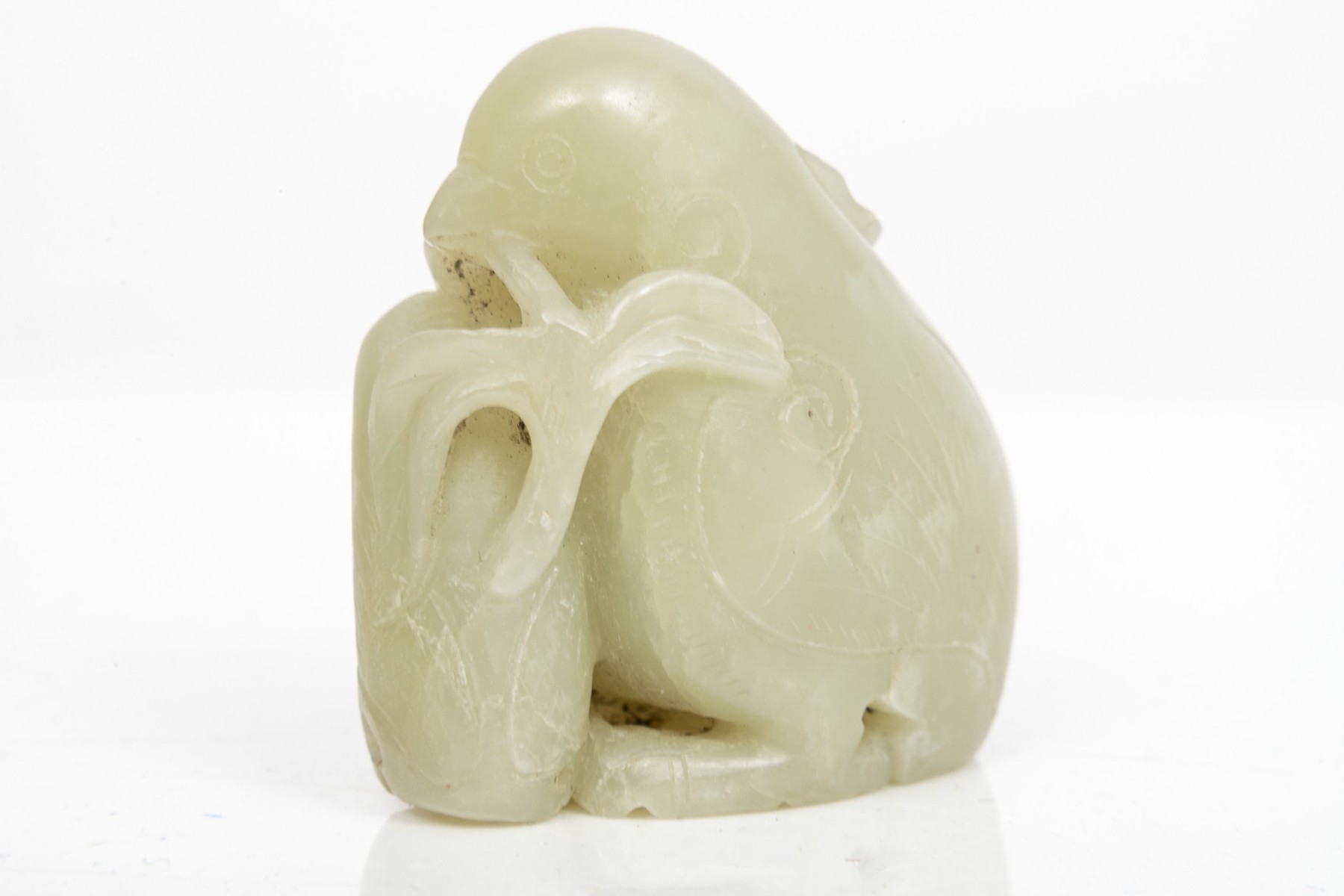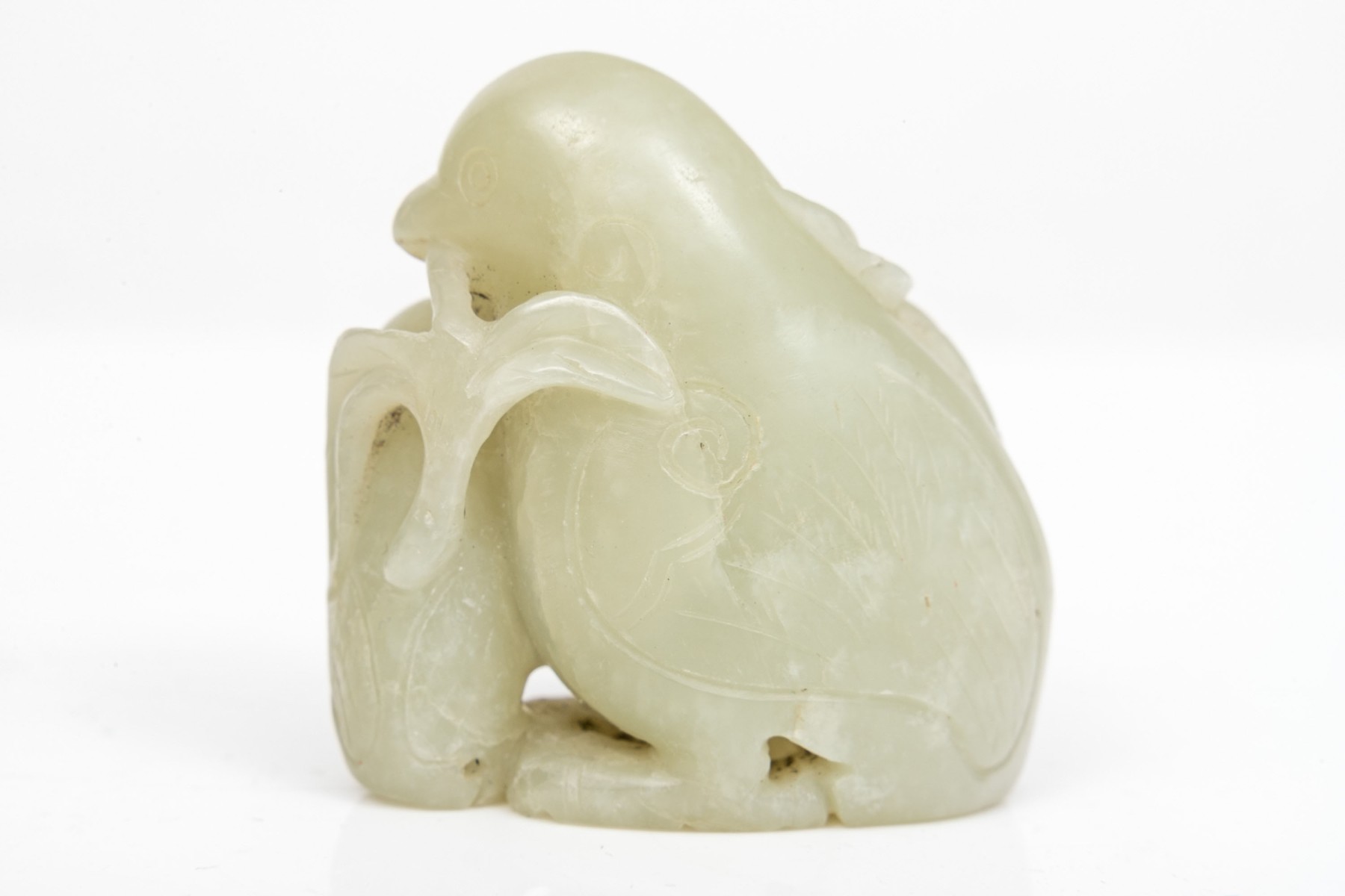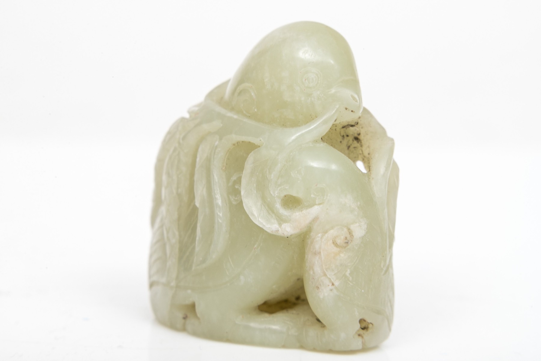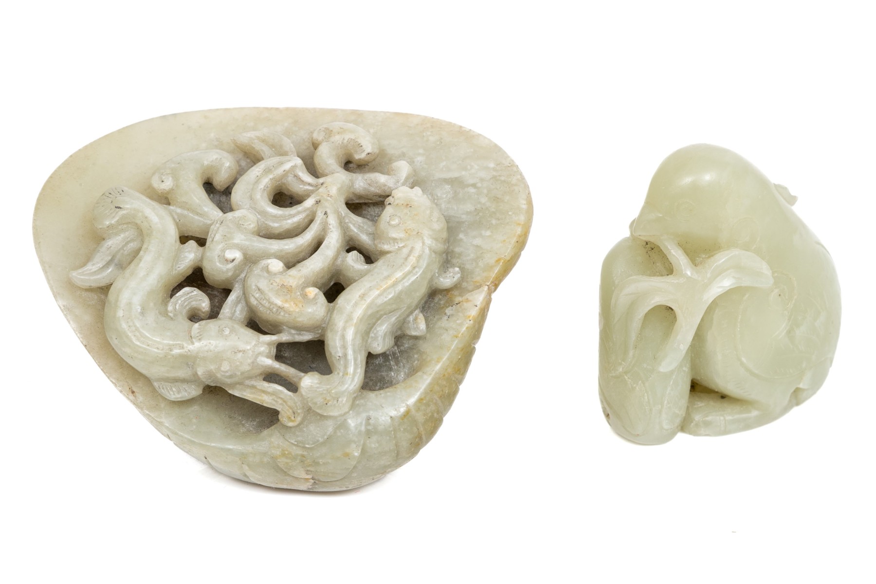 Two carved serpentine stones. These stones have a soft green color are feature a seated bird and the larger with a fish scene.