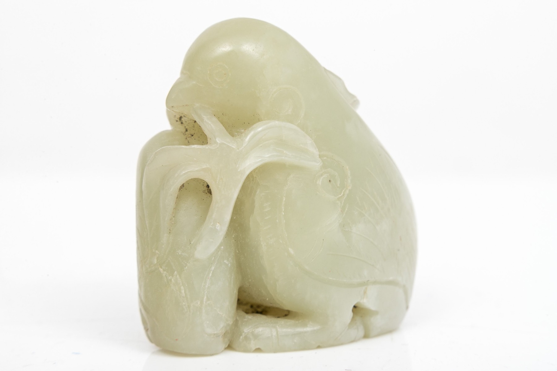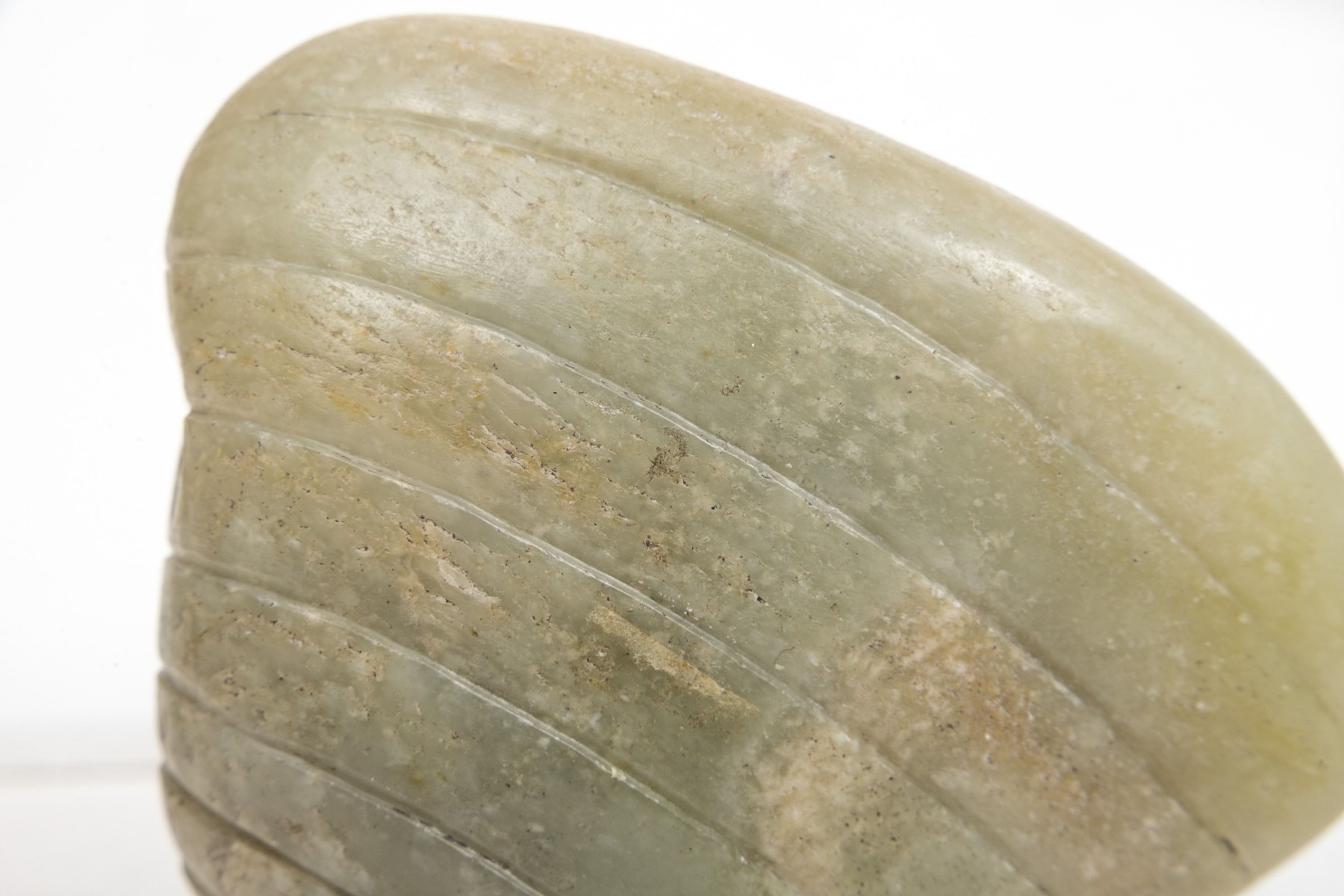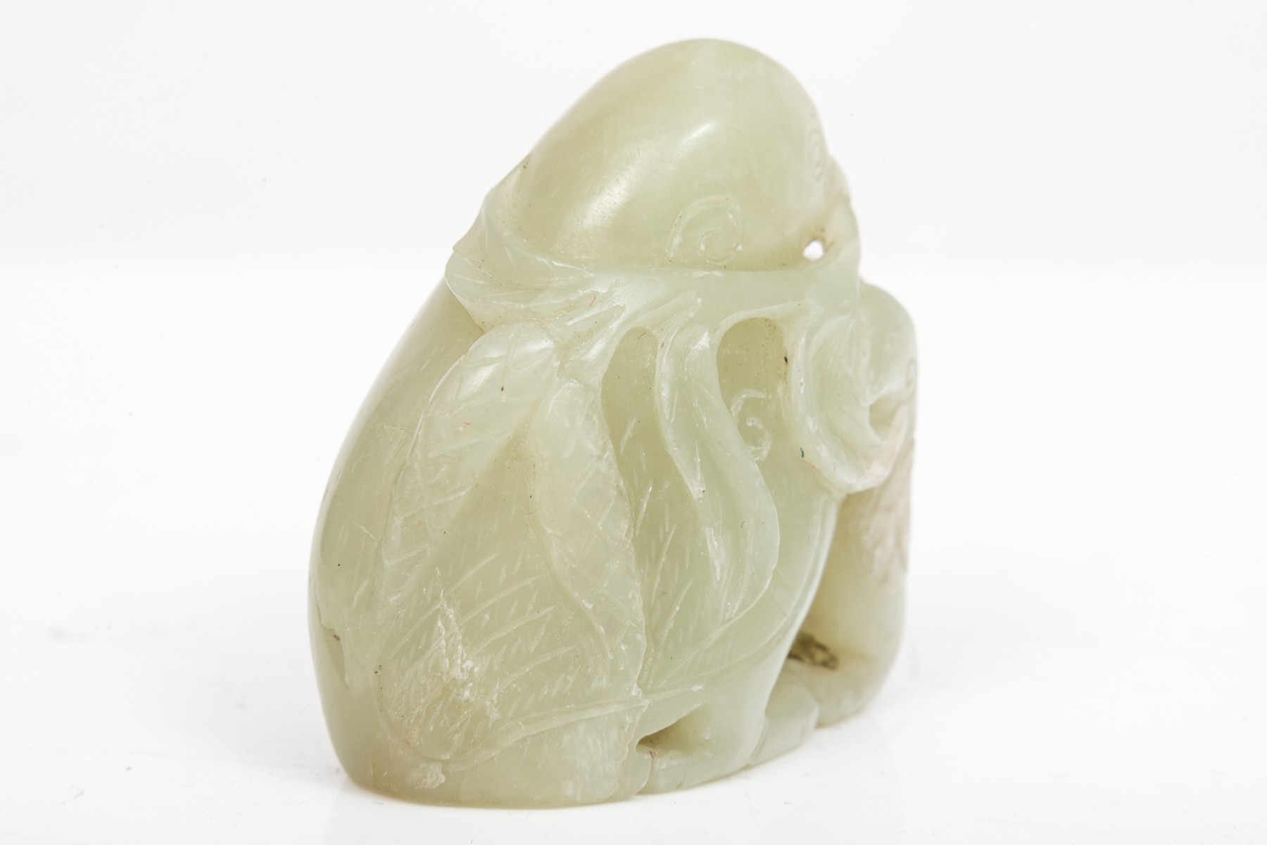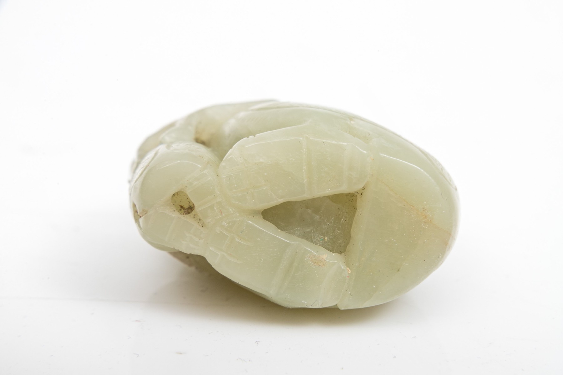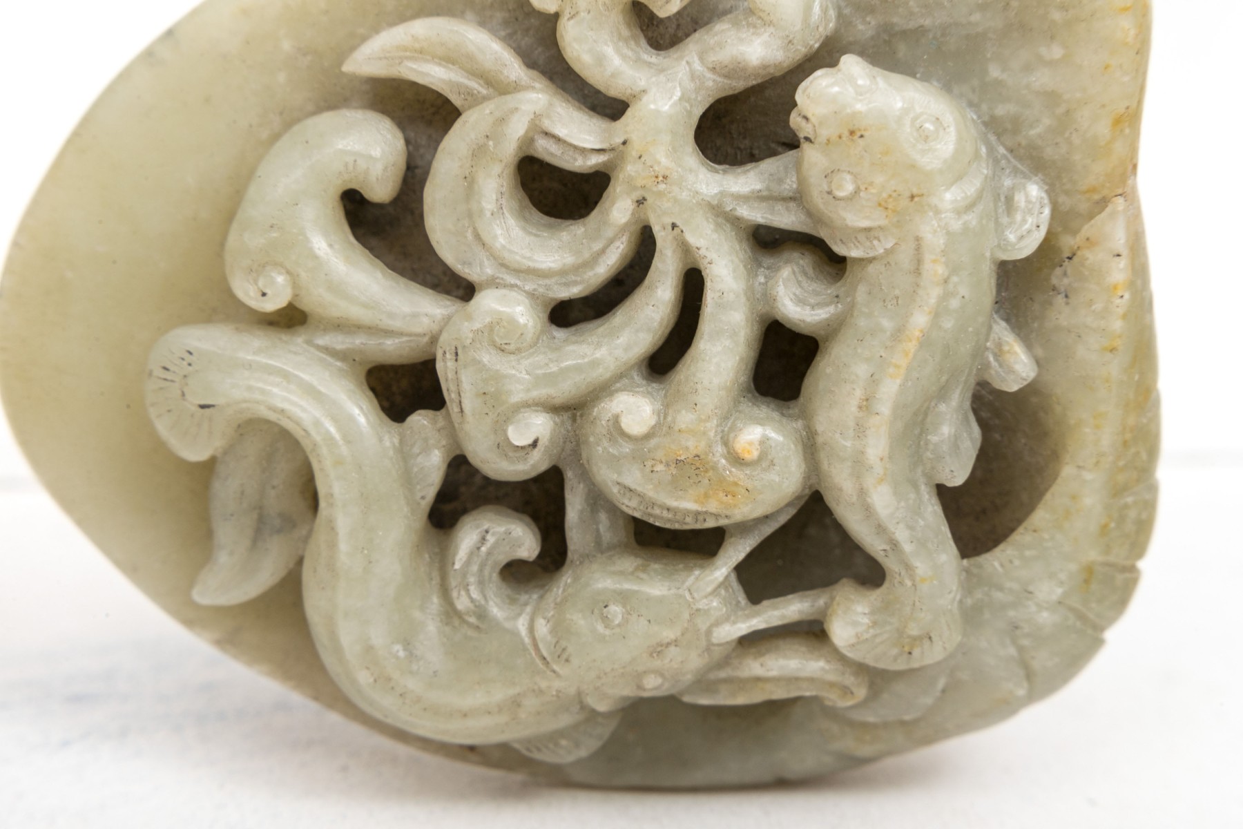 Two carved serpentine stones. These stones have a soft green color are feature a seated bird and the larger with a fish scene.