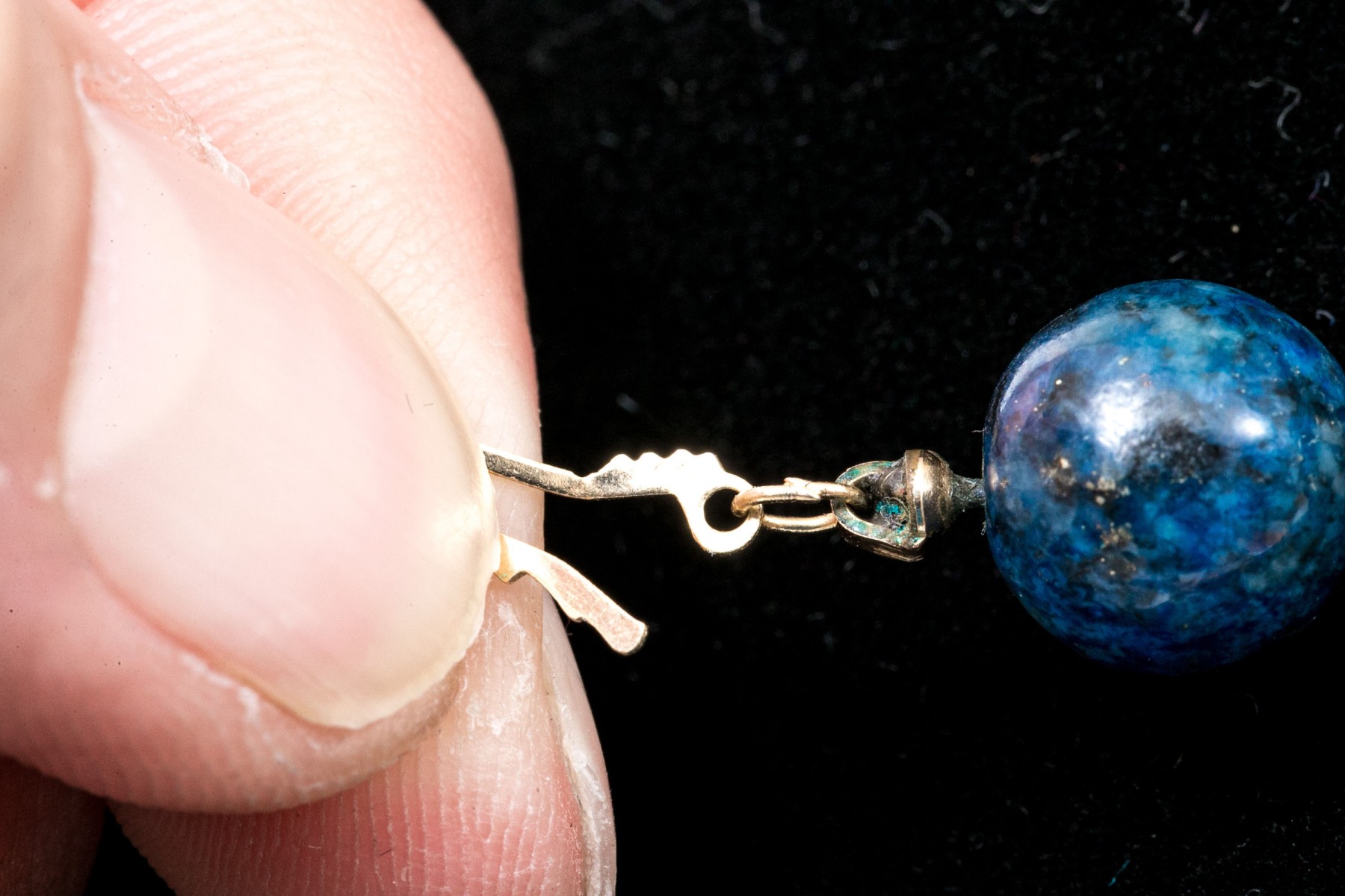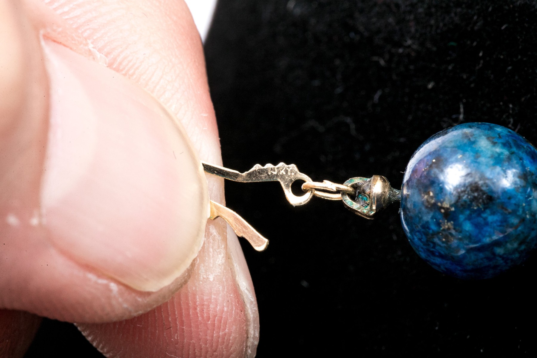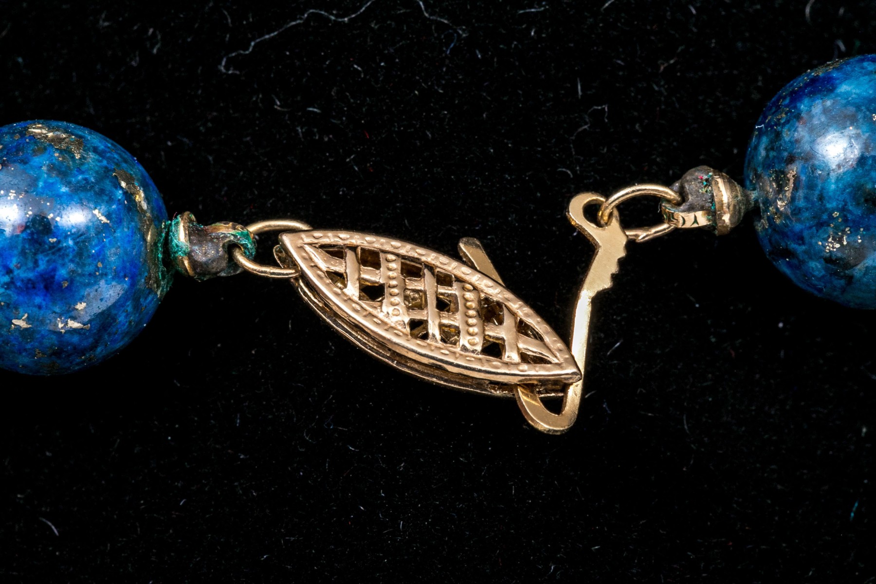 Condition: Clasp on the blue beaded necklace is bent.
