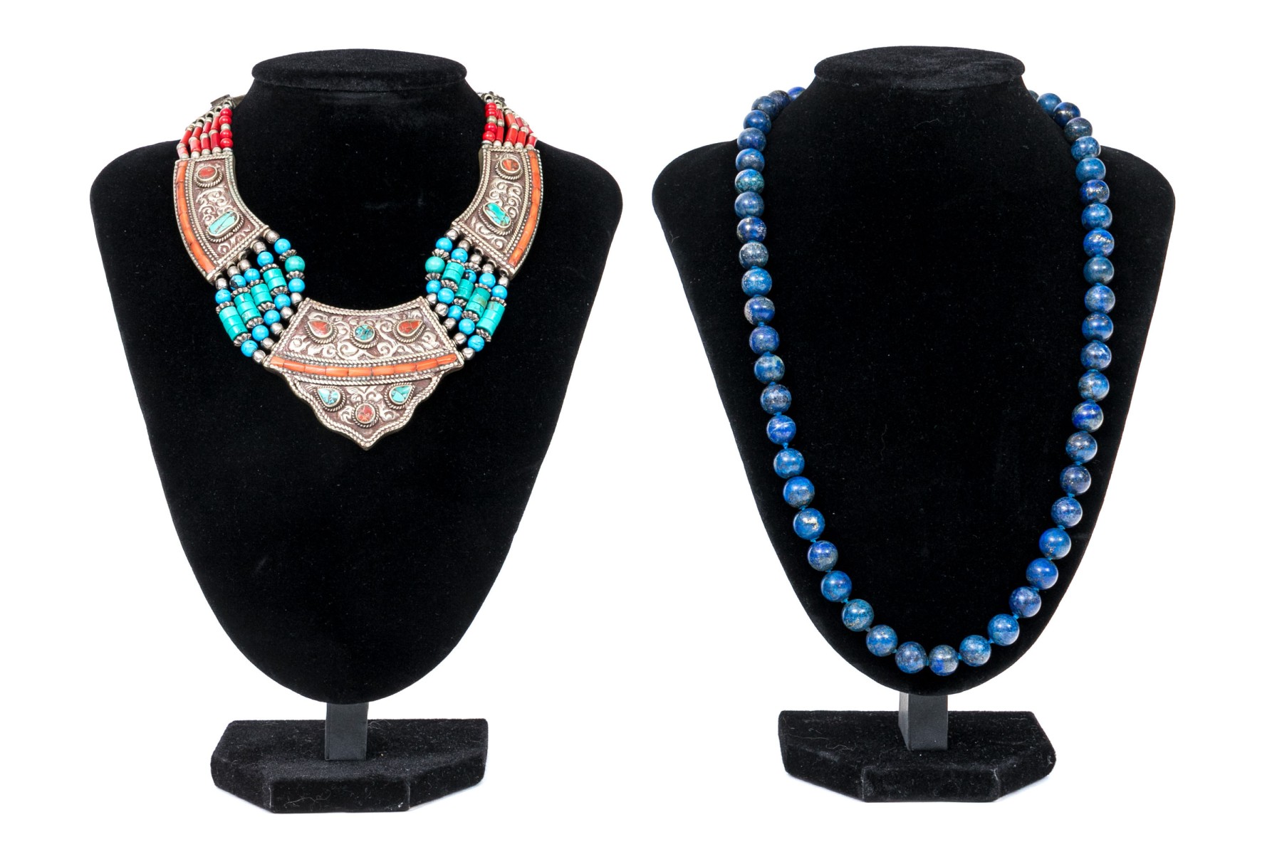 Dimensions: 23" L x 3/8" W-Blue Beaded Necklace, 15" L x 2" W-Multi-Stone Necklace