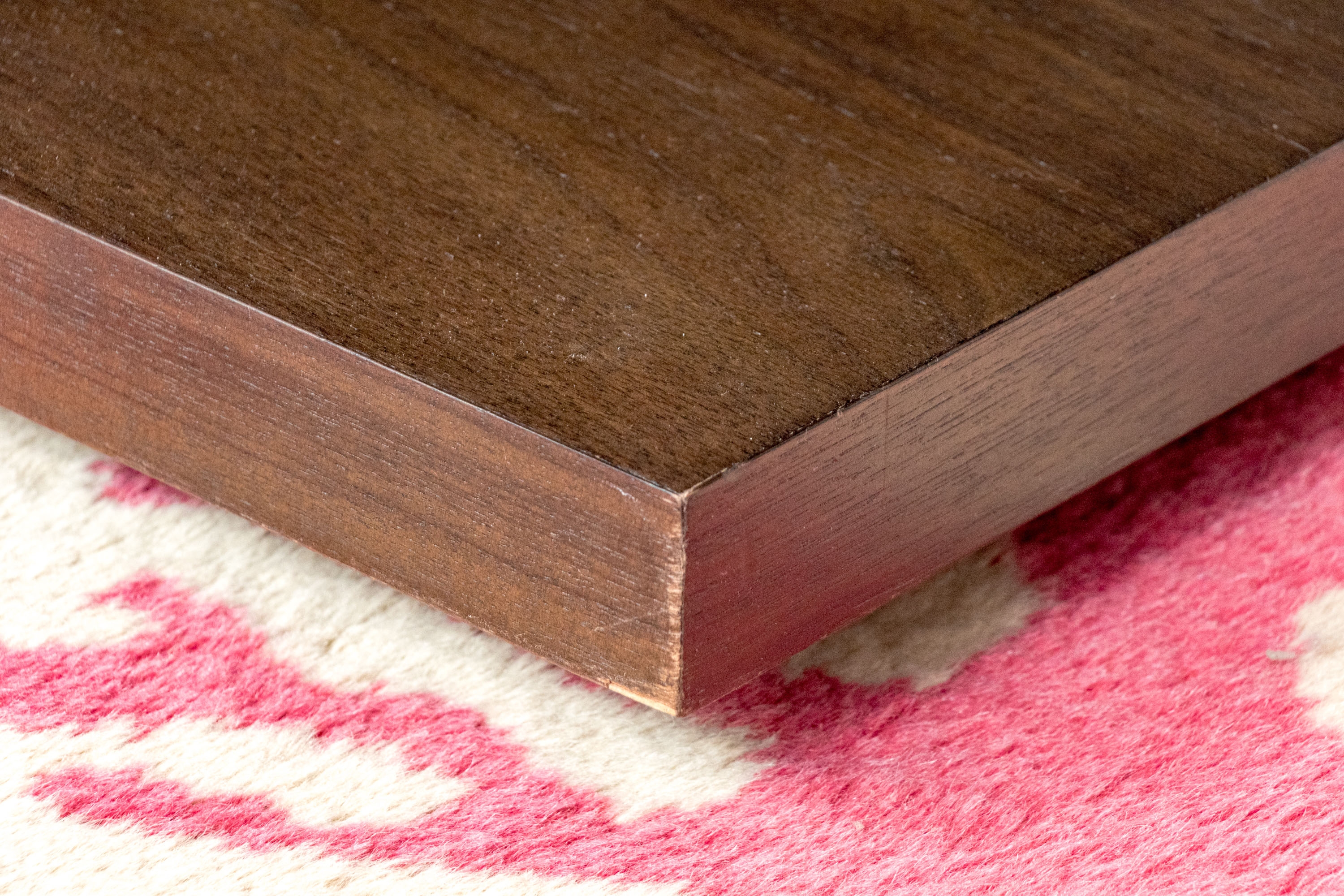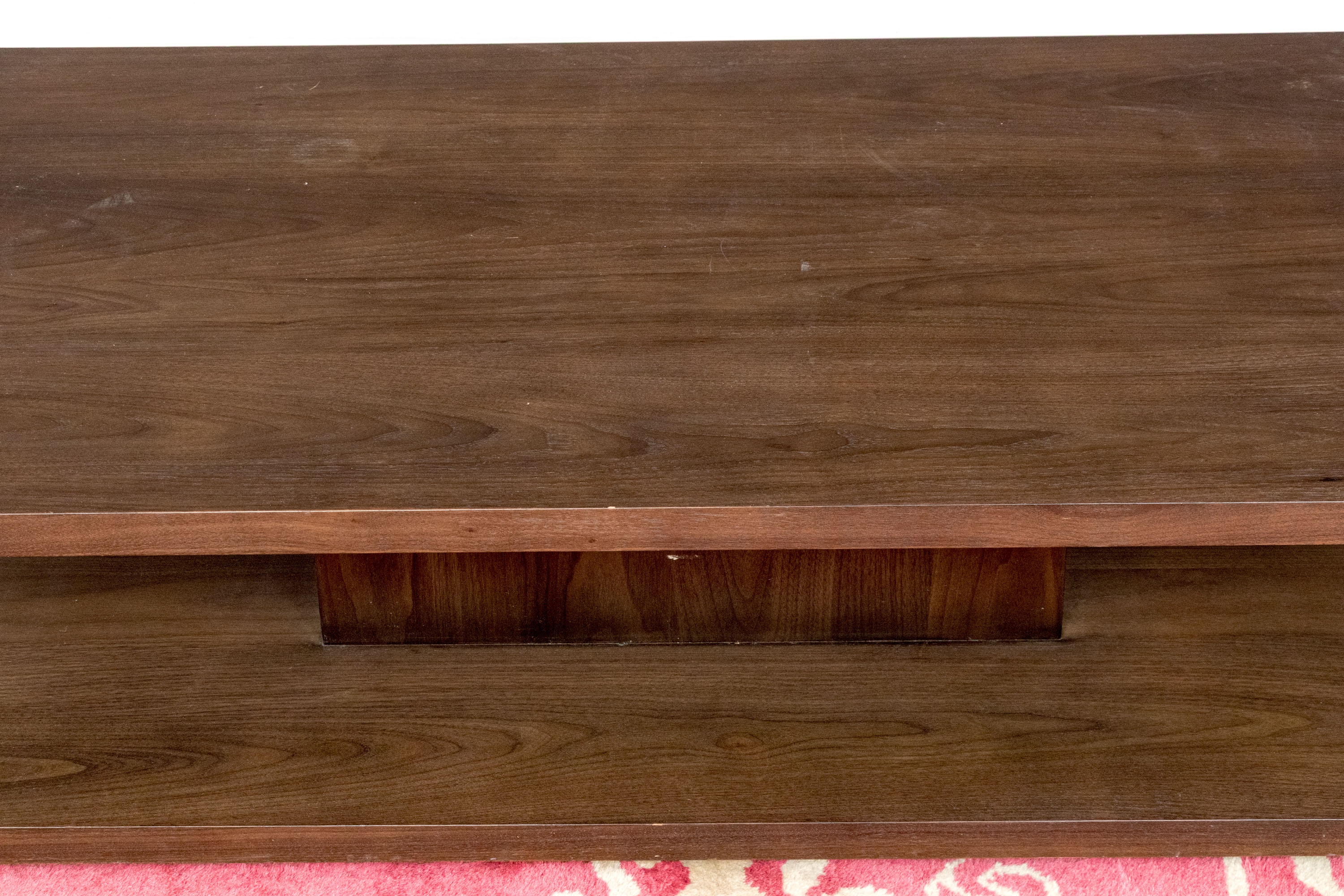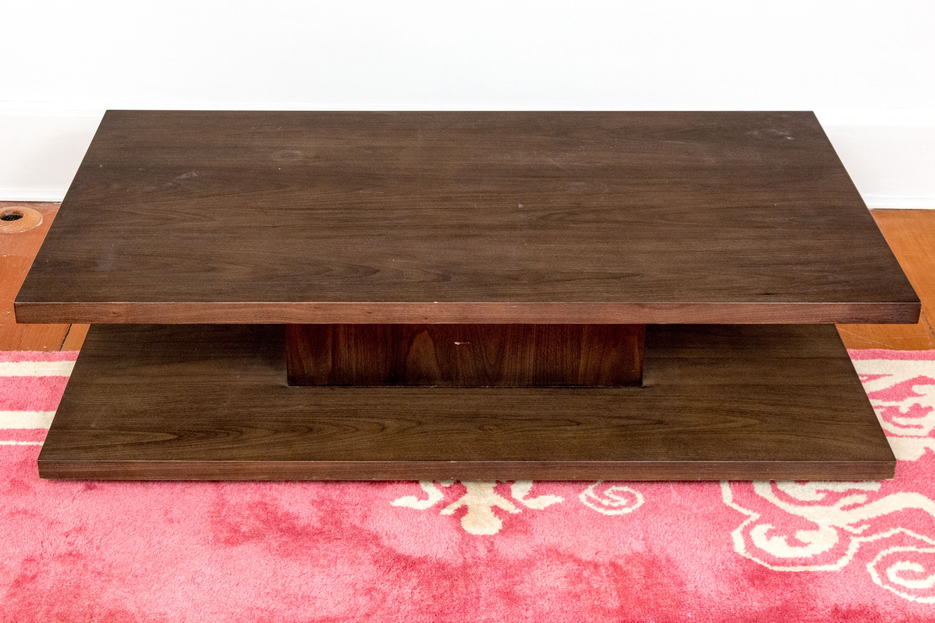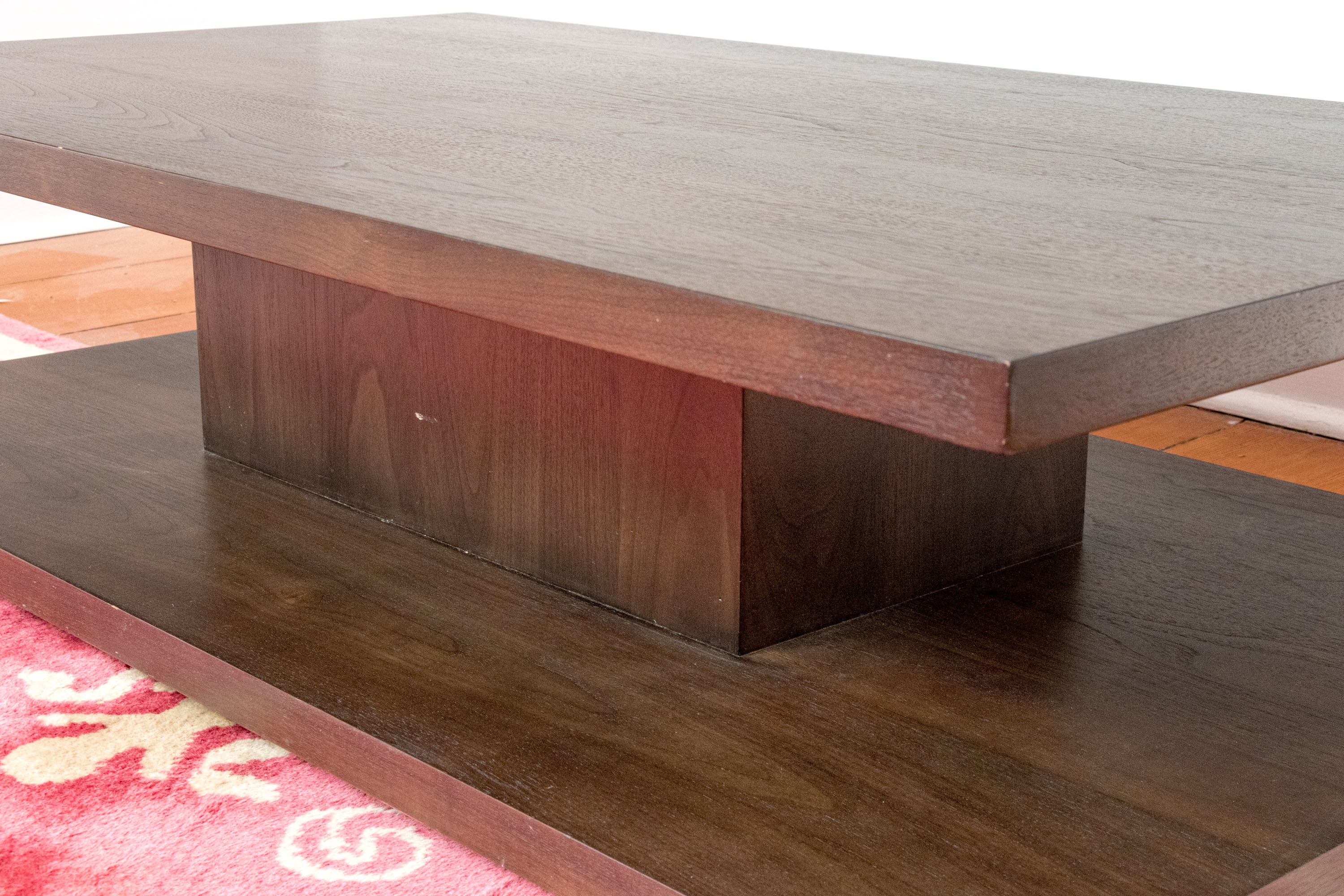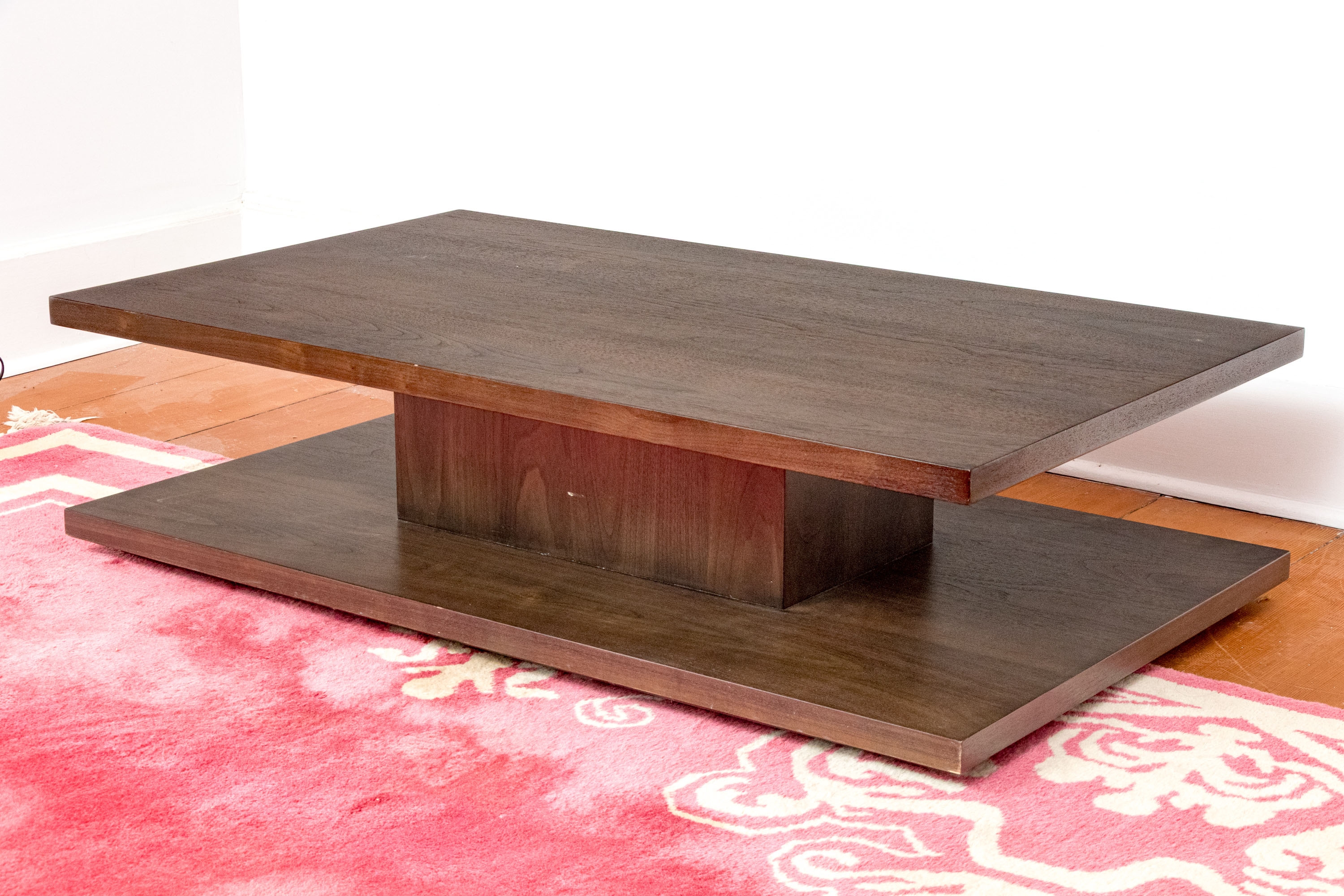 Rectangular base with central pedestal supporting the upper1 1/2" thick rectangular table top. All in a handsome brown stain finish. Thick base and table top give the impression of being structurally solid and quality made. With minimalistic charm, the table presents well.