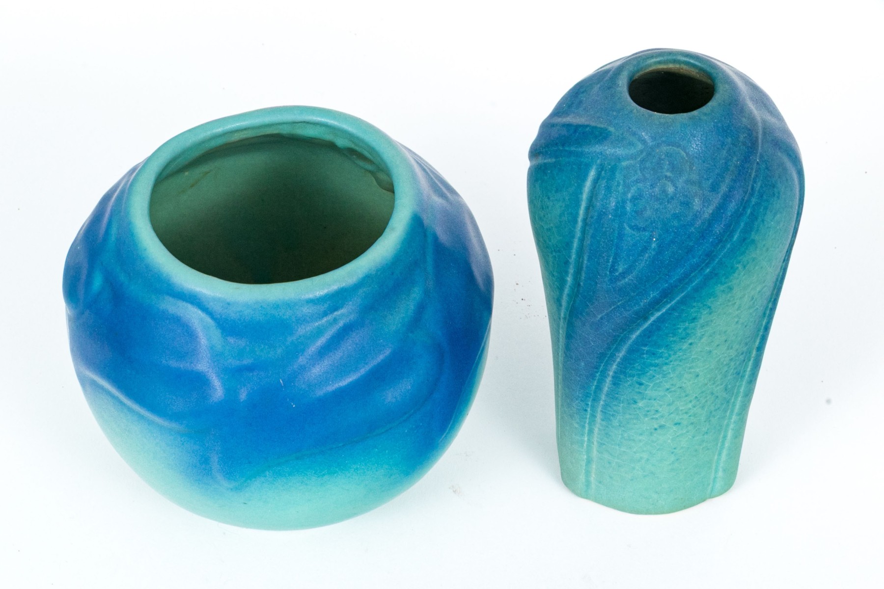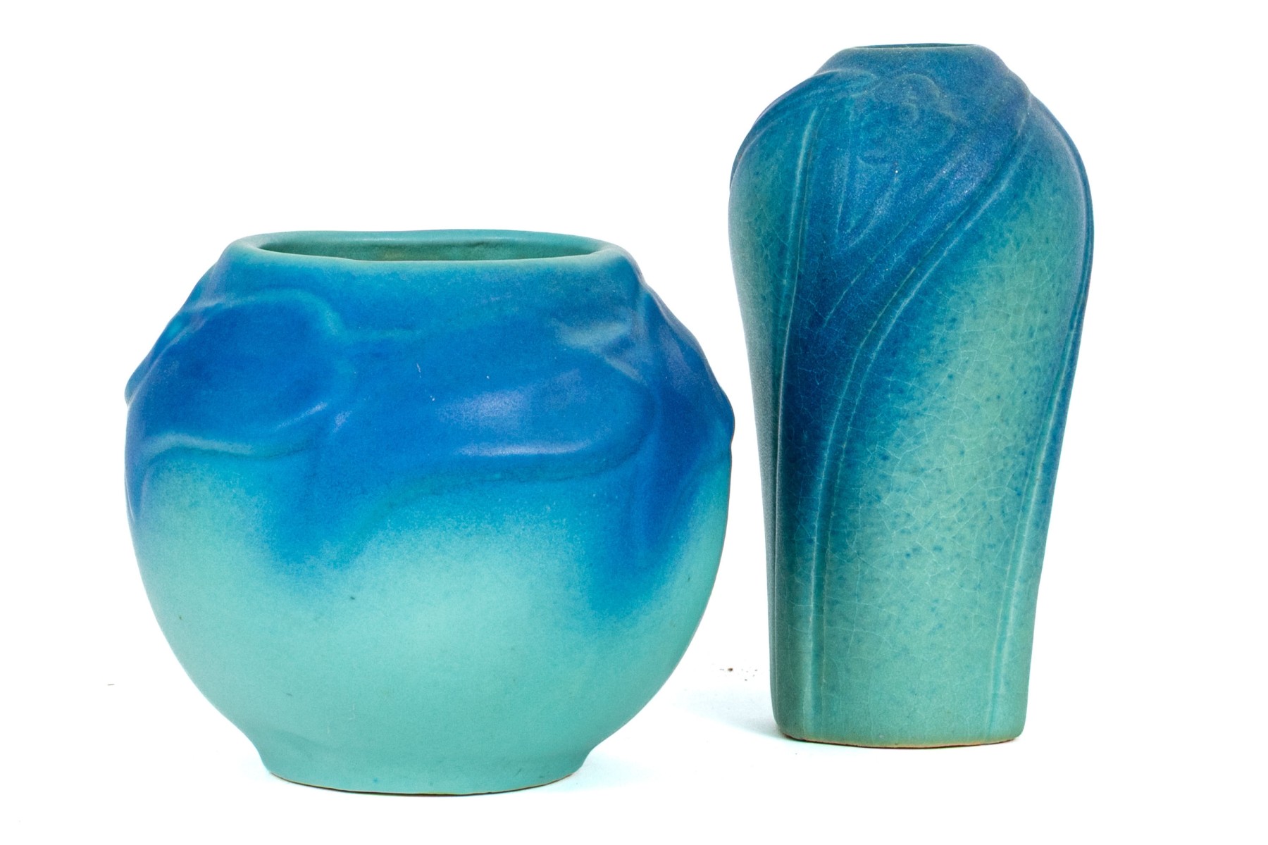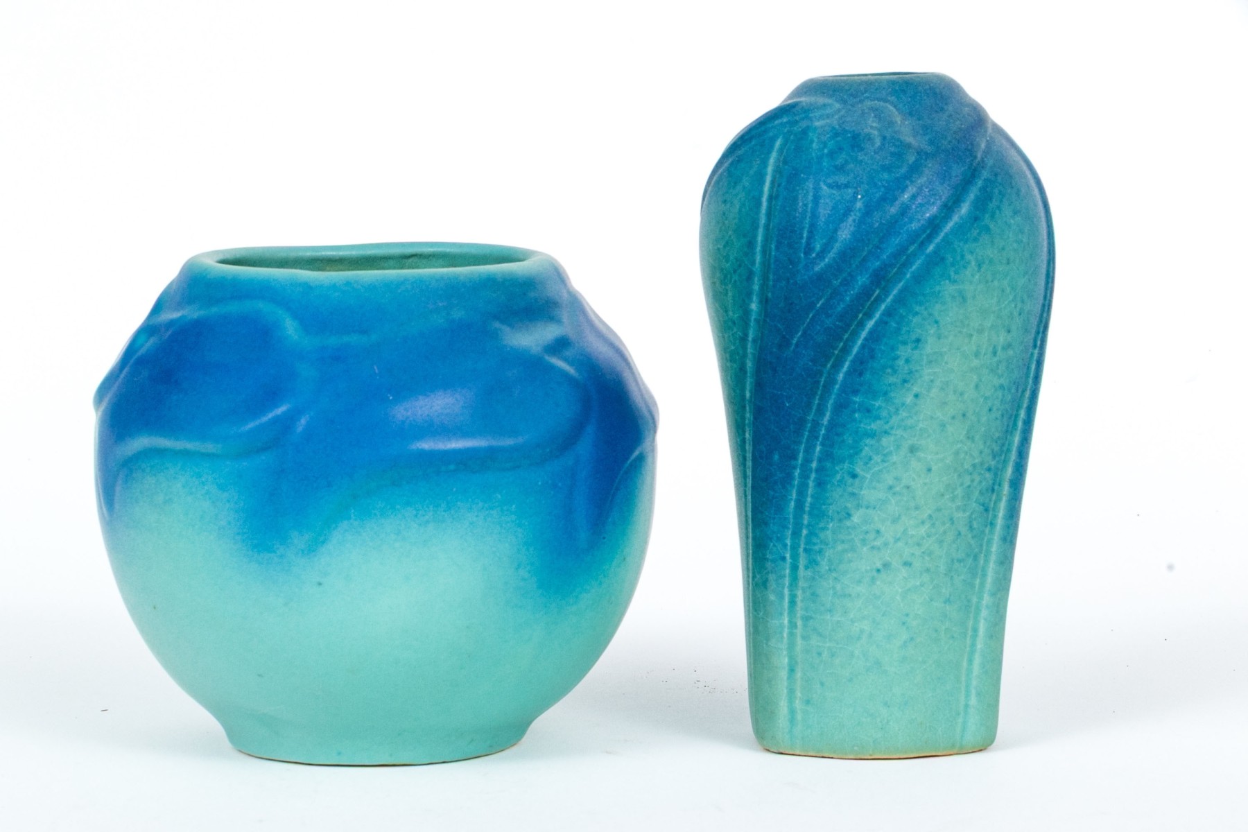 A delightful duo of Van Briggle ceramic vases with great Art Nouveau appeal, both designed with moulded foliate motifs in vibrant semi-matte blue and green glaze. Marked underfoot.