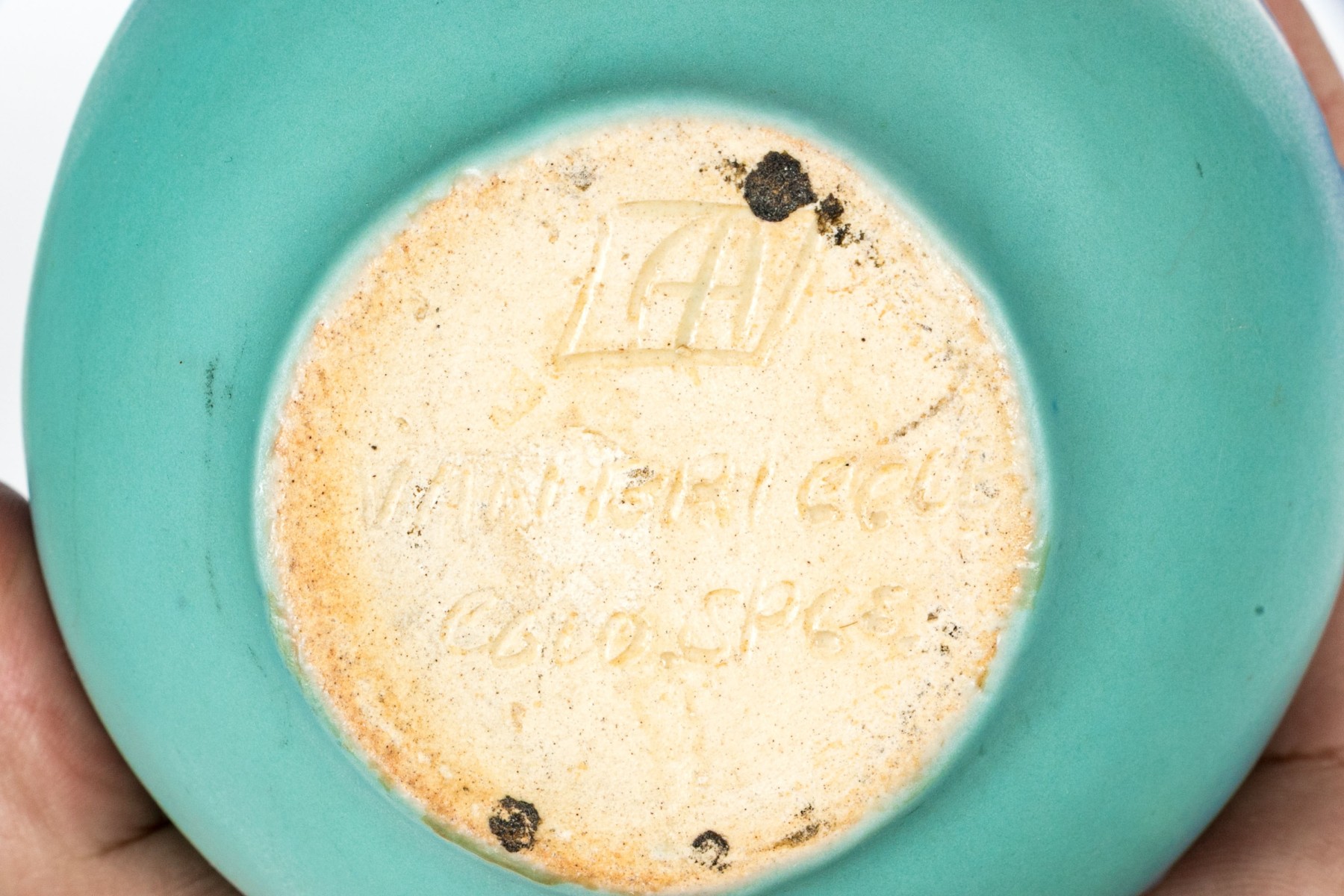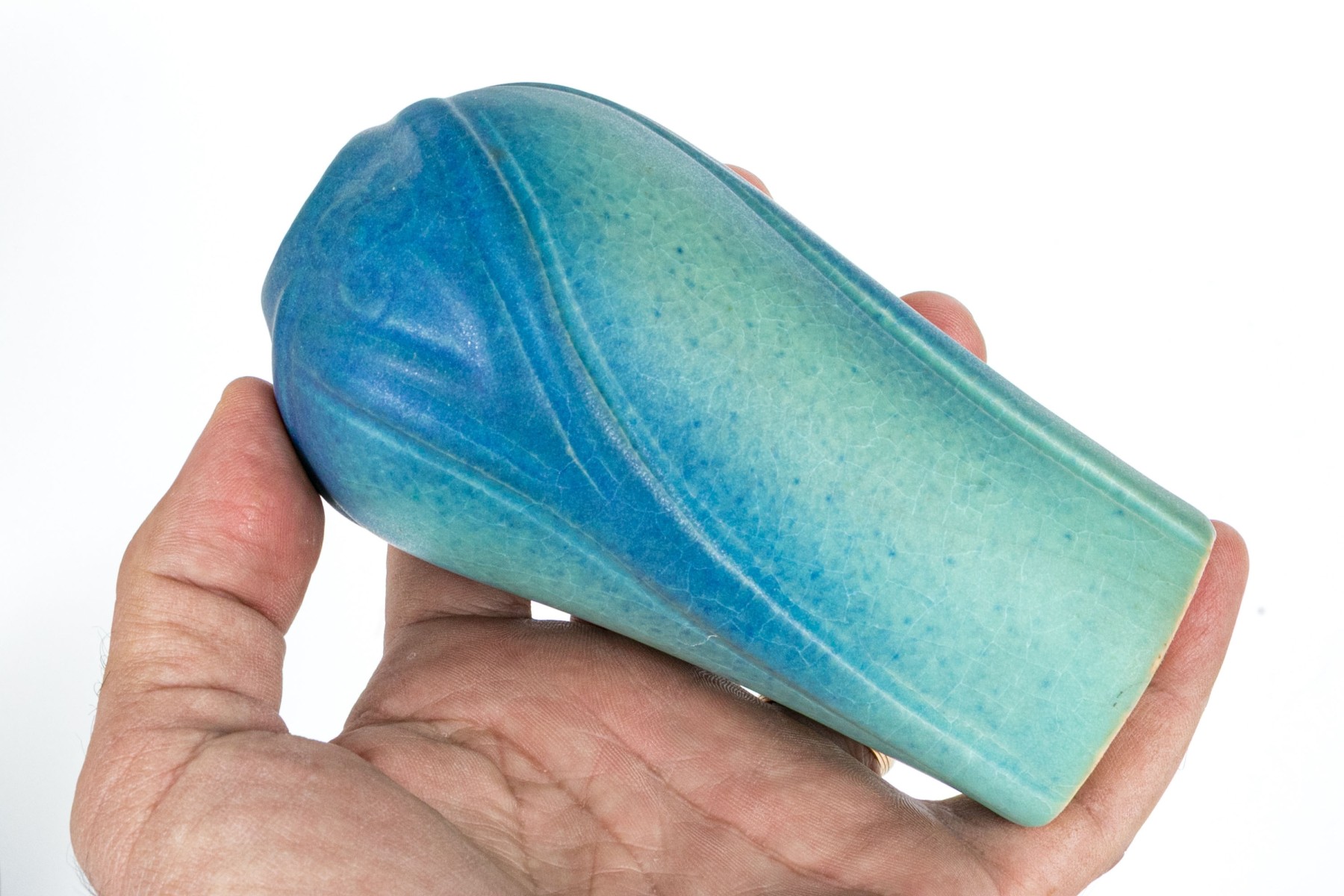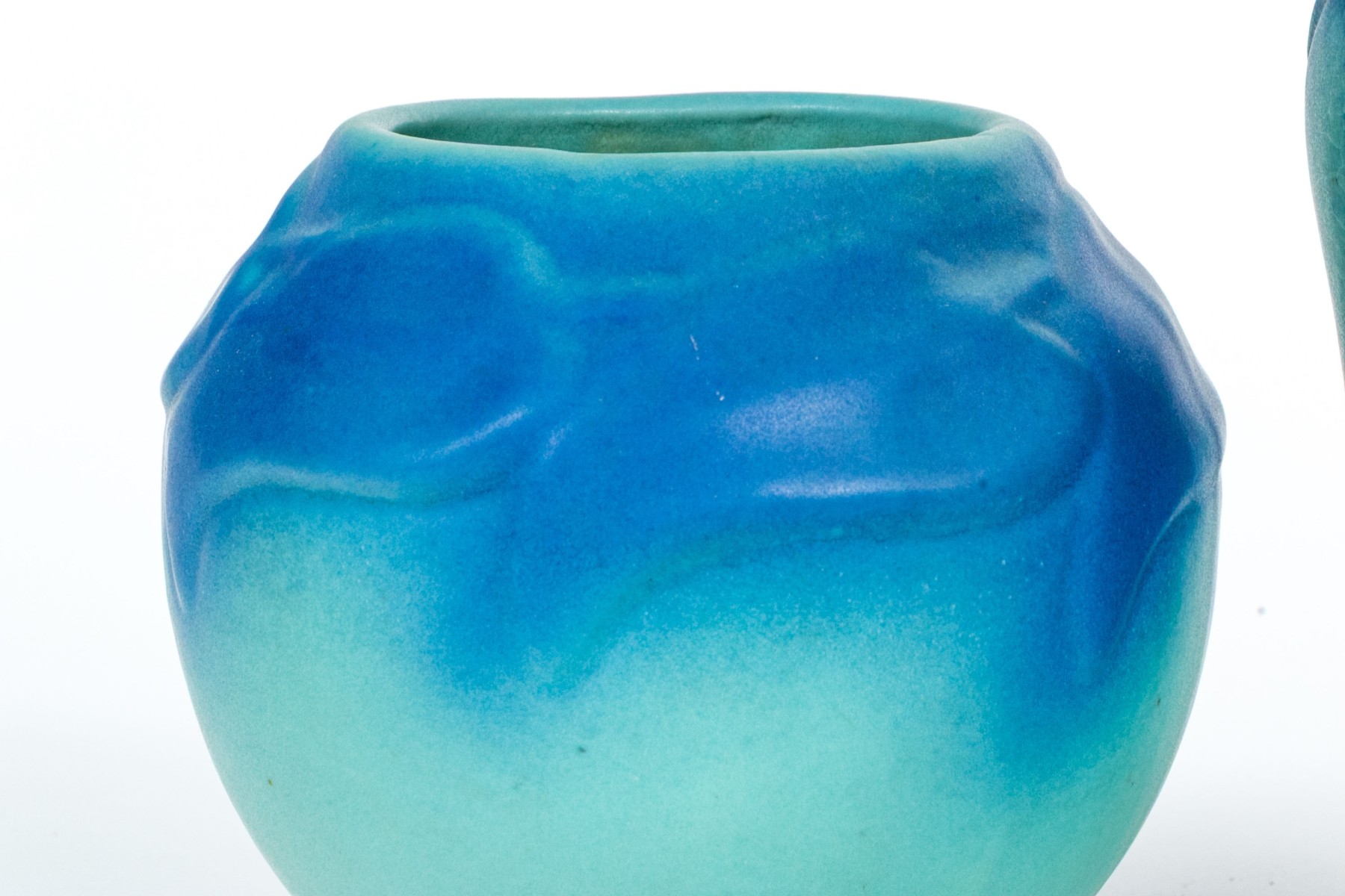 A delightful duo of Van Briggle ceramic vases with great Art Nouveau appeal, both designed with moulded foliate motifs in vibrant semi-matte blue and green glaze. Marked underfoot.