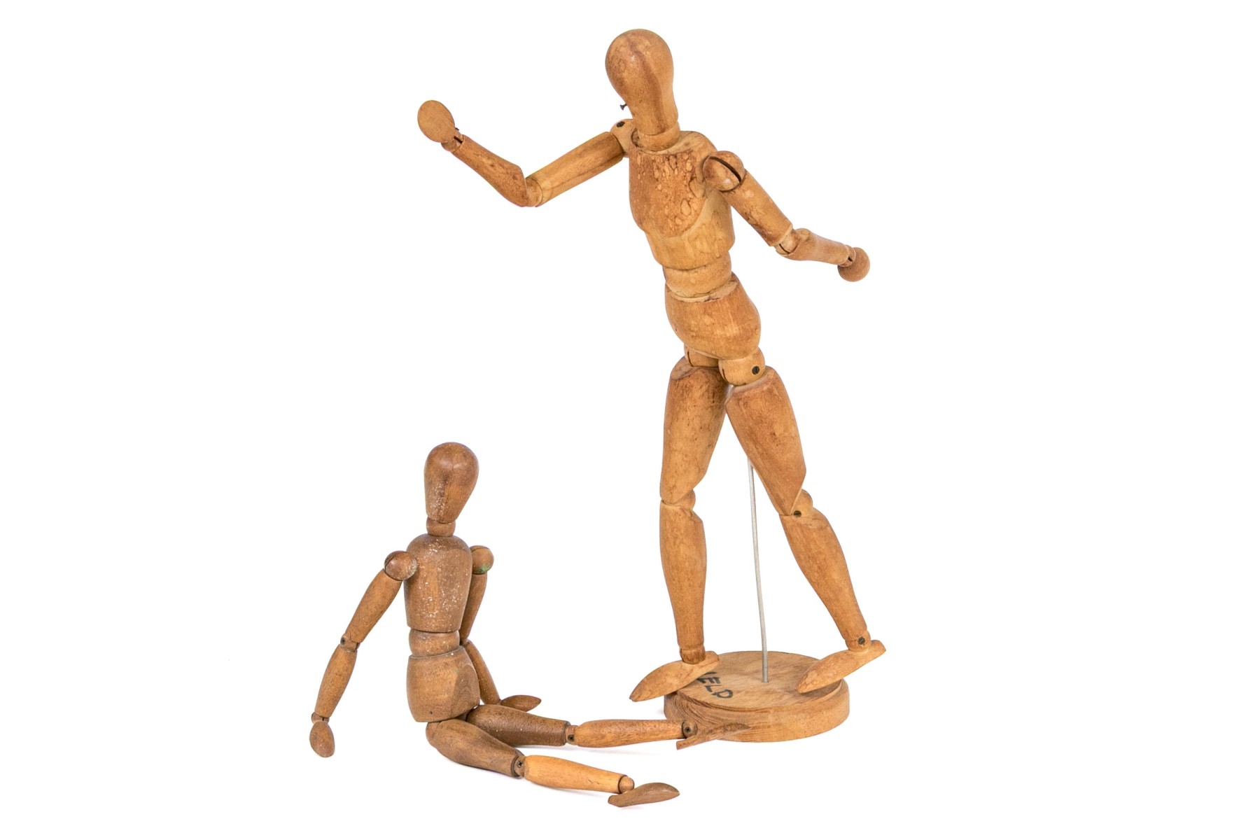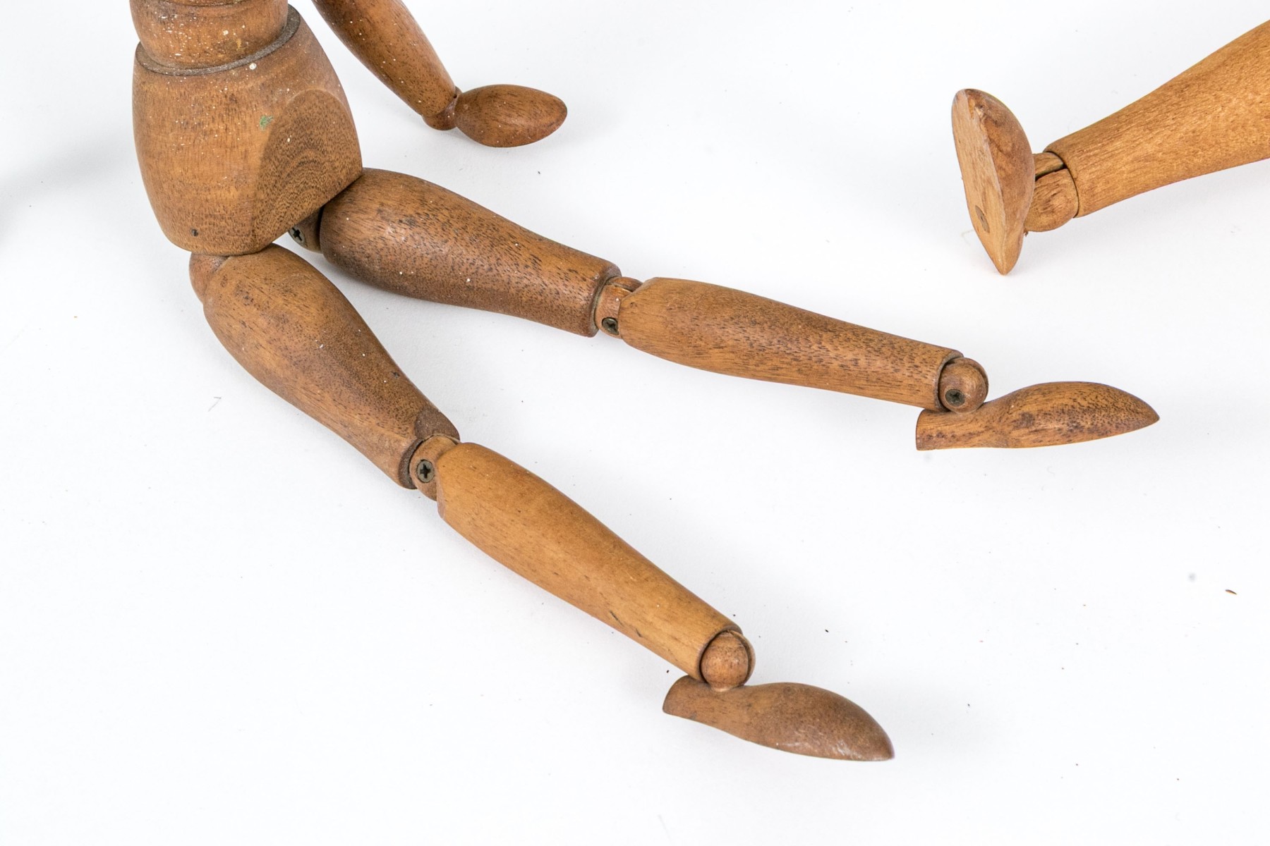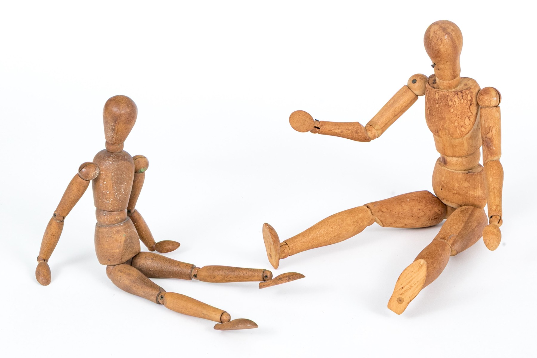 A charming duo of vintage wood ball jointed mannequins, one with a circular stand.