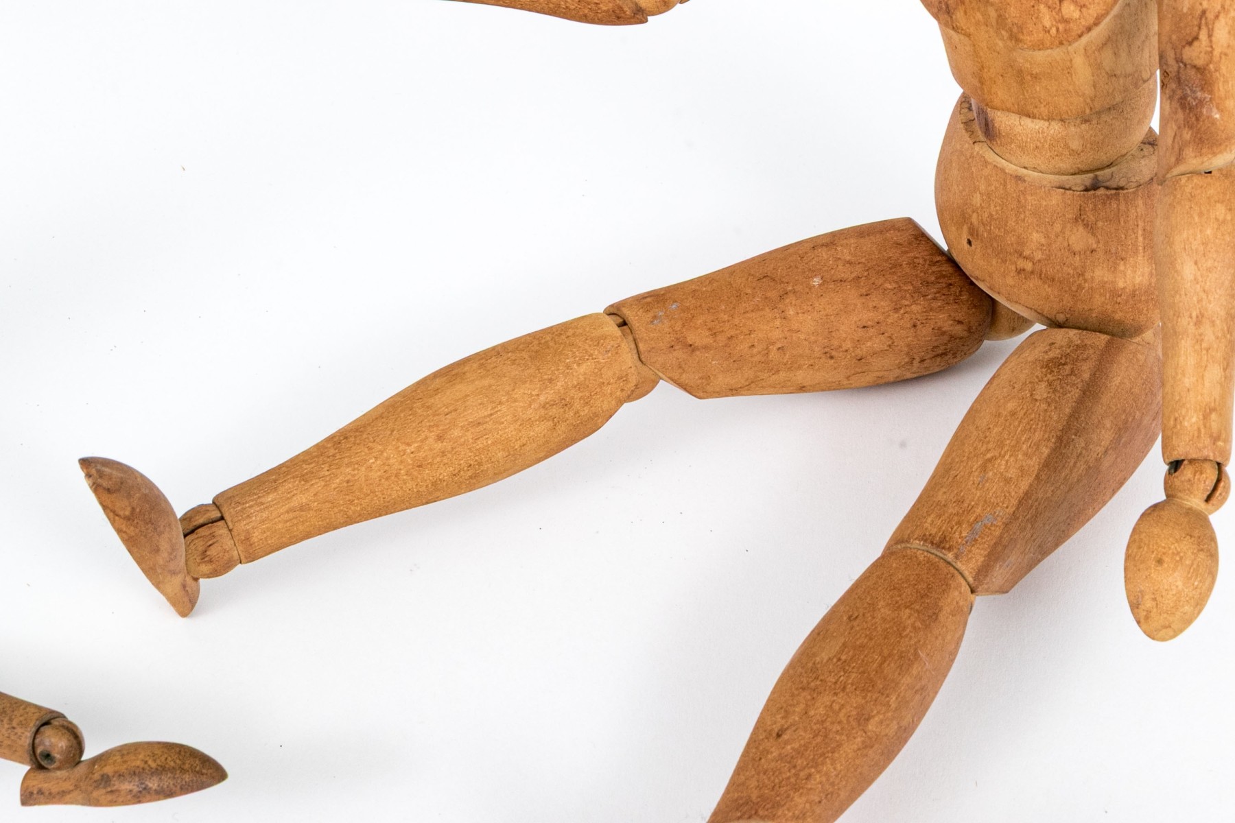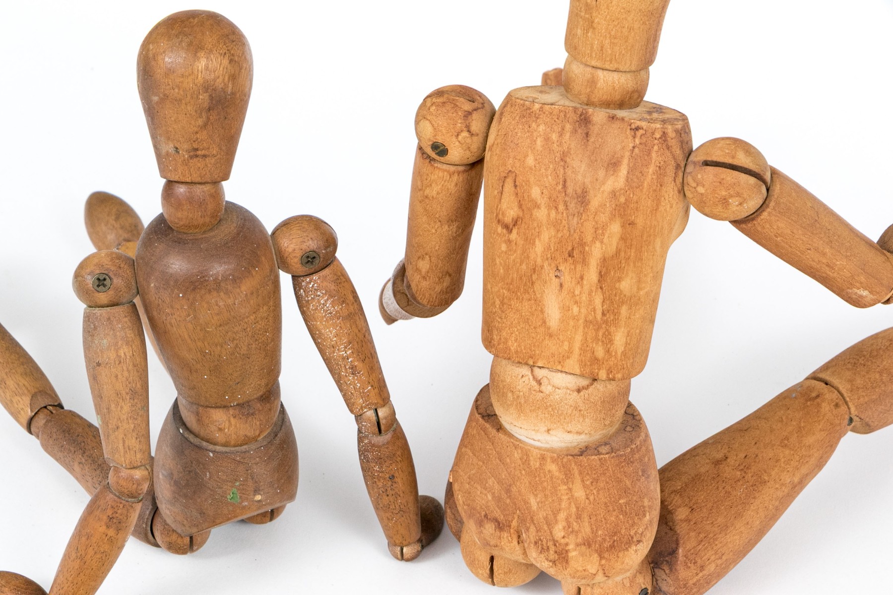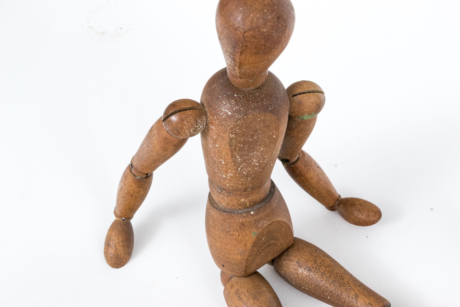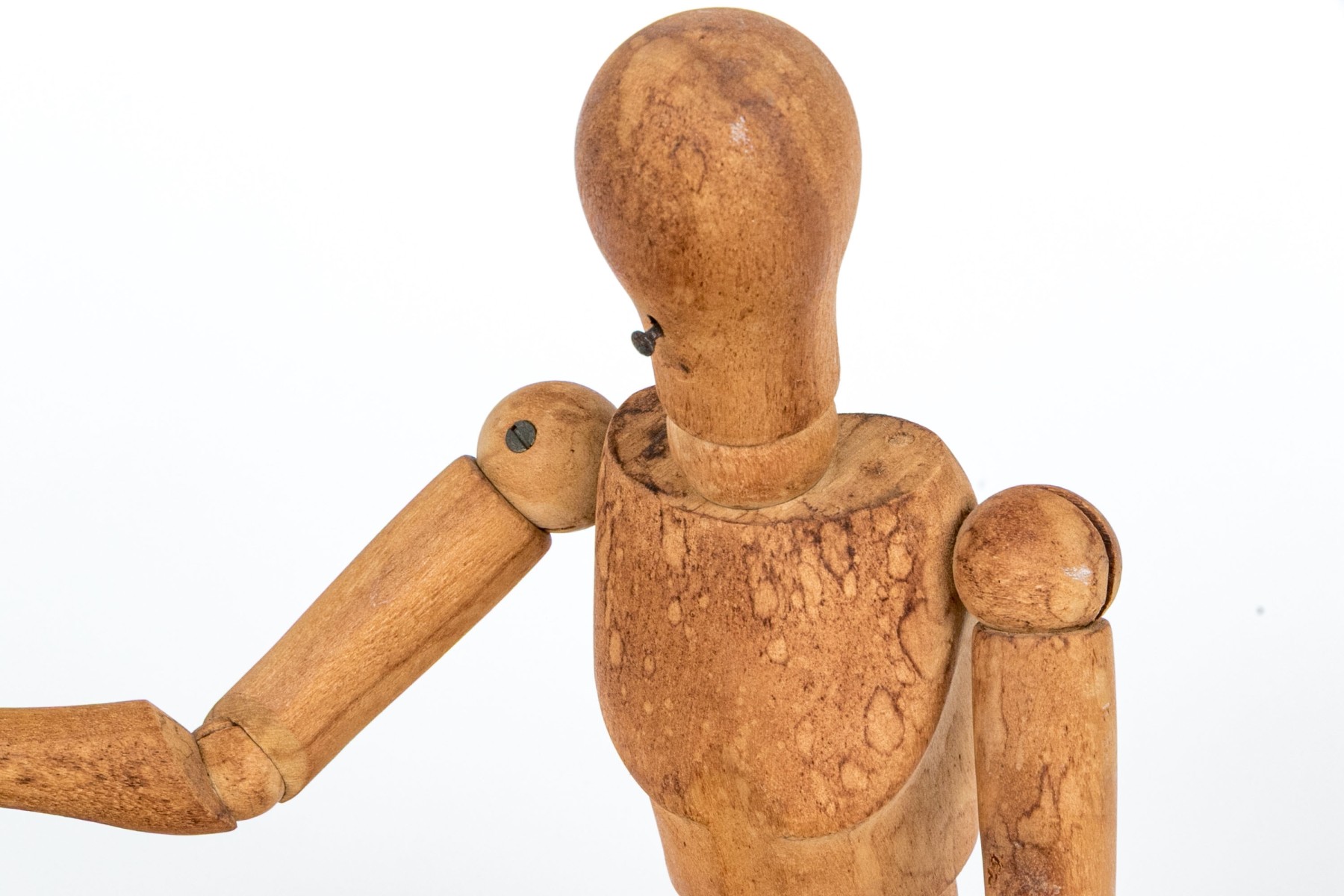 A charming duo of vintage wood ball jointed mannequins, one with a circular stand.