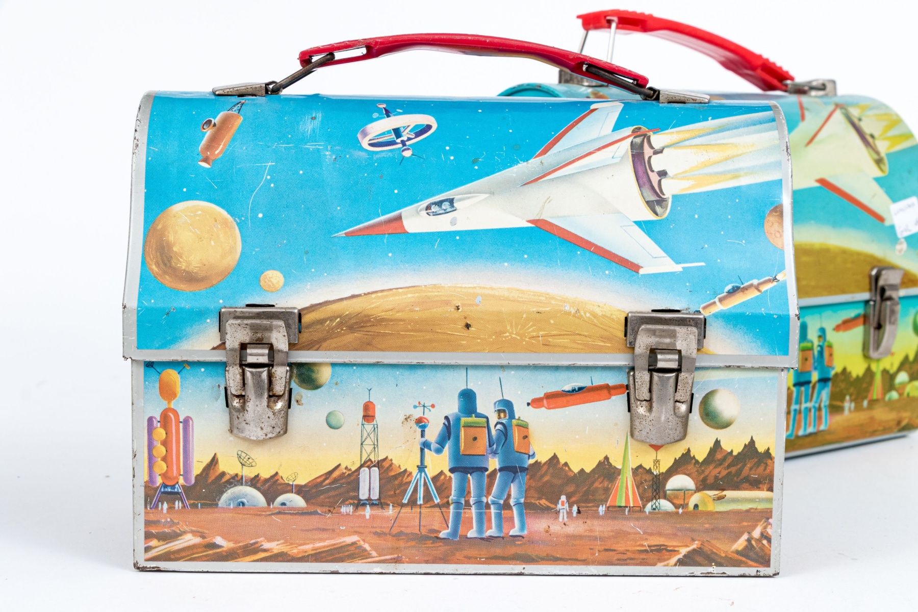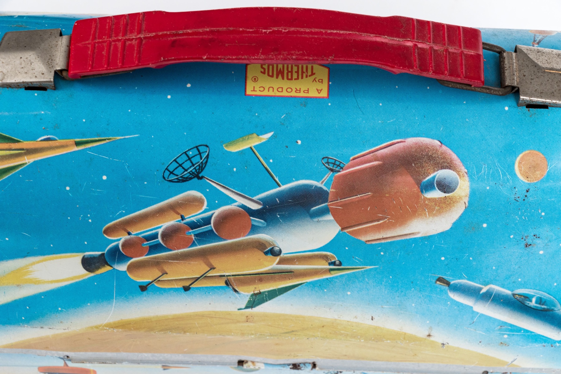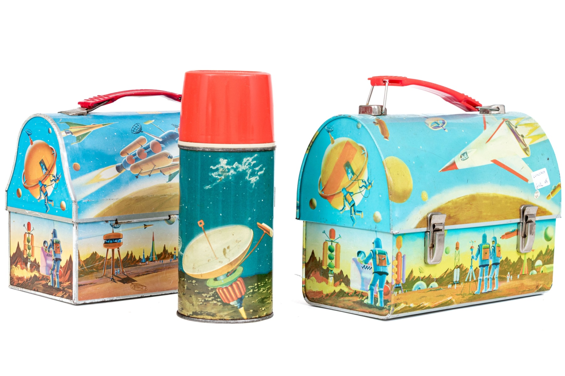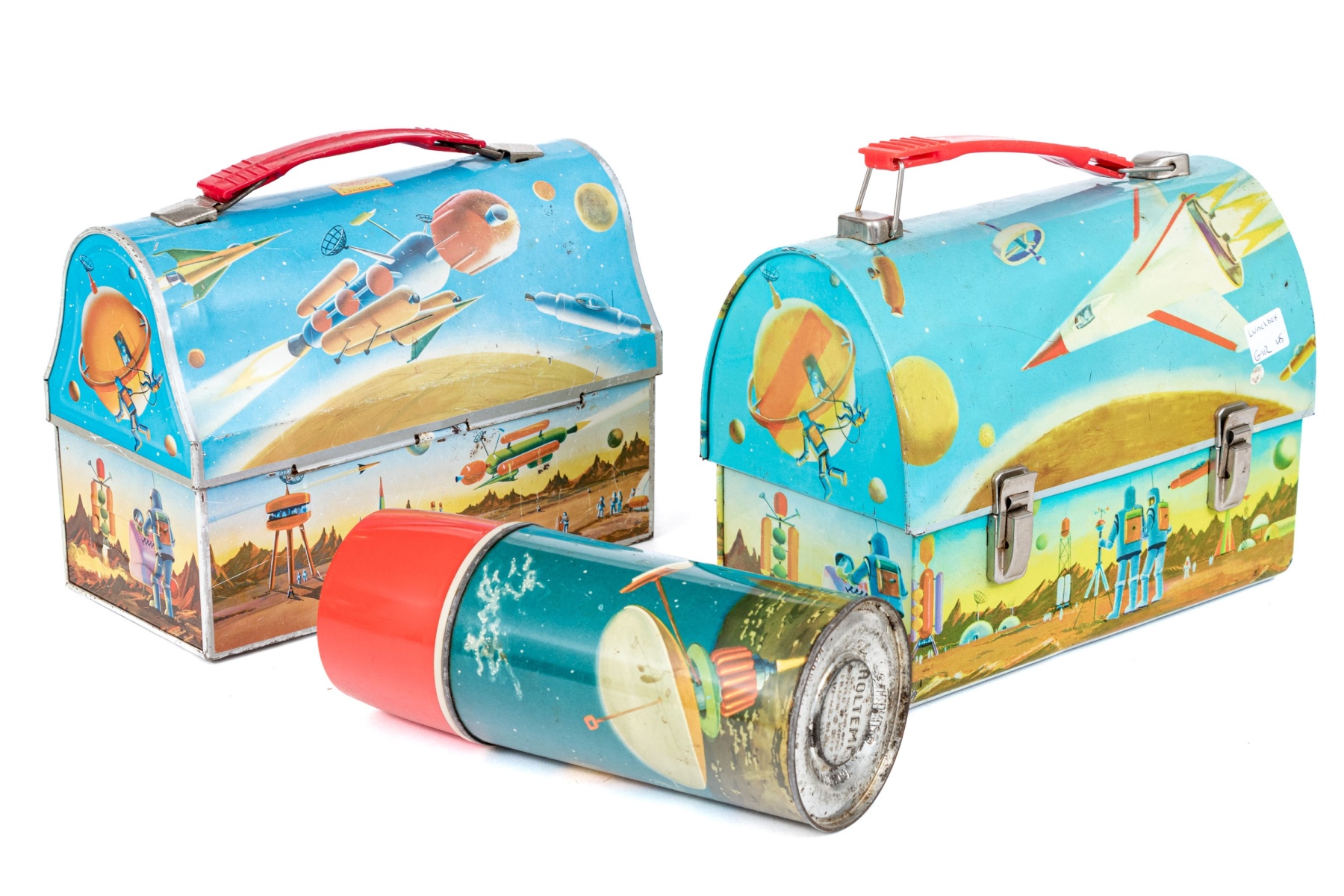 A charming collection of vintage metal lunch wares including two space themed lunch boxes and a thermos.