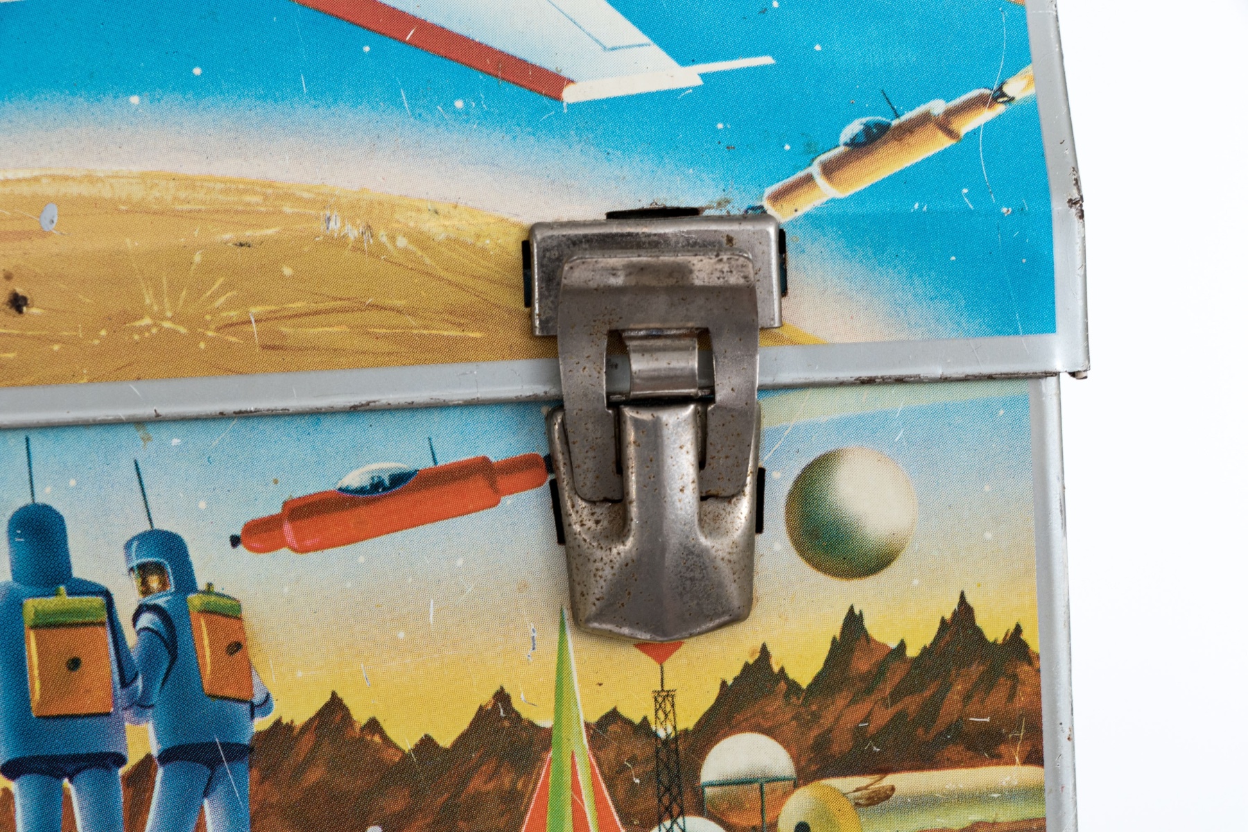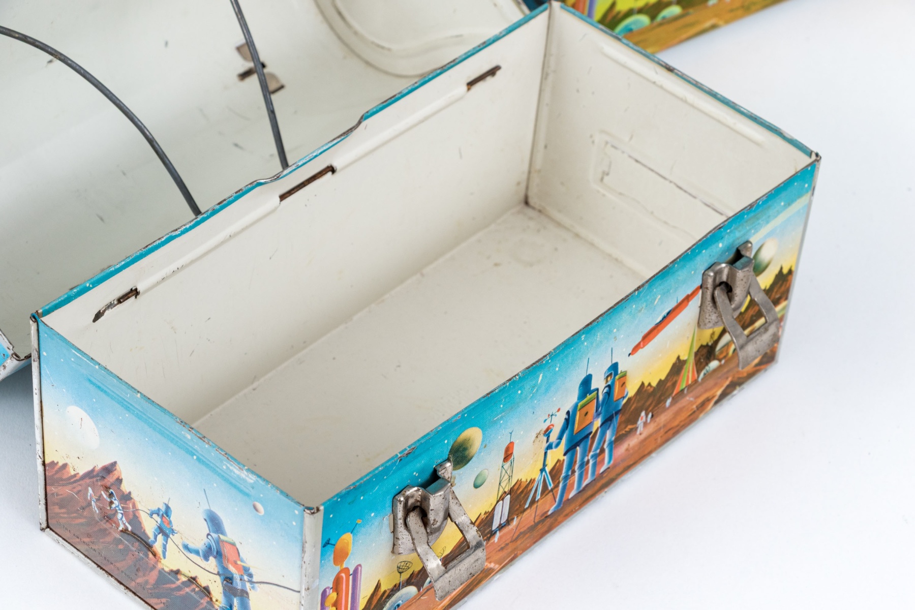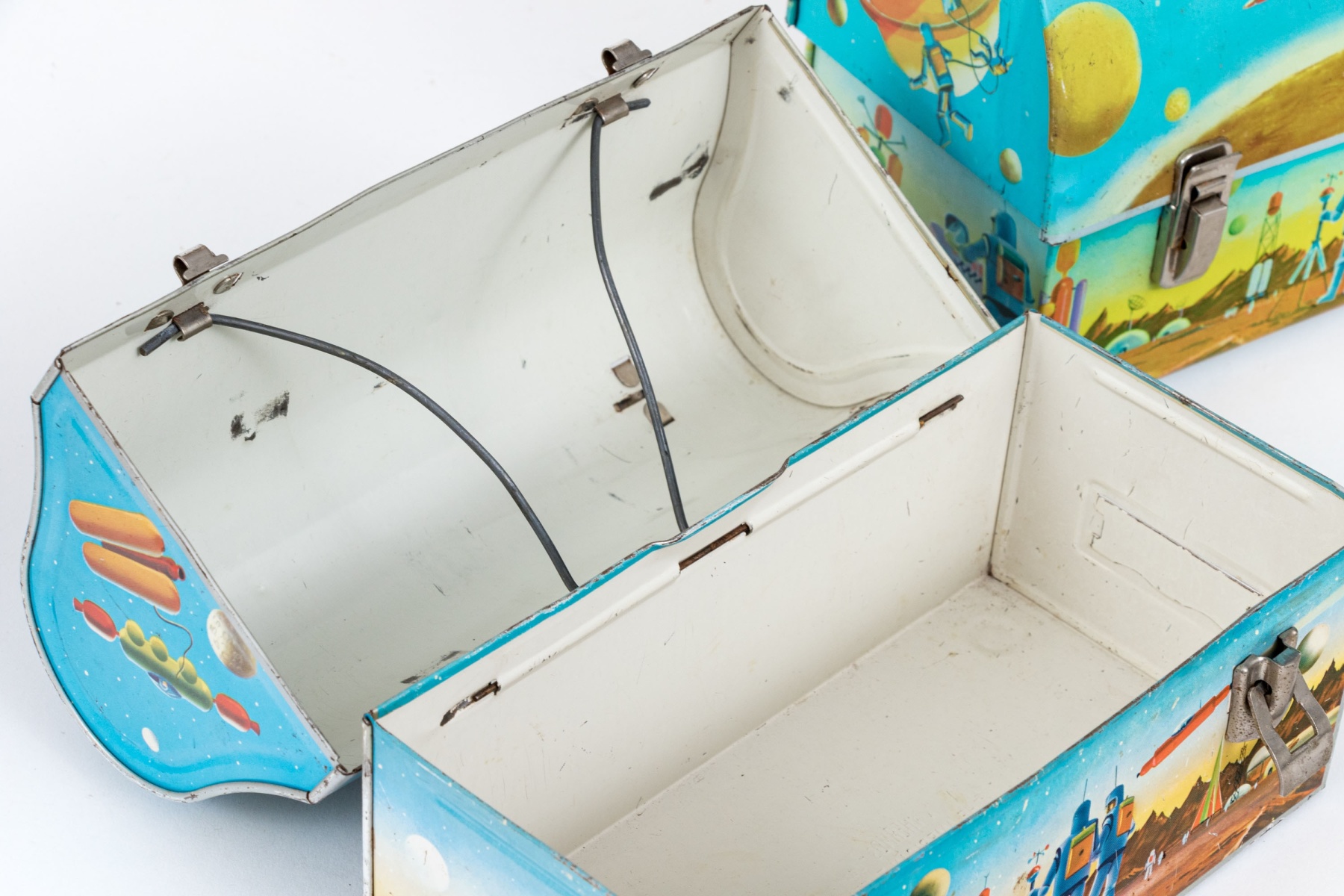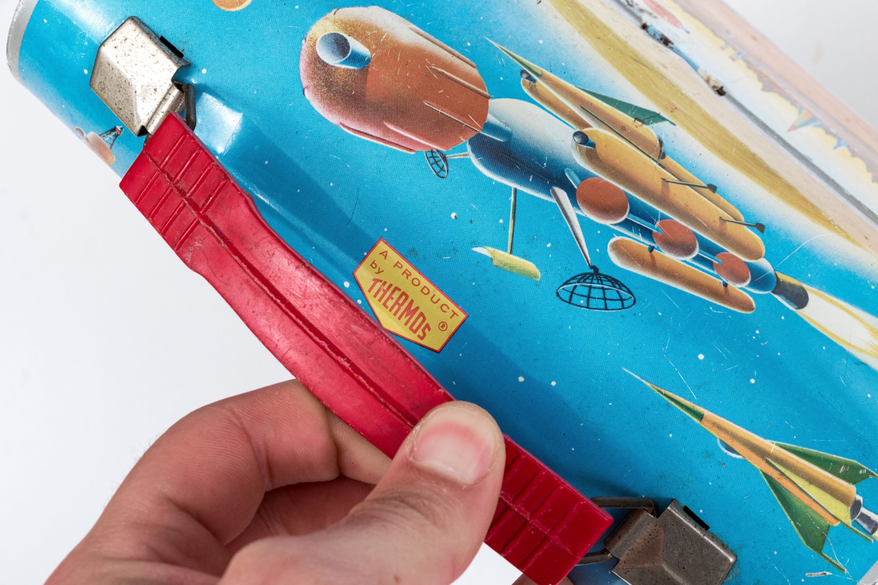 A charming collection of vintage metal lunch wares including two space themed lunch boxes and a thermos.