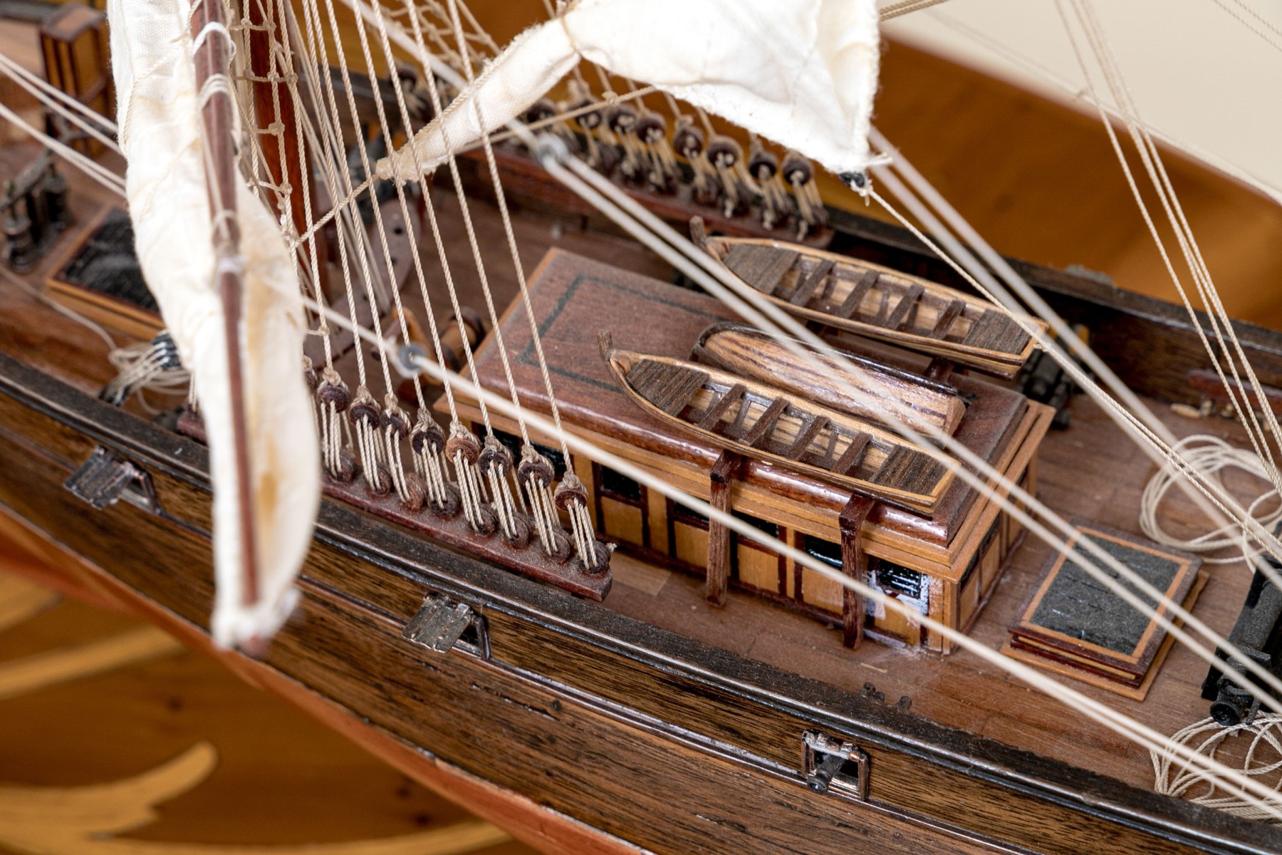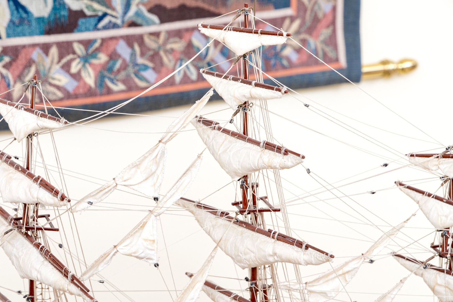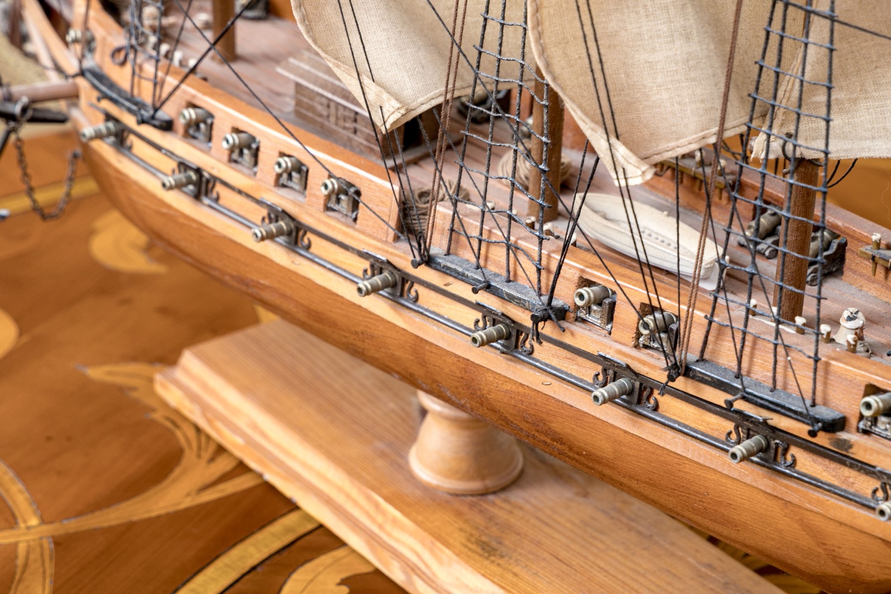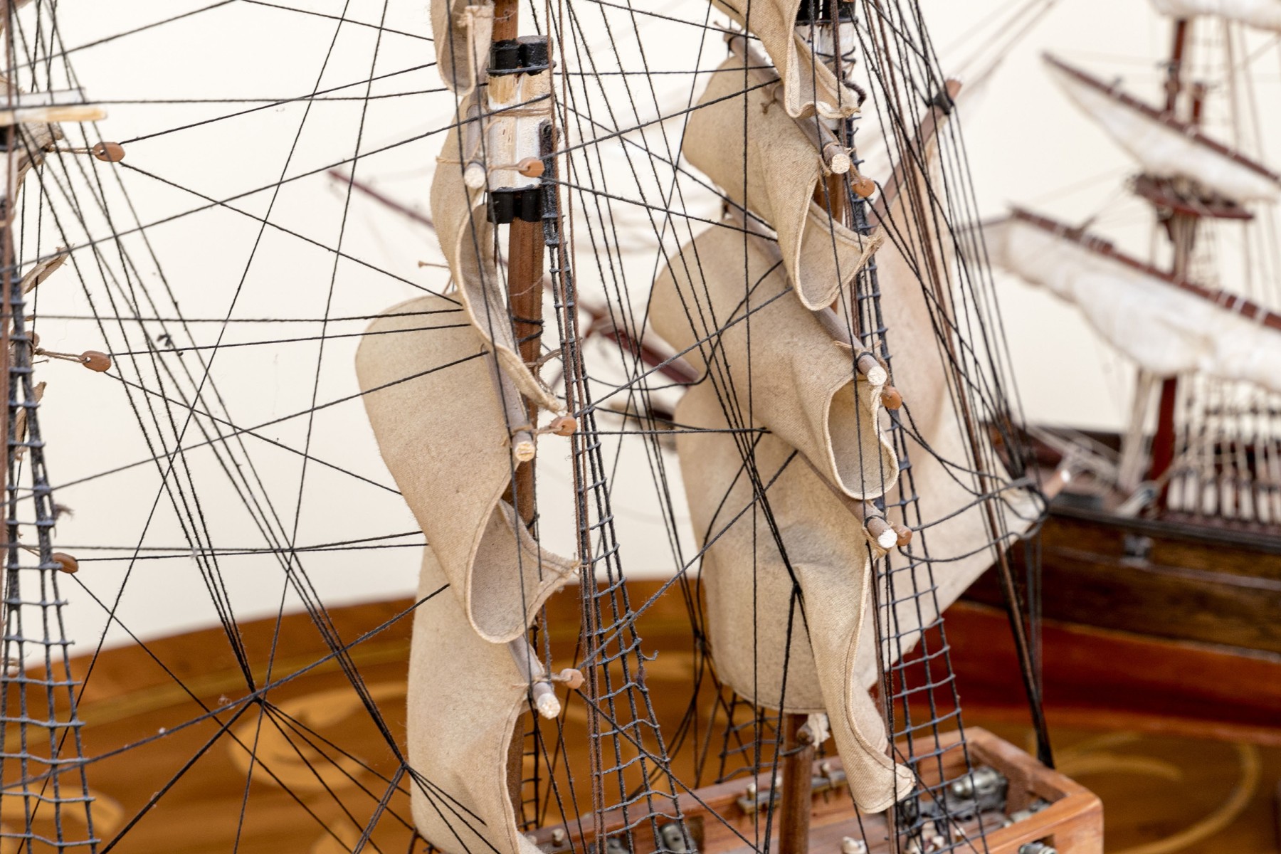 Some imperfections and discoloring to sails commensurate with age. One wooden support for sail broken, but present for possible repair.