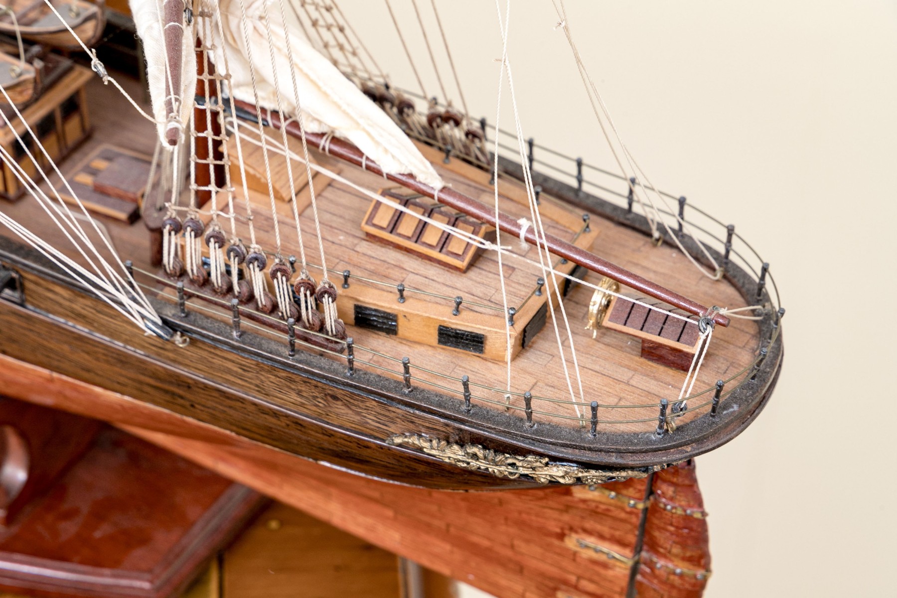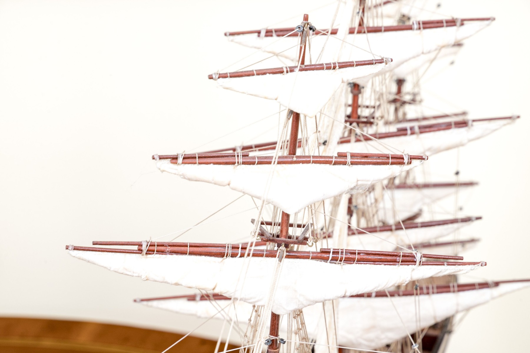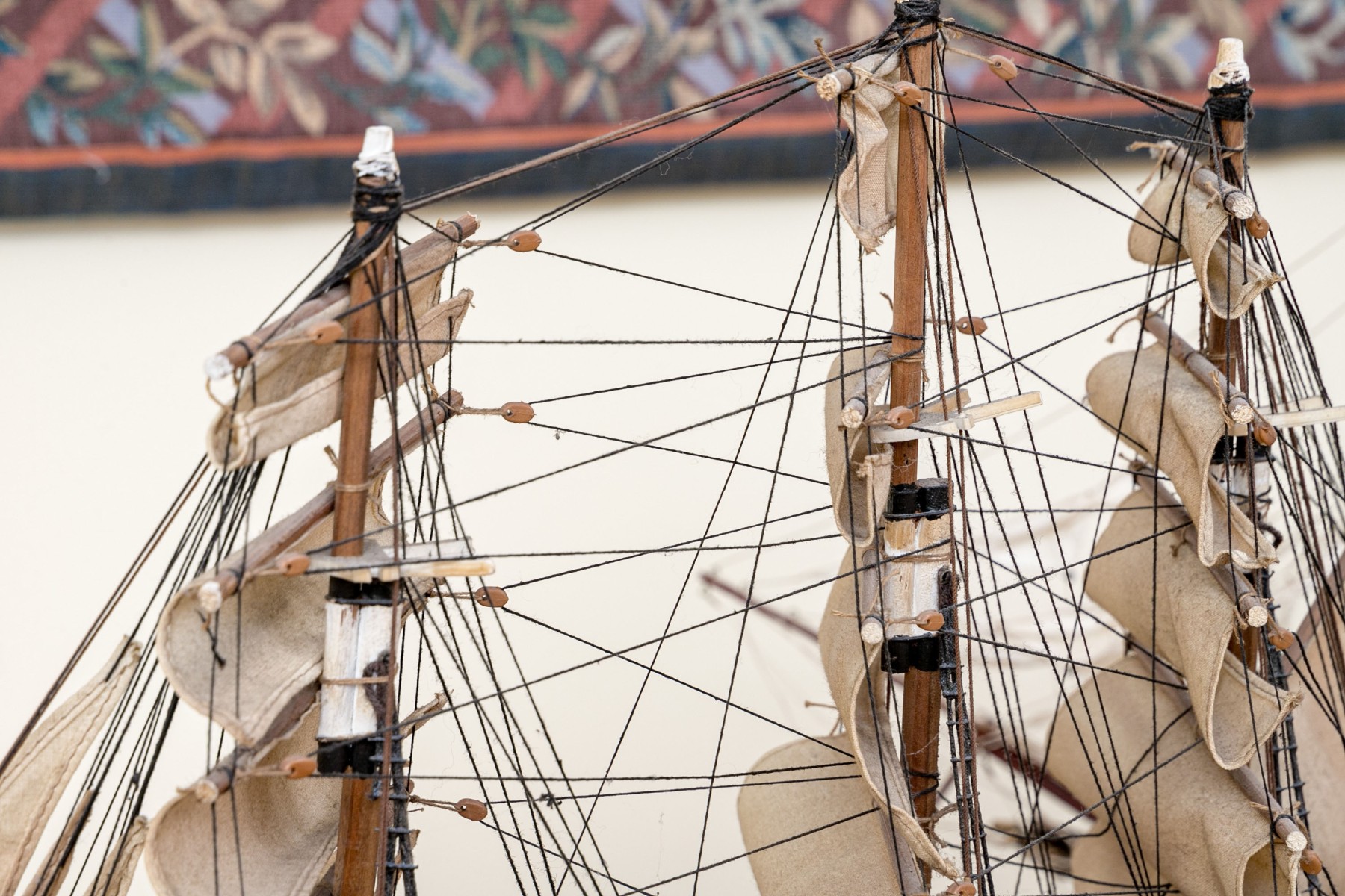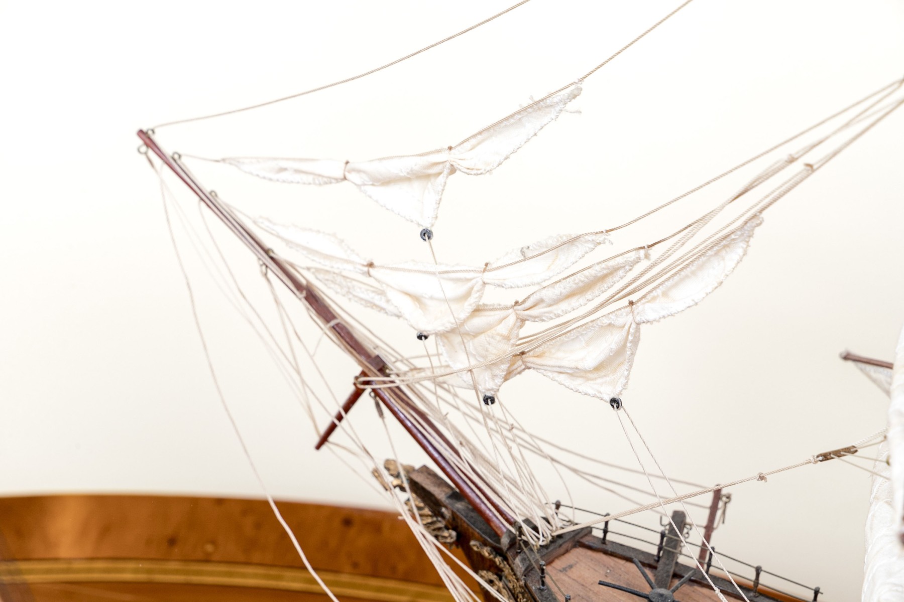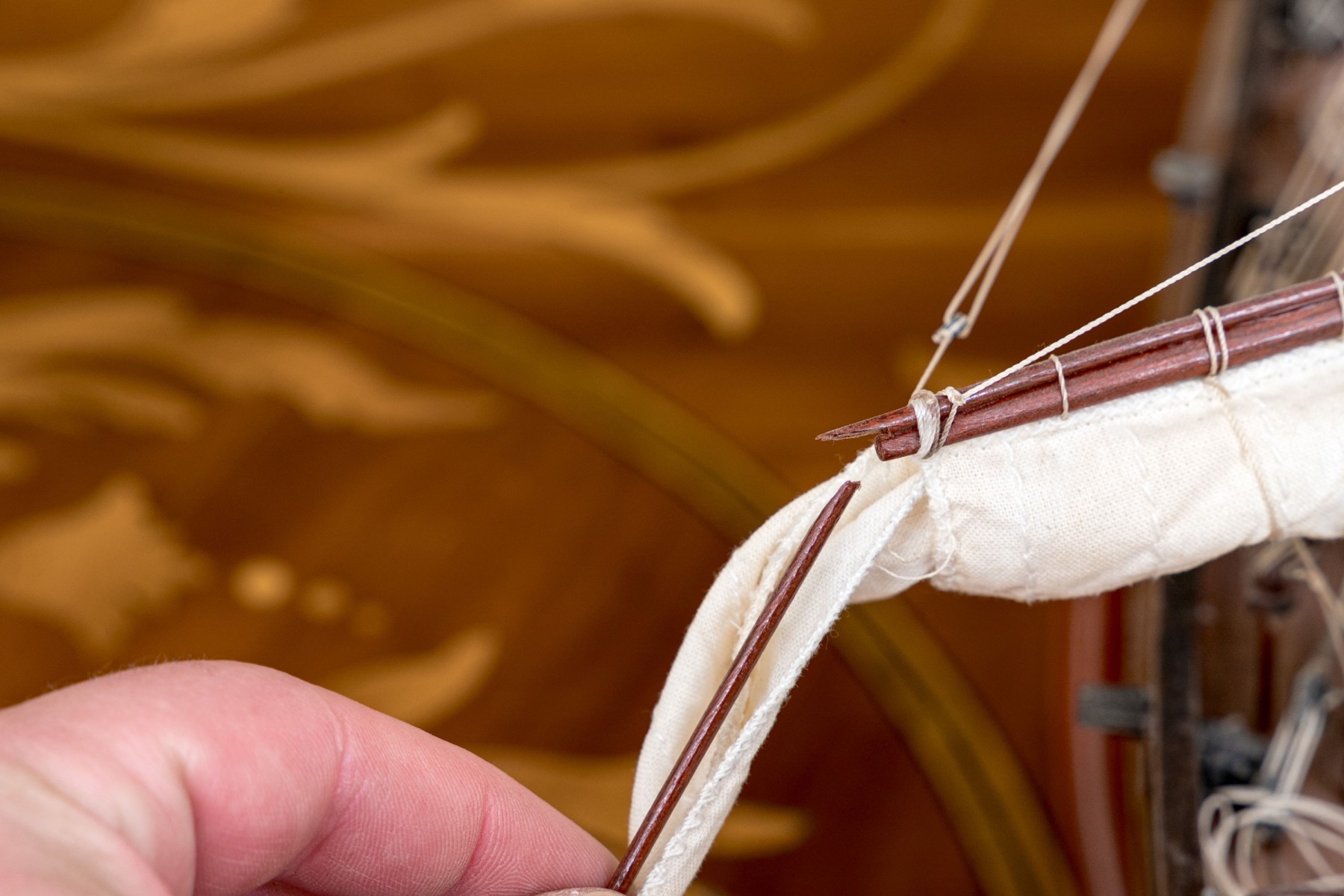 Some imperfections and discoloring to sails commensurate with age. One wooden support for sail broken, but present for possible repair.