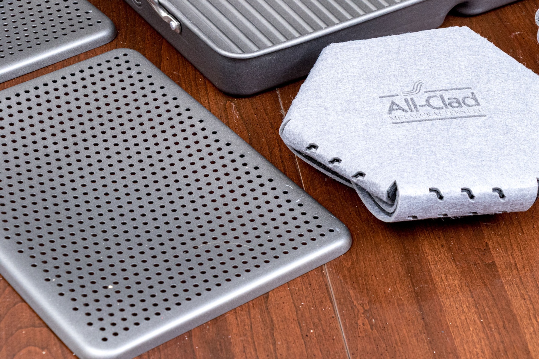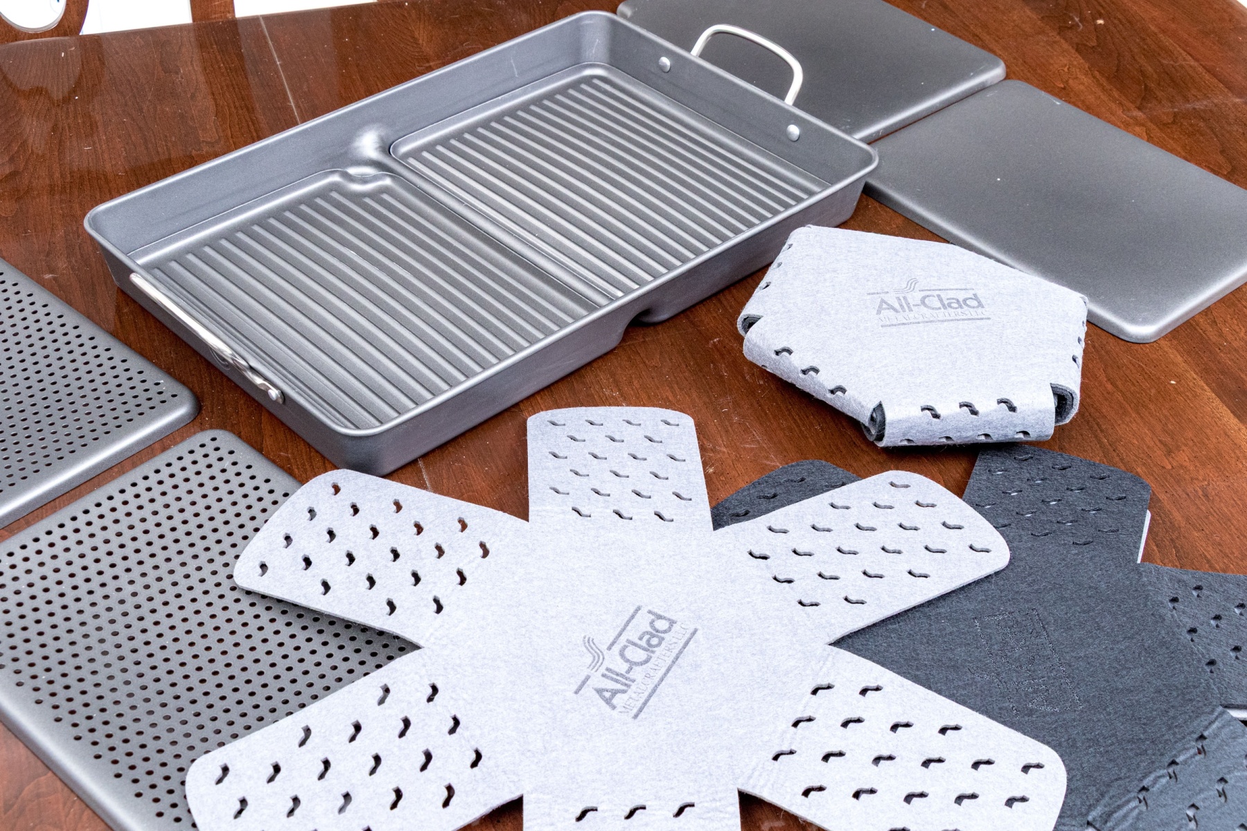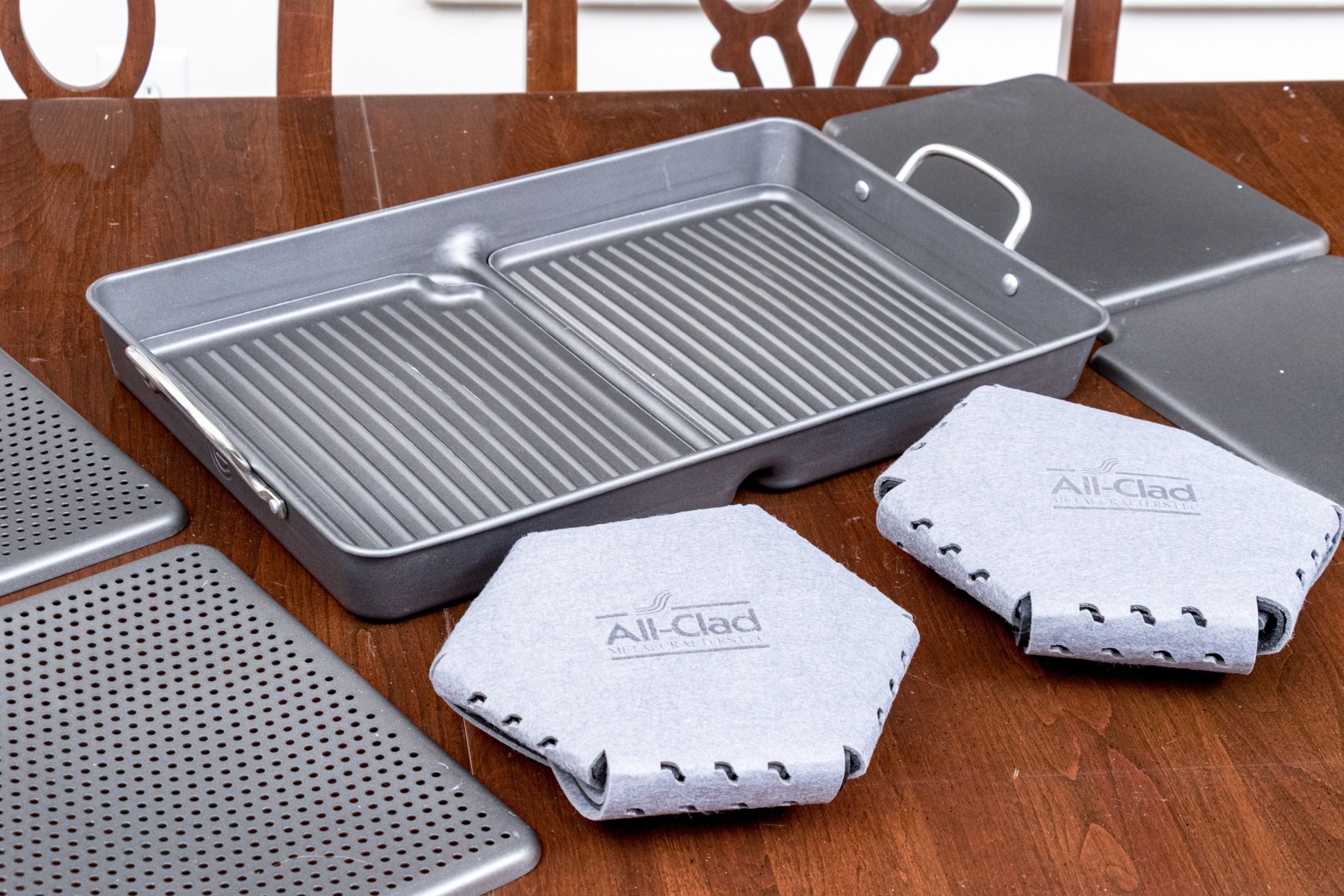 A fabulous grill pan with twin handles and two ridged wells, accompanied by assorted accessories including pierced and solid pans and All-Clad pan protectors for stacking.