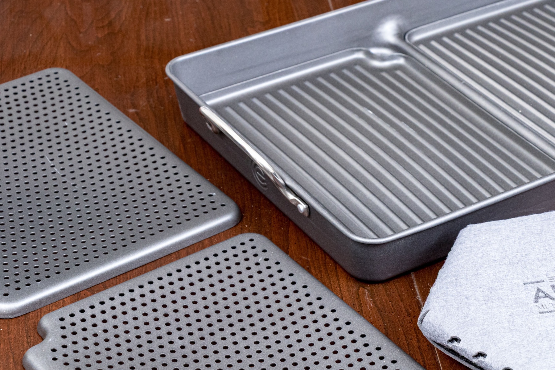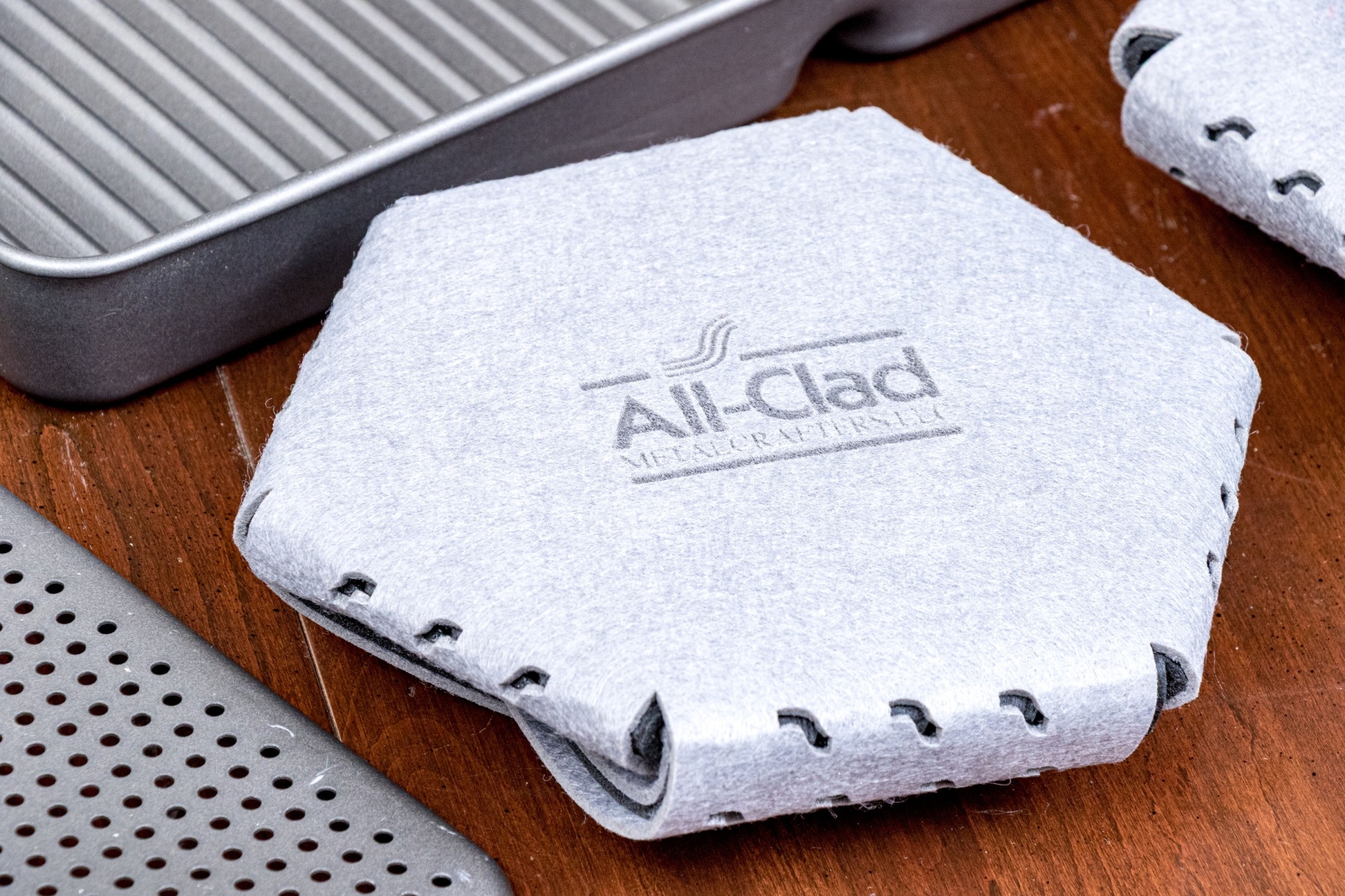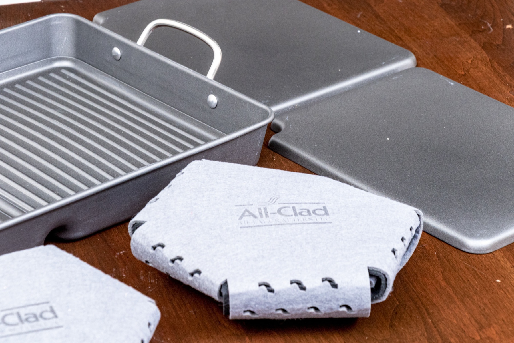 A fabulous grill pan with twin handles and two ridged wells, accompanied by assorted accessories including pierced and solid pans and All-Clad pan protectors for stacking.