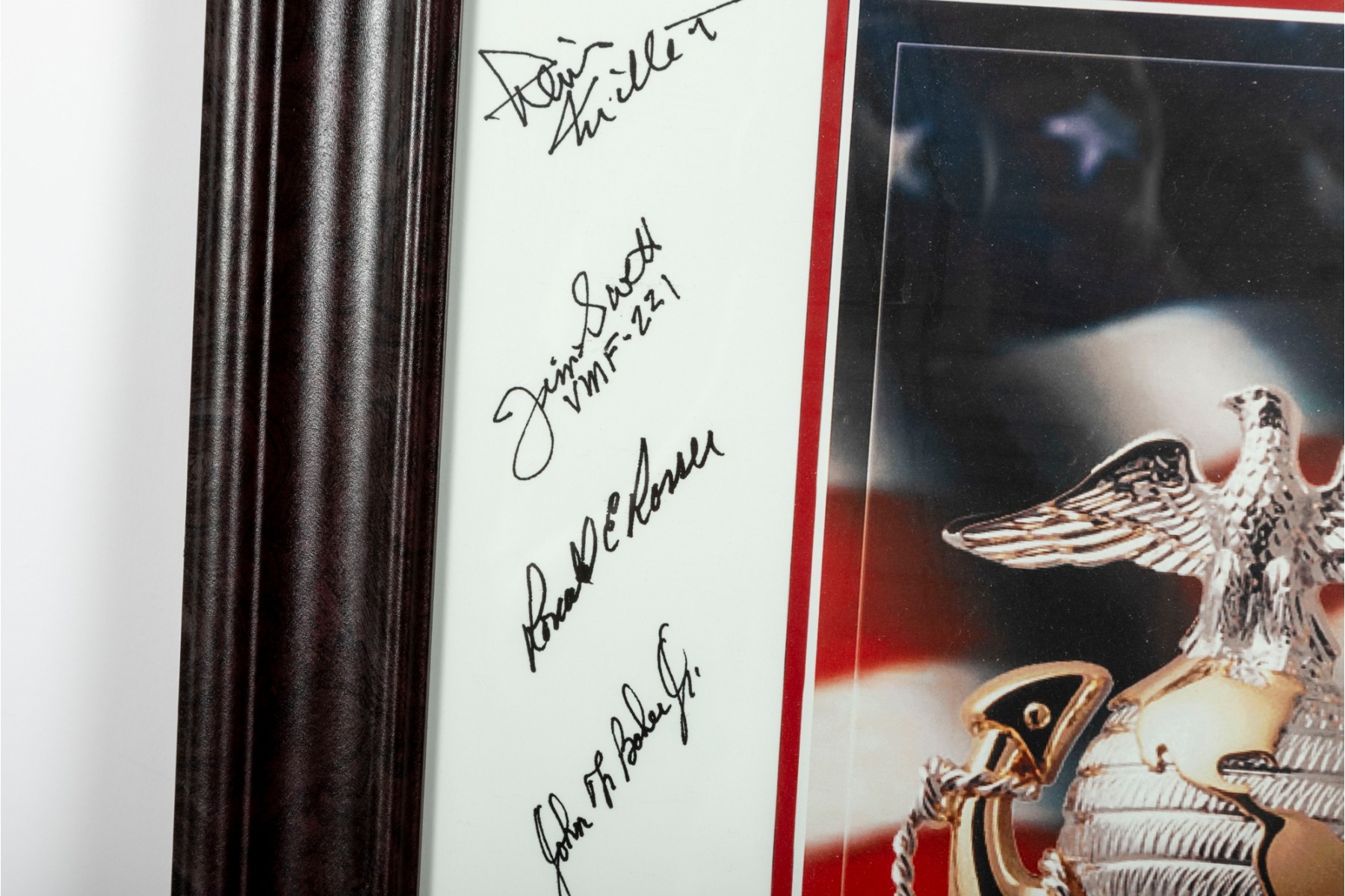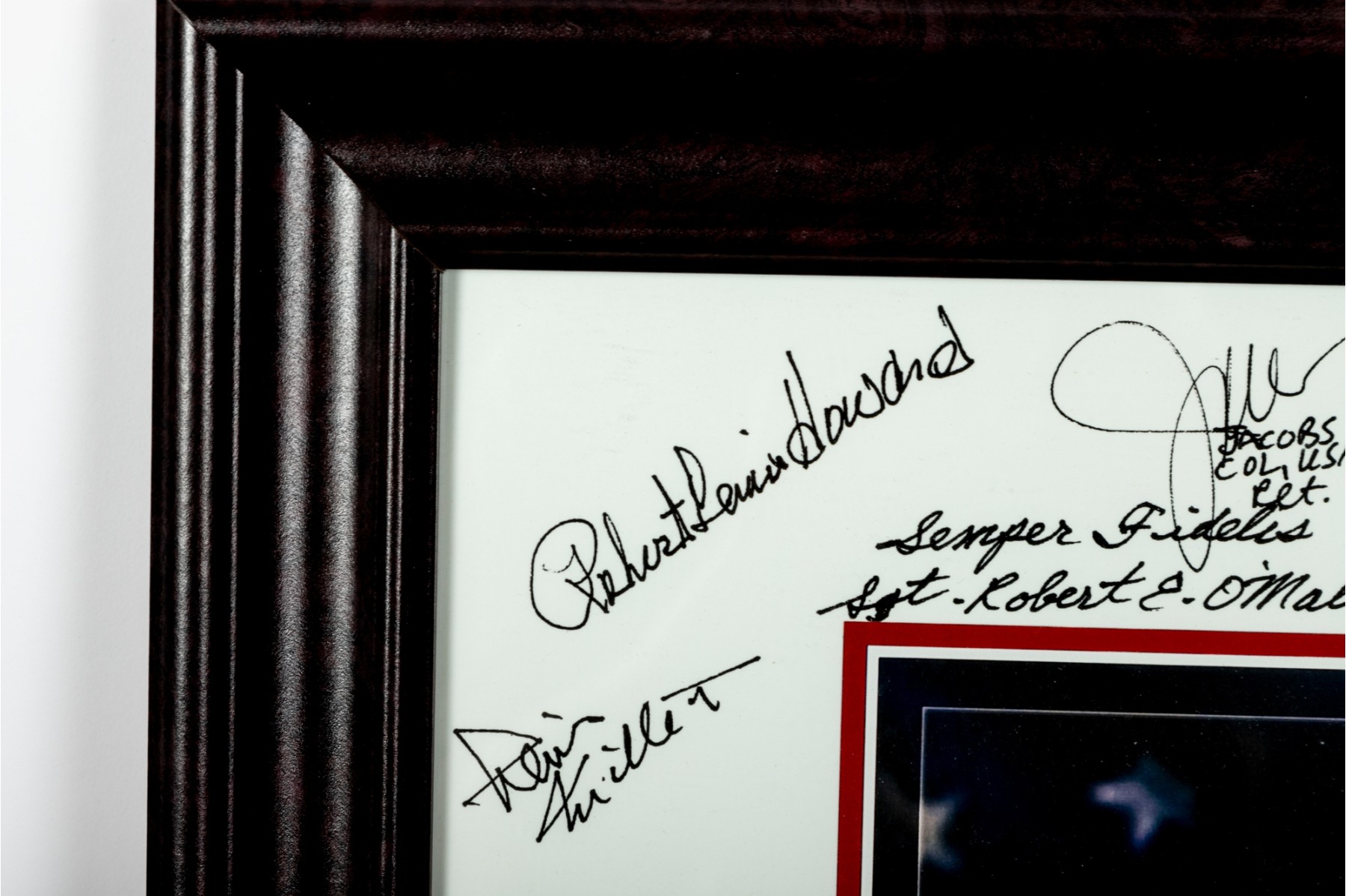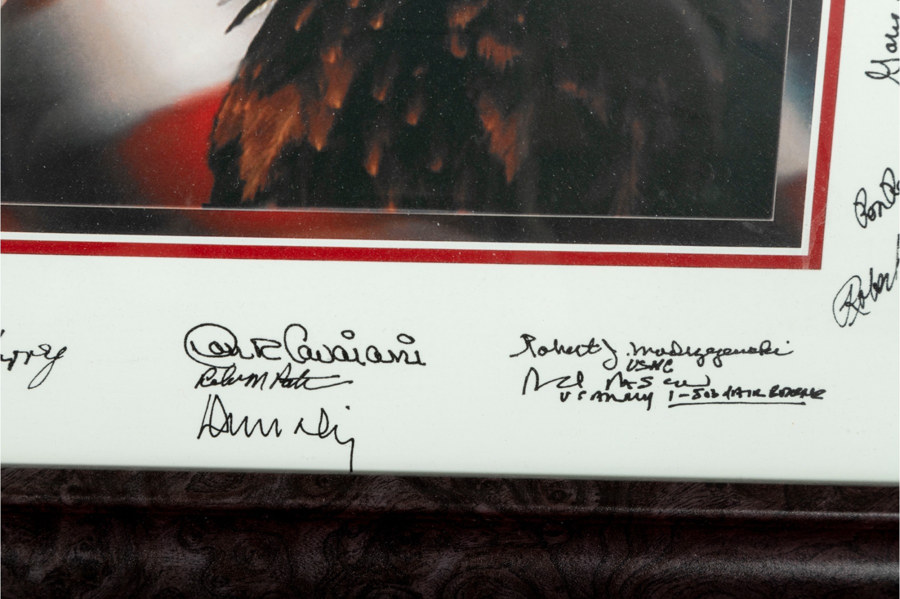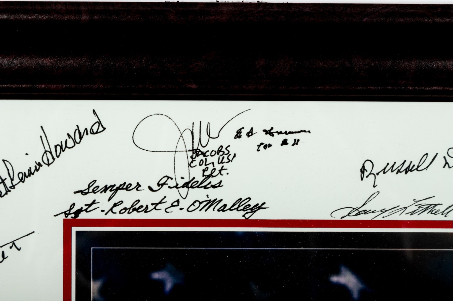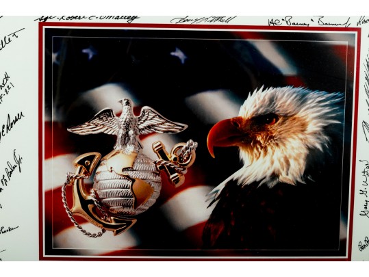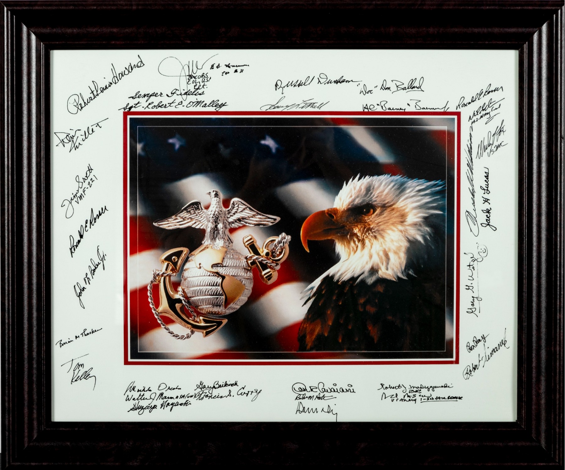 A print depicting A USMC emblem and an eagle in profile against a background of a waving American flag, surrounded by ink signatures from veterans including Sergeant Robert E. O'Malley, "Doc" Colonel Donald Everett Ballard, Jack H. Lucas, and Sgt. Maj. Jon Robert Cavaiani, among many others. Displayed in a dark finished wooden frame.