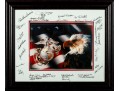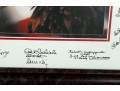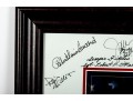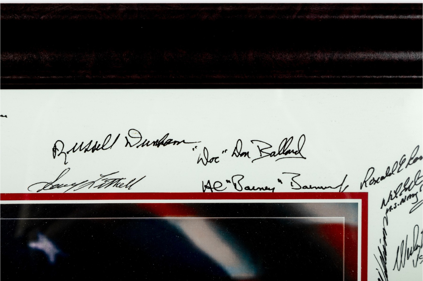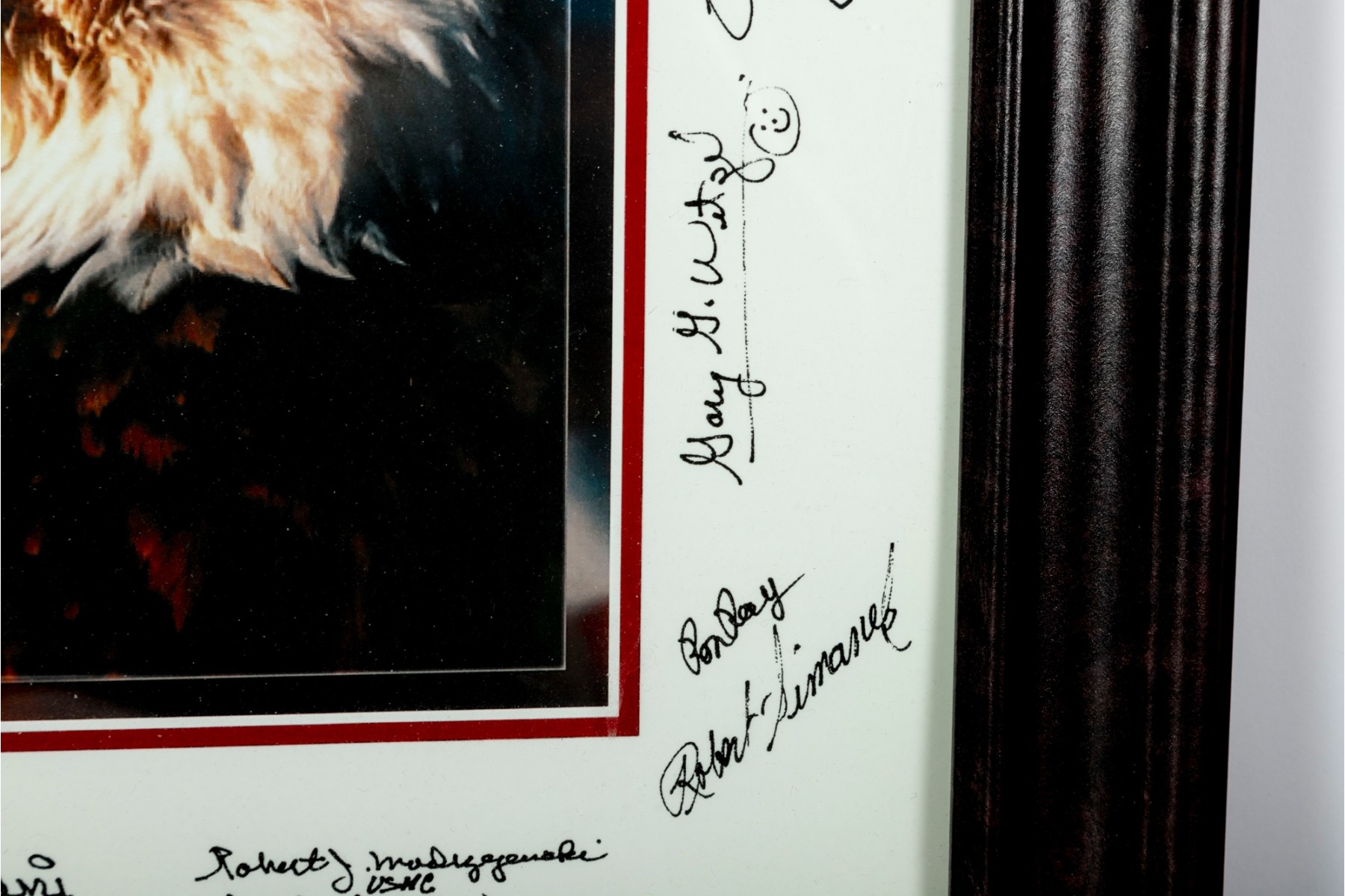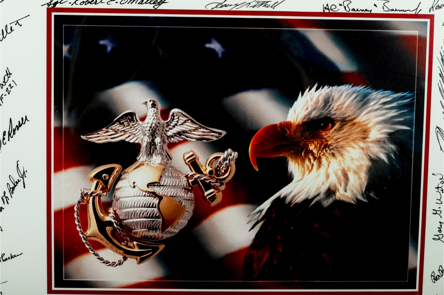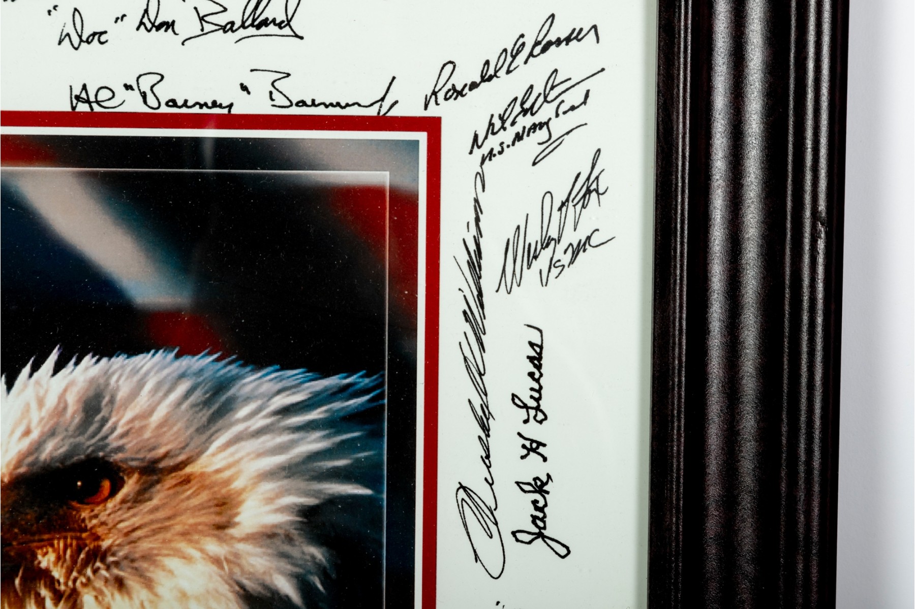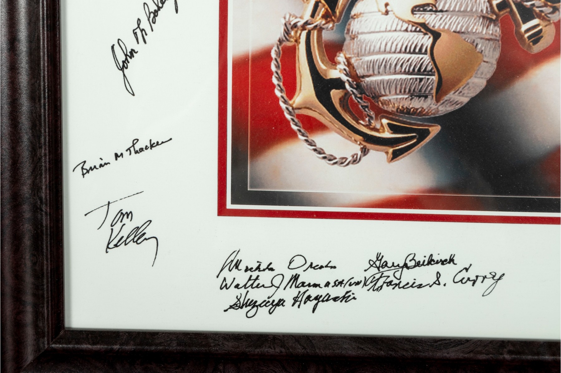A print depicting A USMC emblem and an eagle in profile against a background of a waving American flag, surrounded by ink signatures from veterans including Sergeant Robert E. O'Malley, "Doc" Colonel Donald Everett Ballard, Jack H. Lucas, and Sgt. Maj. Jon Robert Cavaiani, among many others. Displayed in a dark finished wooden frame.