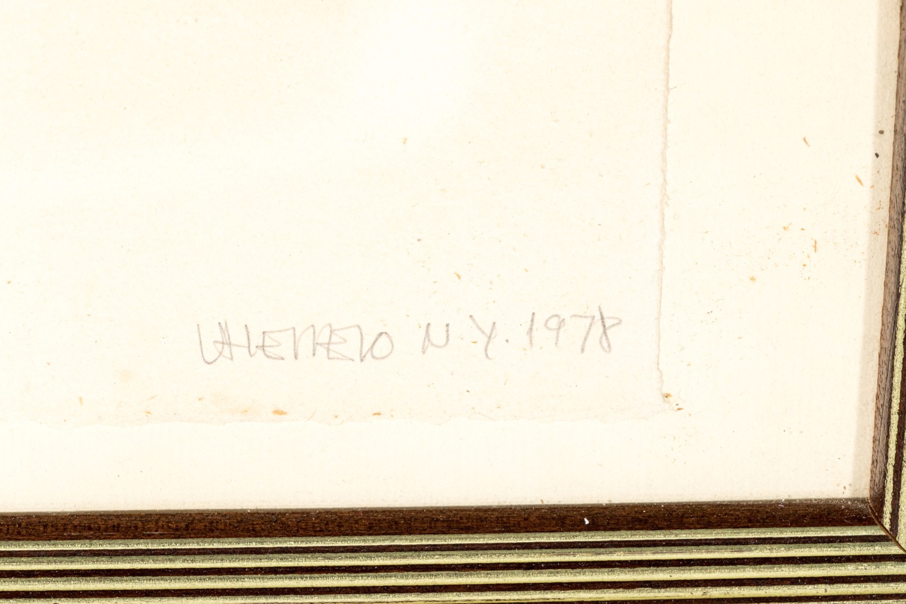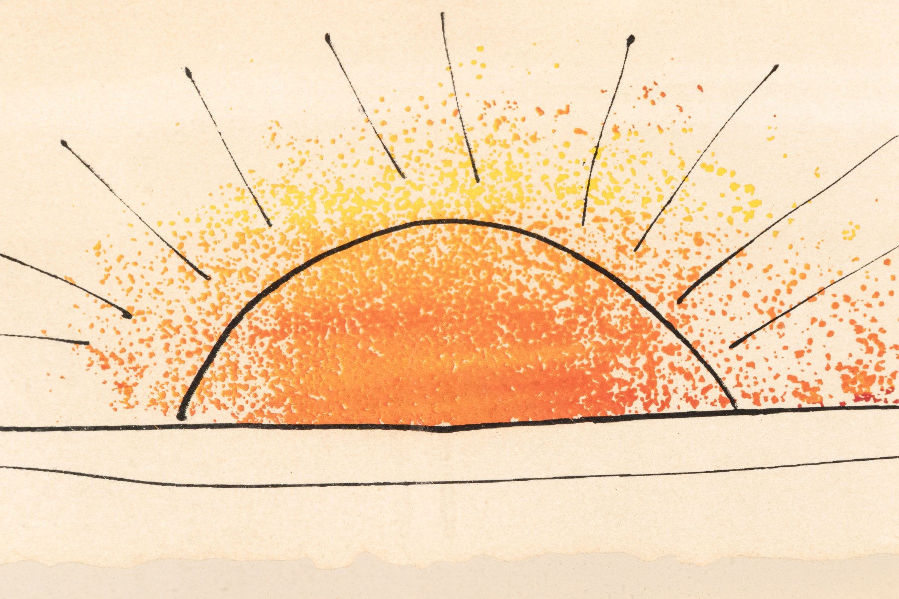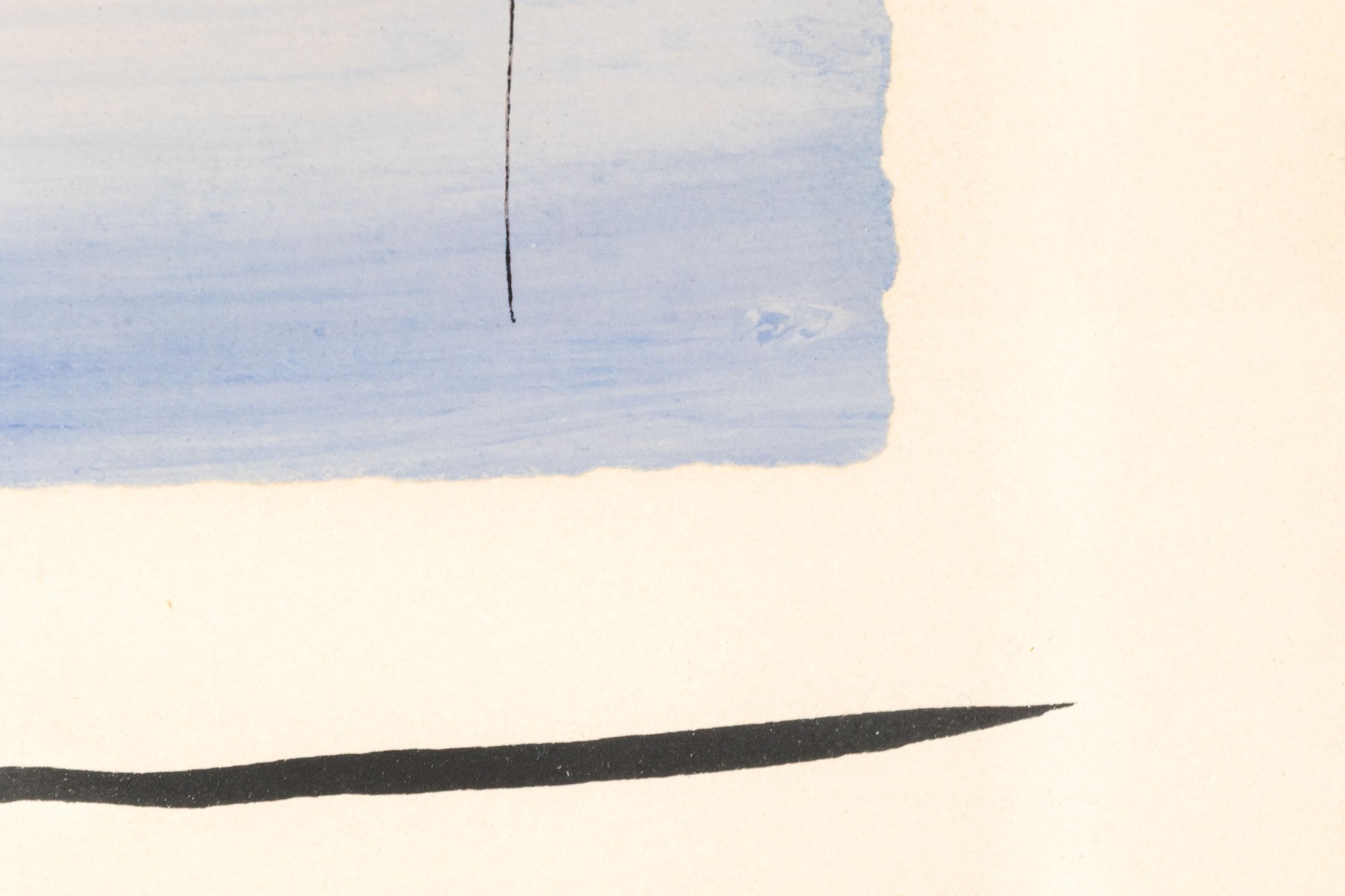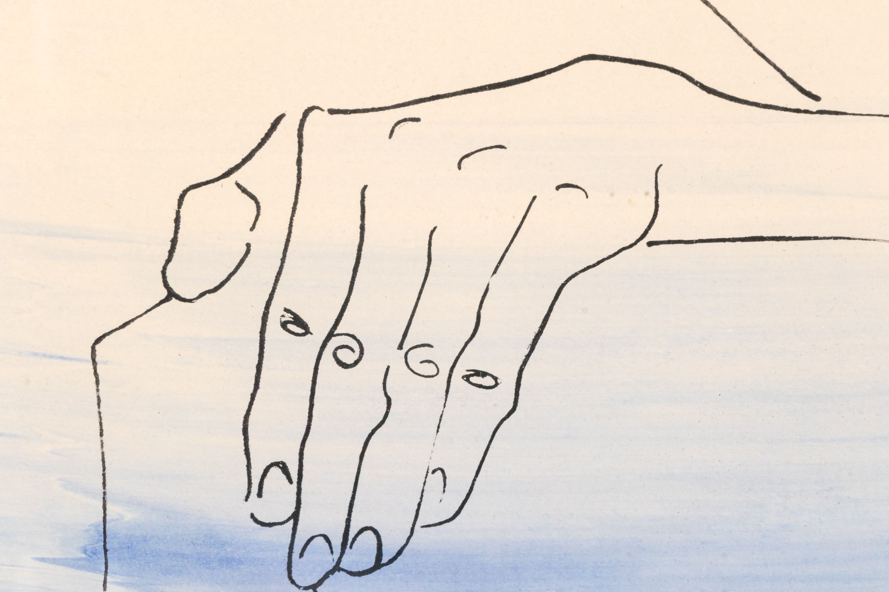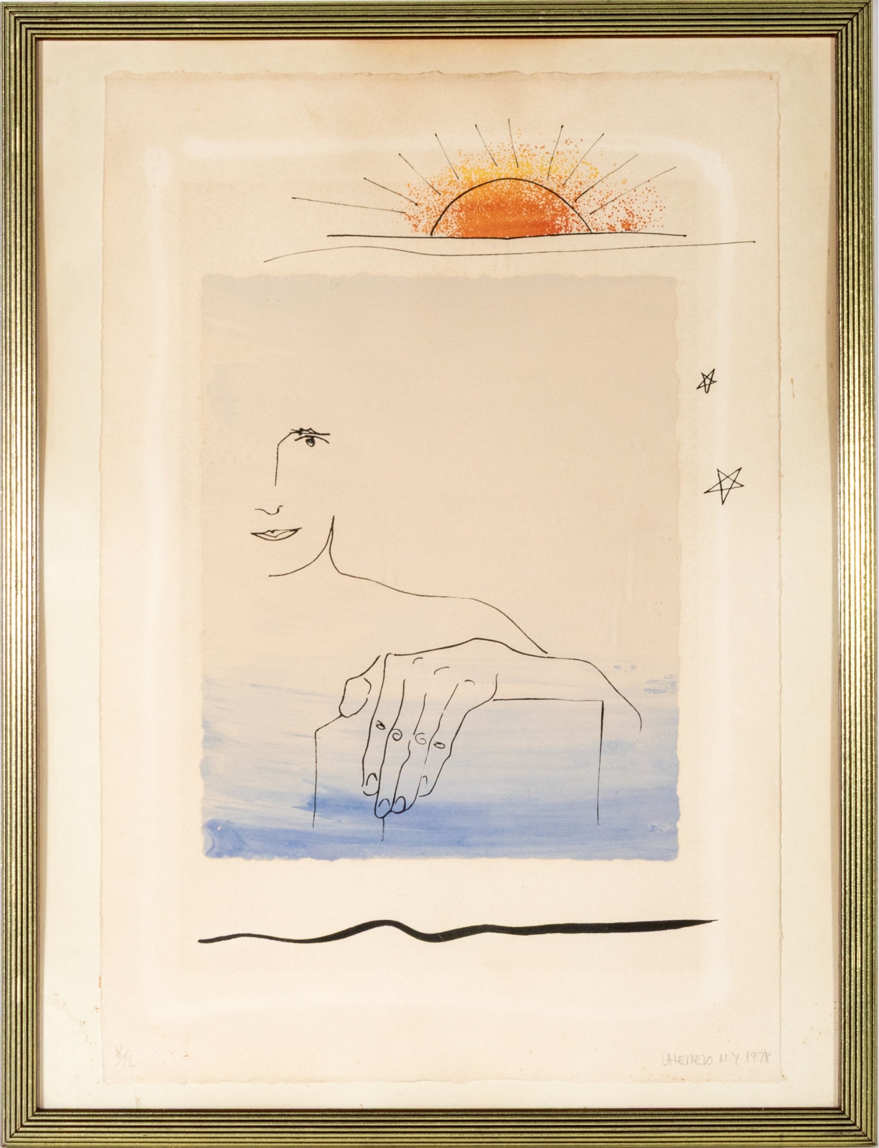Pencil signed what appears to say UHENEVO, N.Y and dated 1978 lower right and pencil editioned 8/12 lower left. The work on paper depicts a line form of the side of a human head with left shoulder and hand appearing to put their fingers into water made by blue swash of color. Above the figure is wonderful orange and yellow color filled sun made by black lines with rays emenating and two stars on the left hand side. A black line of wavy form extends from the right side to the left side under the figure.
