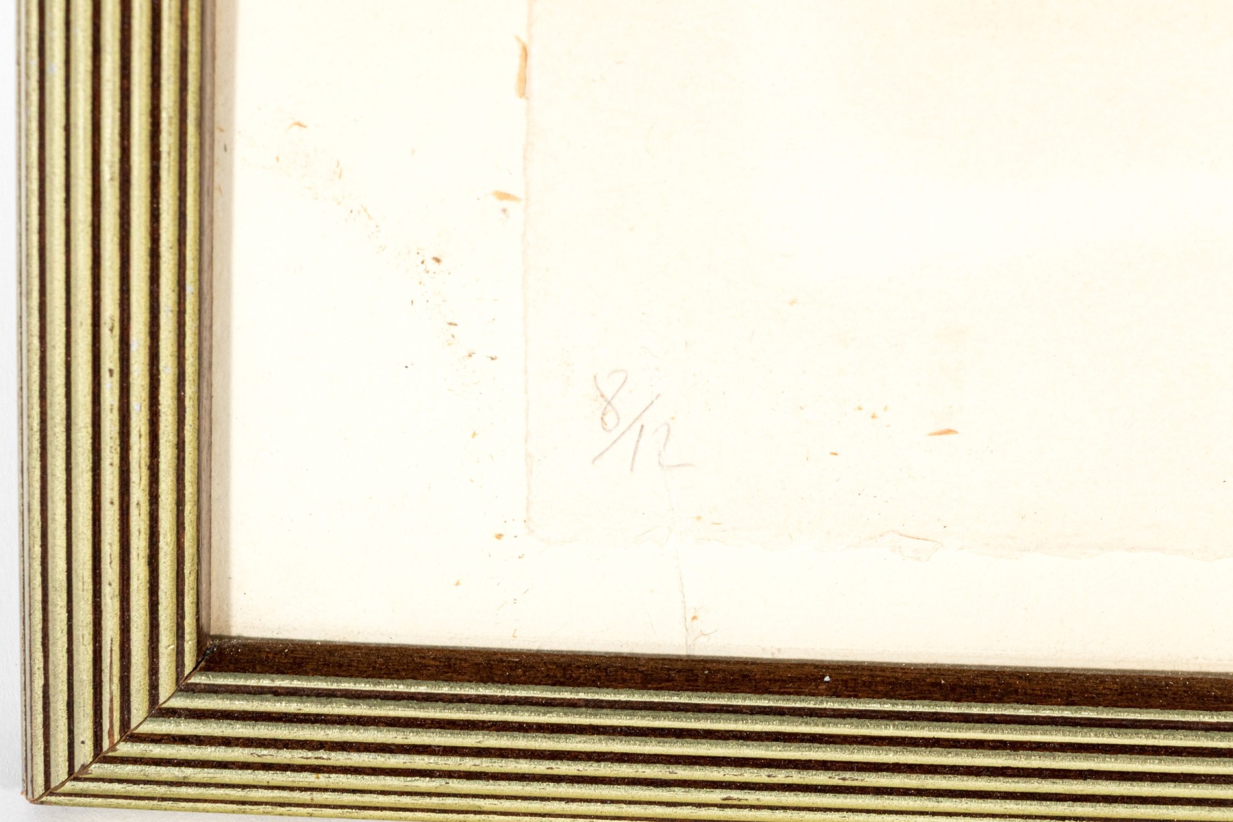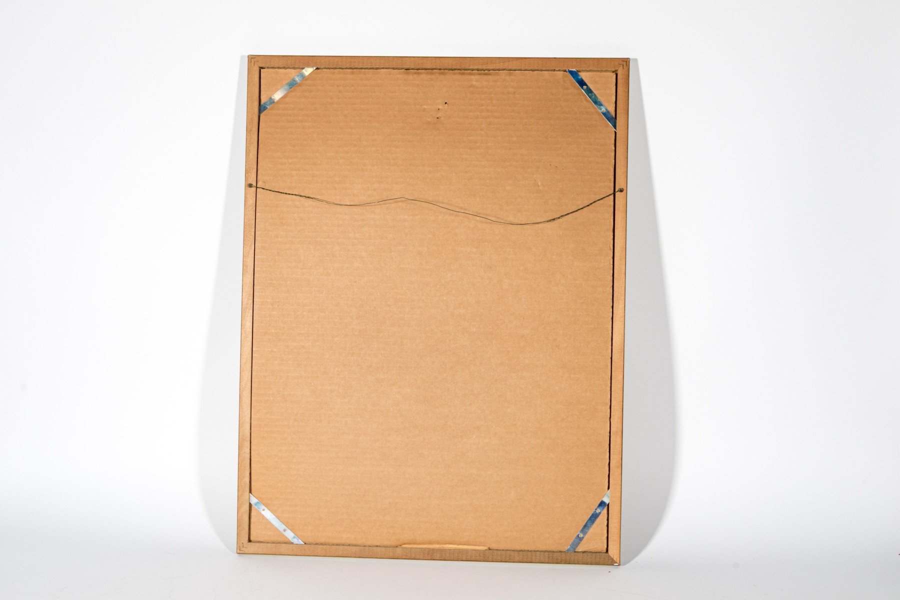 The print is wavy in the frame with the ragged edge being part of the hand-made paper. There is some staining and a white band around where the print may have been previously framed with some staining to the mat commensurate with age and display. Despite wear the surrealist work presents well.