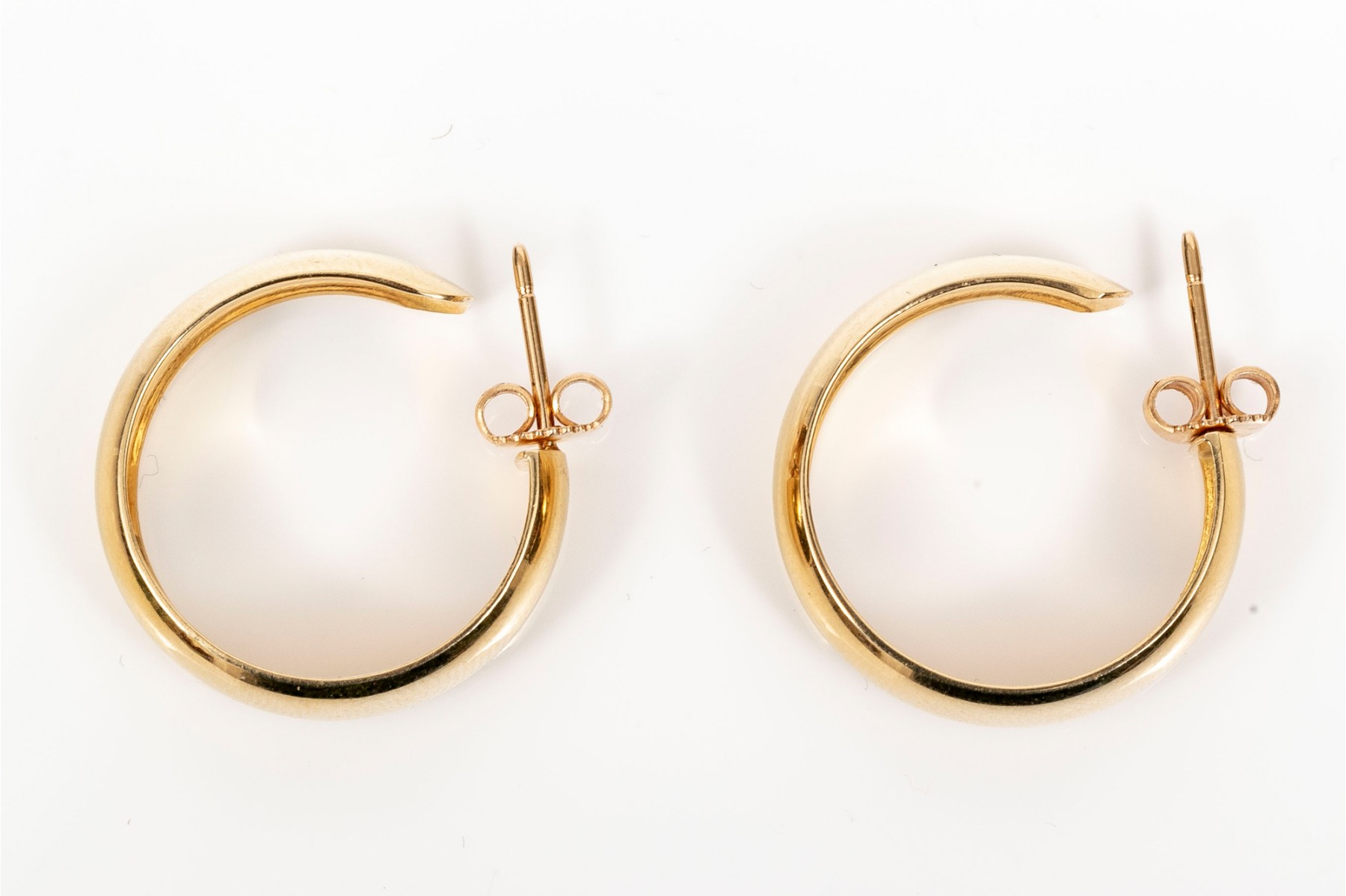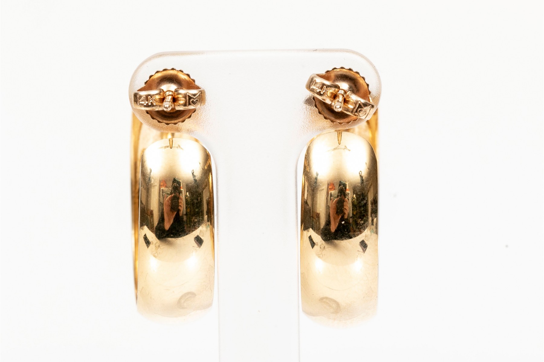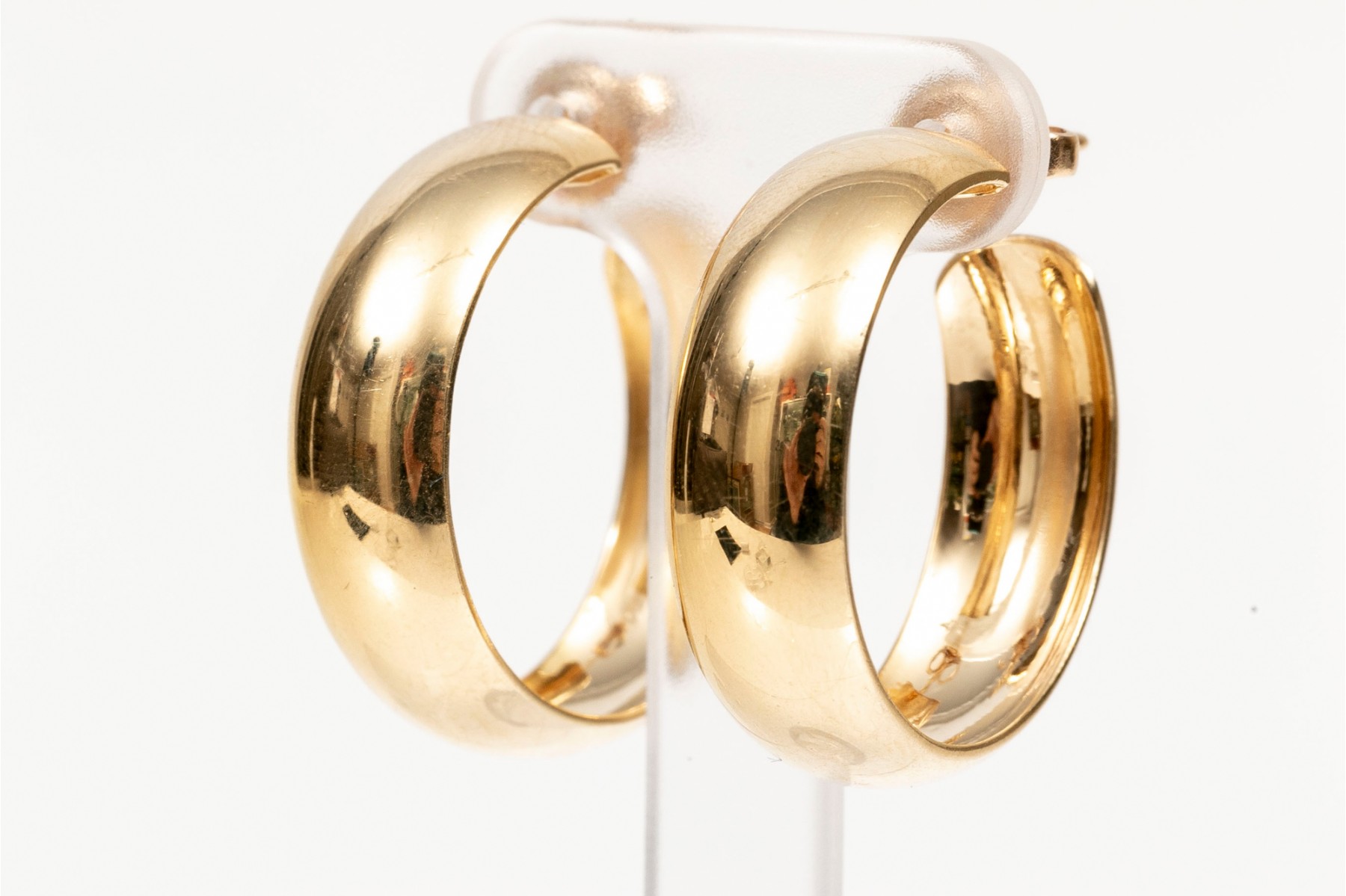Understated pair of 14K yellow gold hoop earrings. Bright polished finish and a domed hoop. Post and clutch backings.