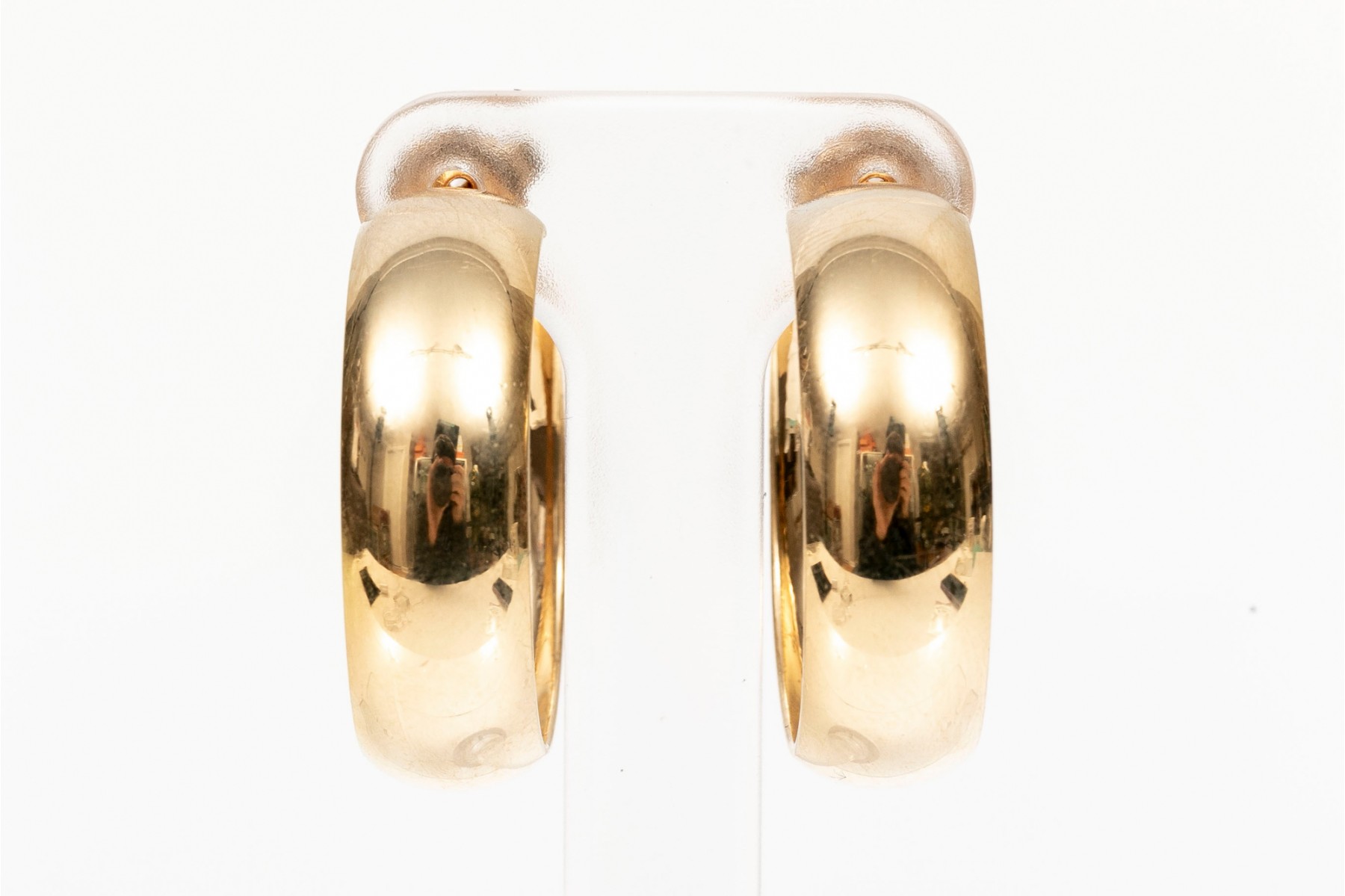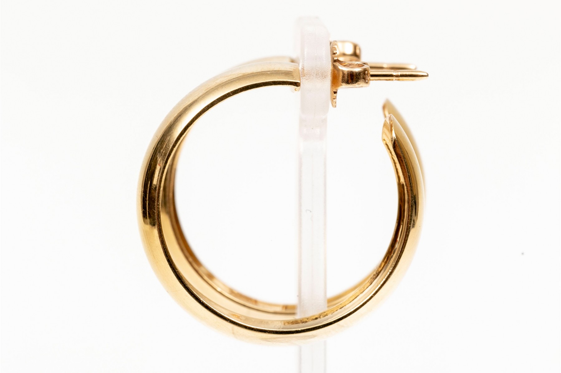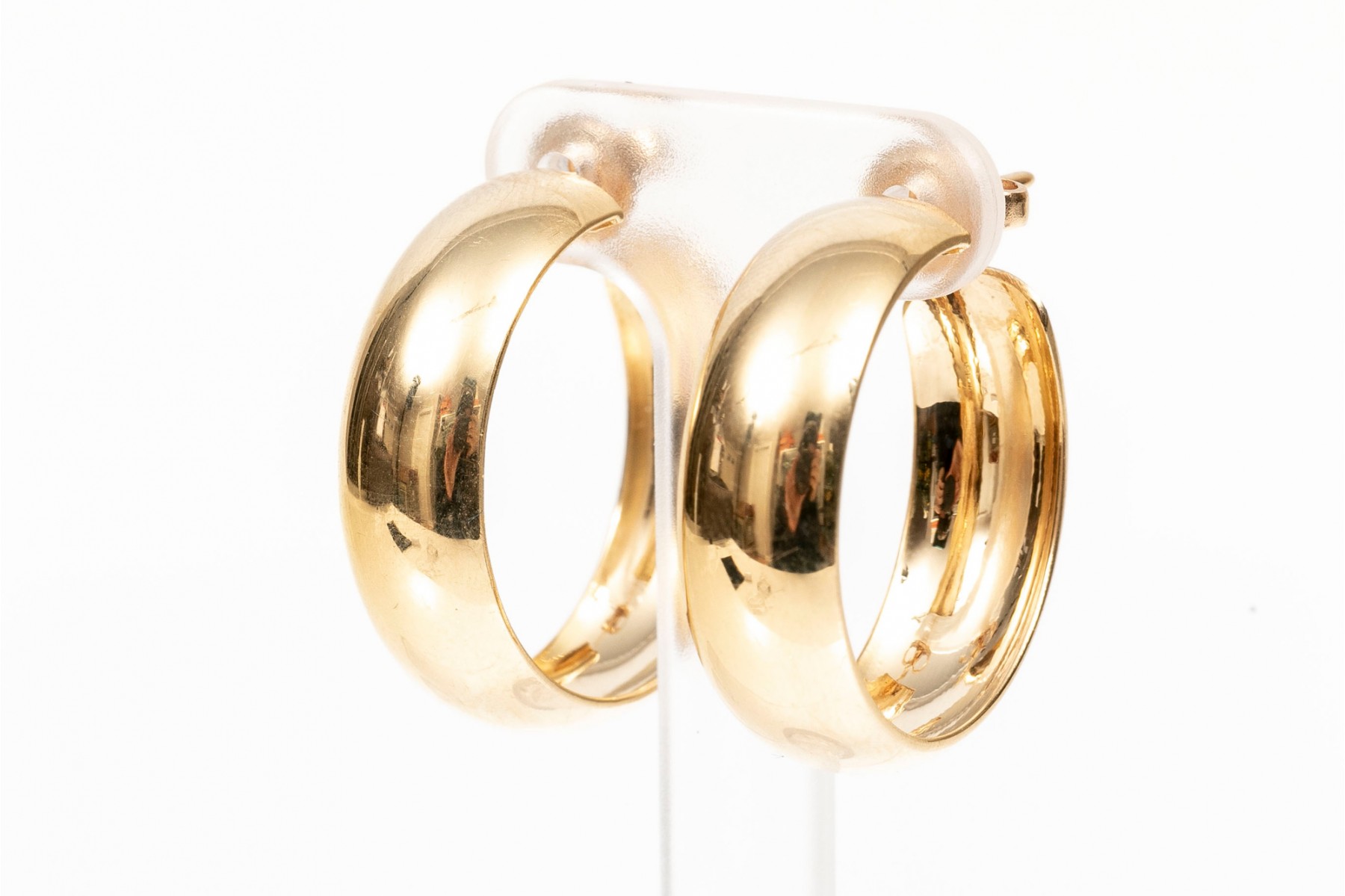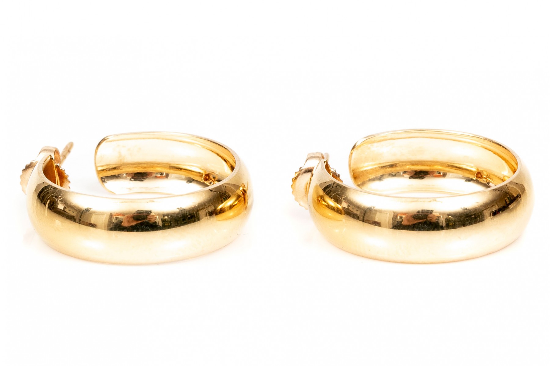 Understated pair of 14K yellow gold hoop earrings. Bright polished finish and a domed hoop. Post and clutch backings.