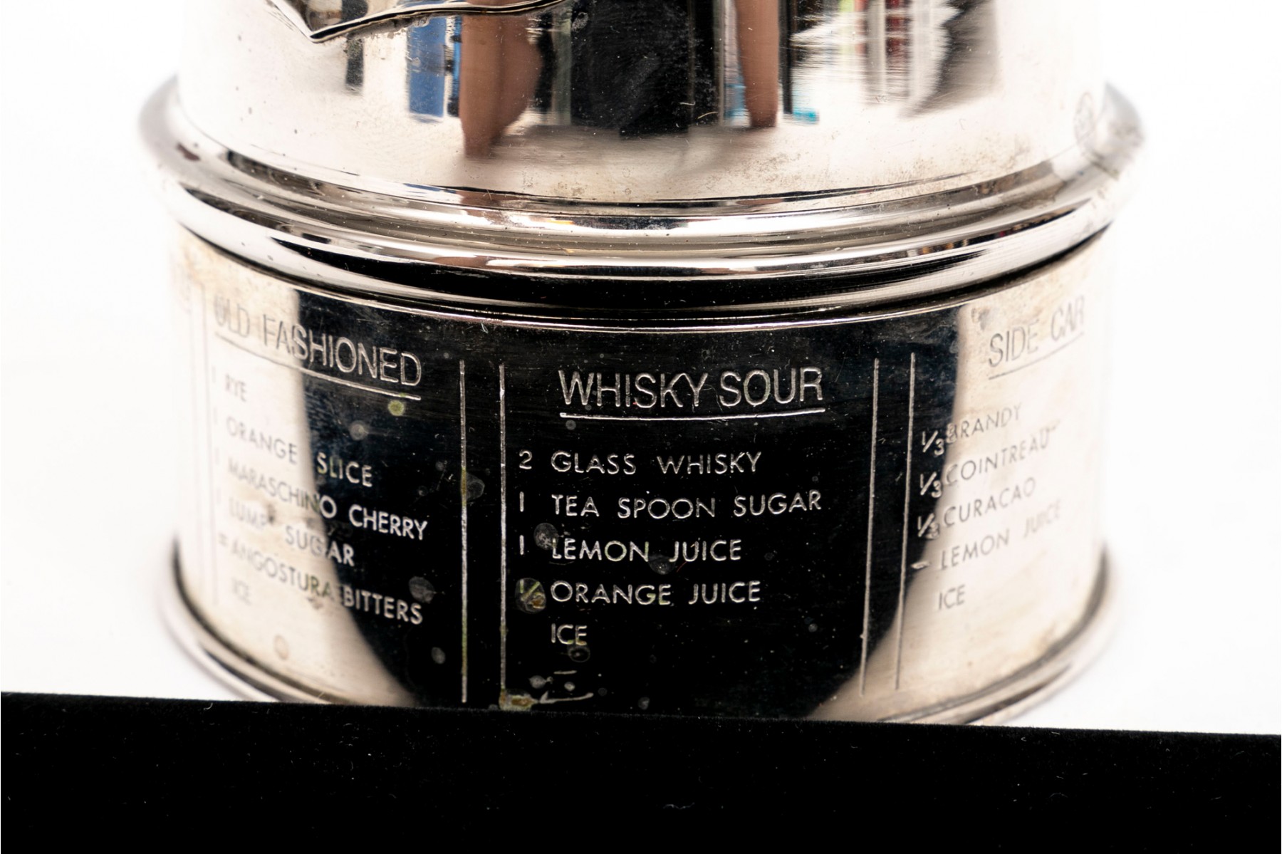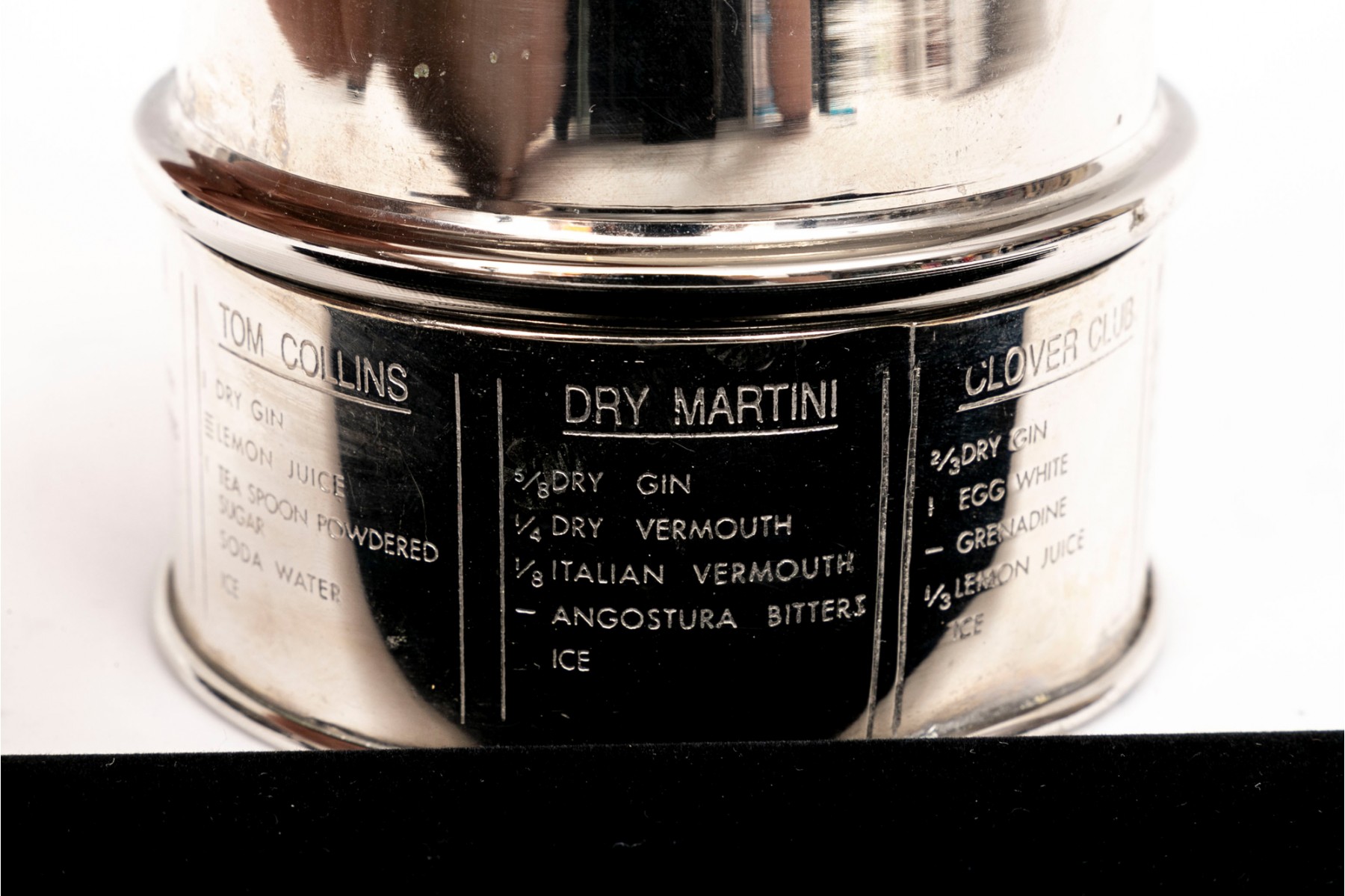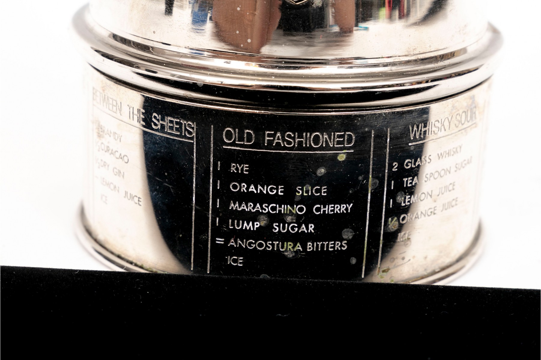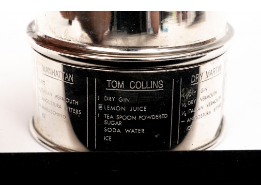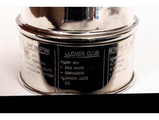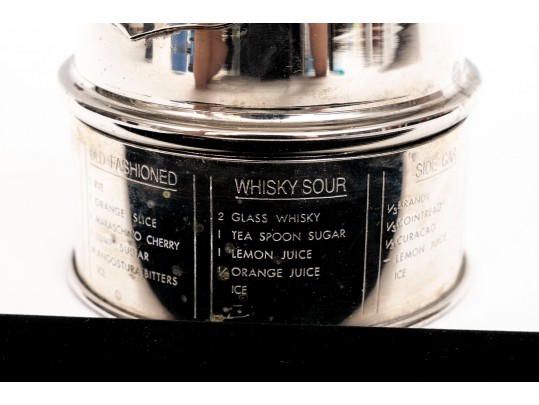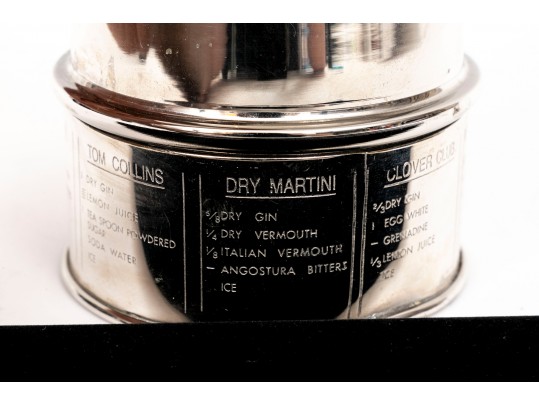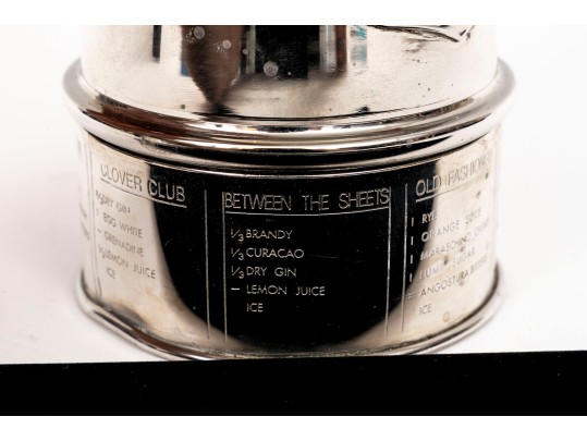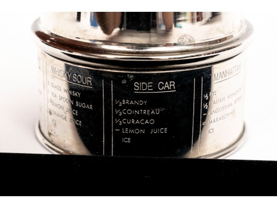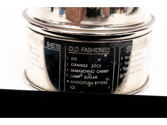Stainless steel drink mixer. The mixer has a rotating bottom displaying instructions for missing classic drinks. Unique addition to your collection.
