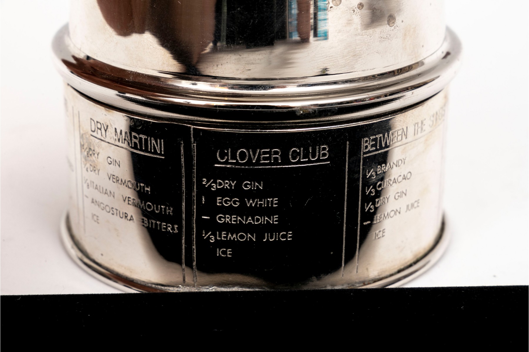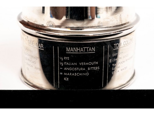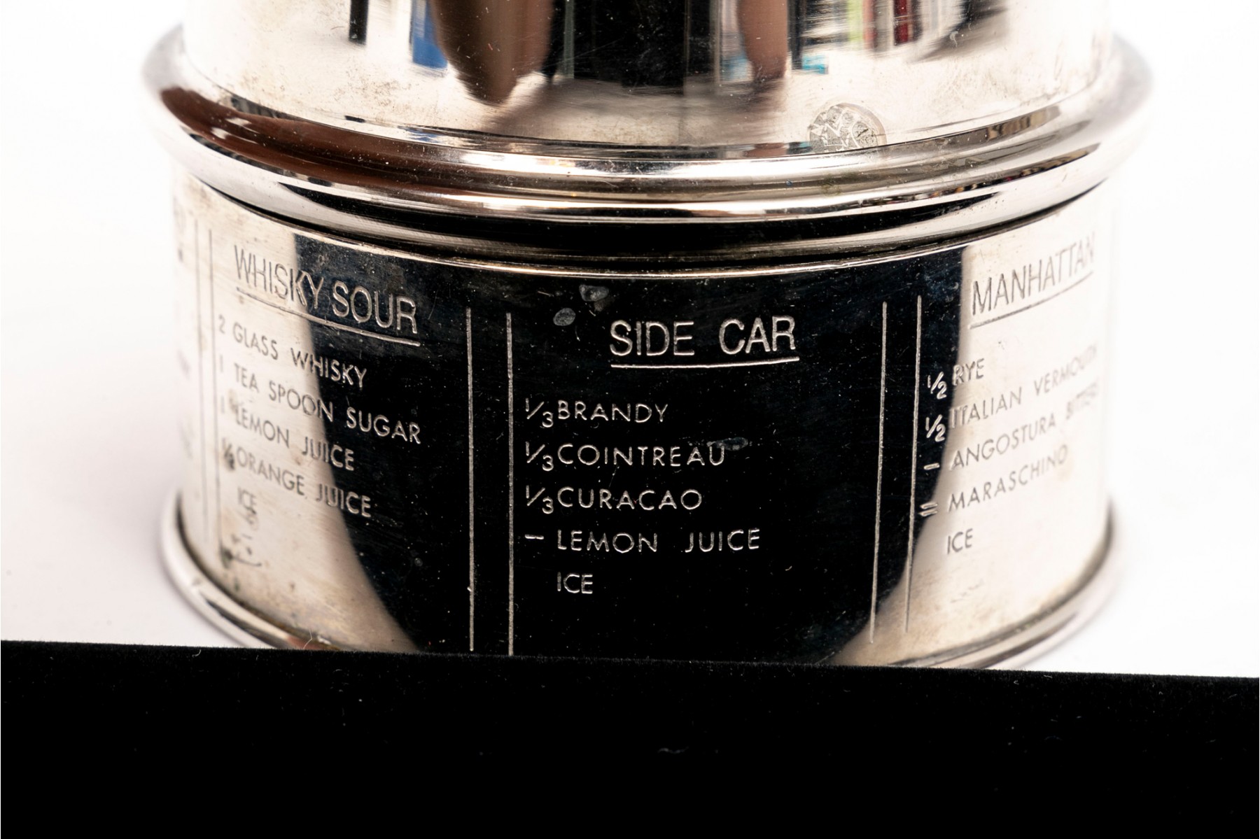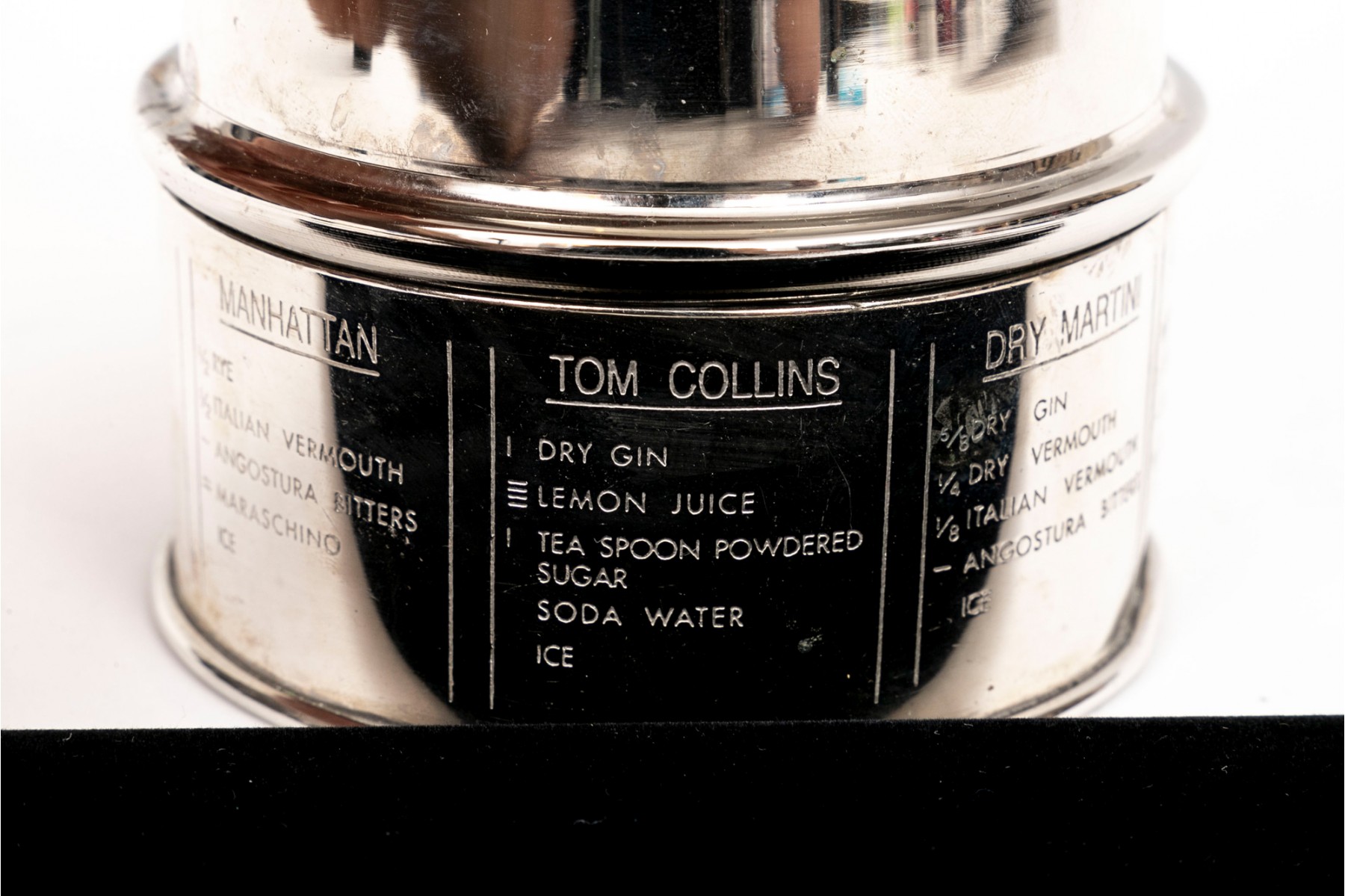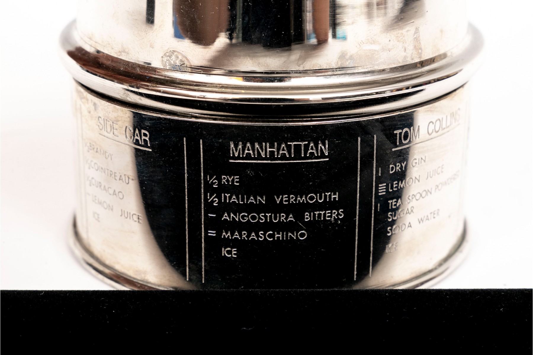 Stainless steel drink mixer. The mixer has a rotating bottom displaying instructions for missing classic drinks. Unique addition to your collection.