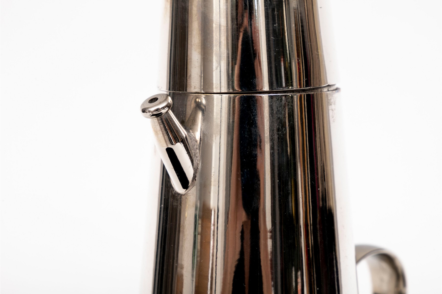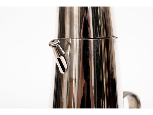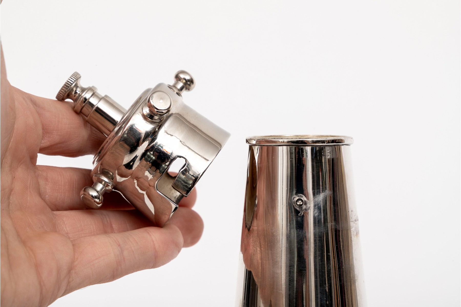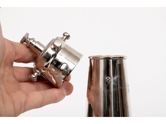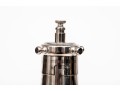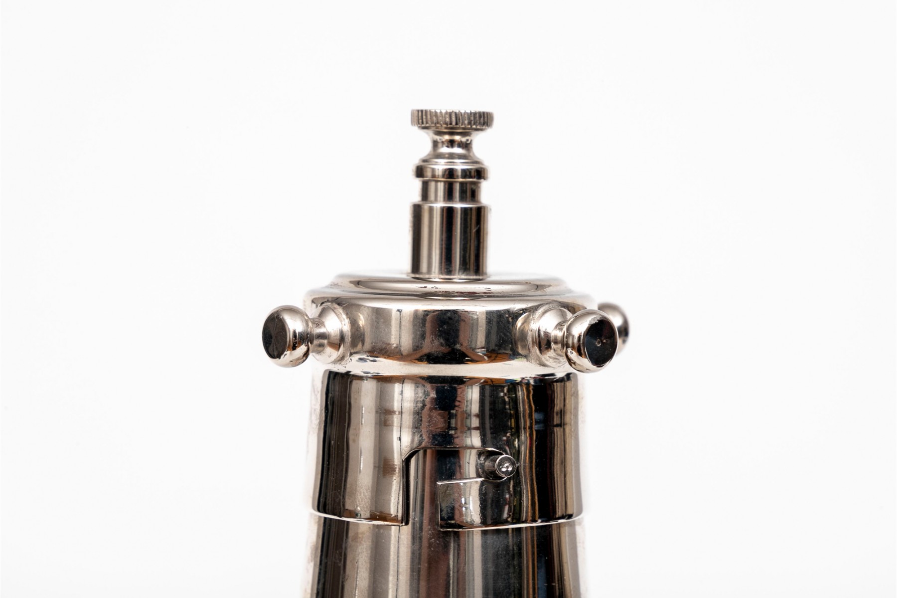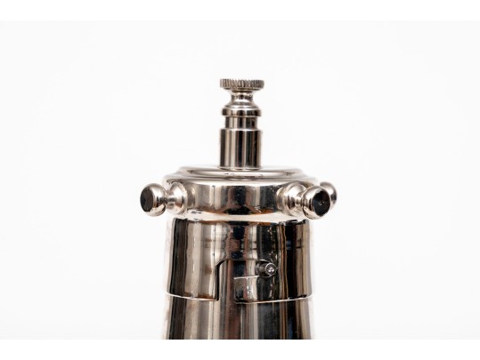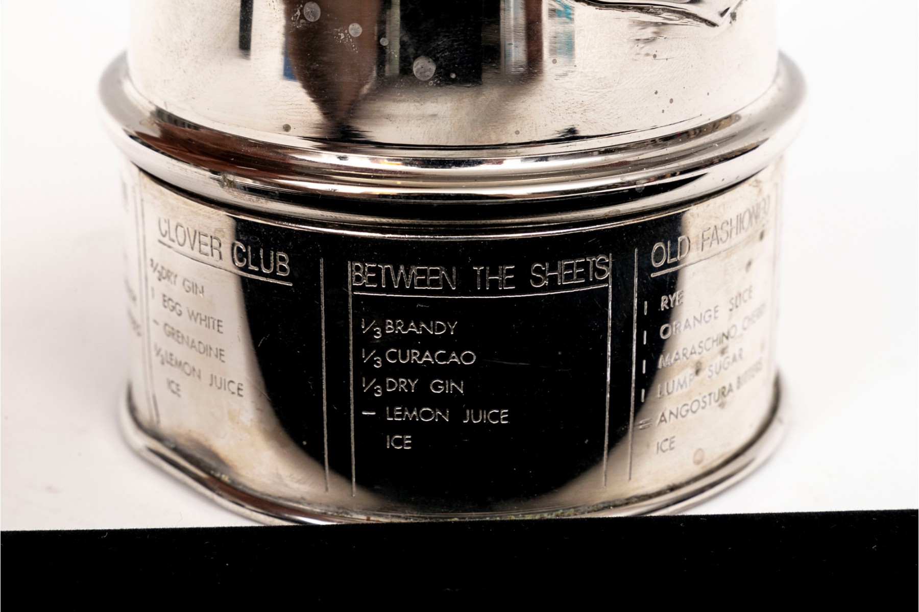 Stainless steel drink mixer. The mixer has a rotating bottom displaying instructions for missing classic drinks. Unique addition to your collection.