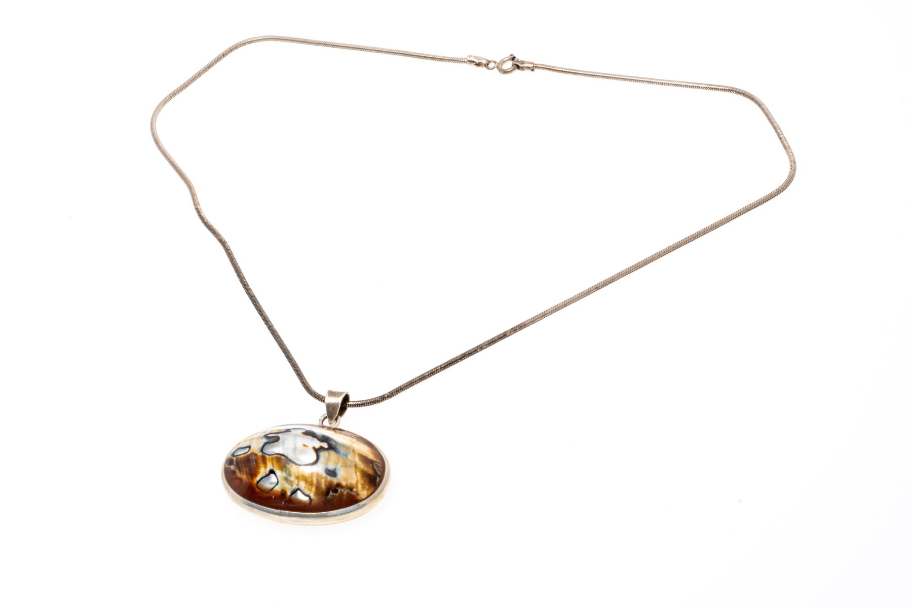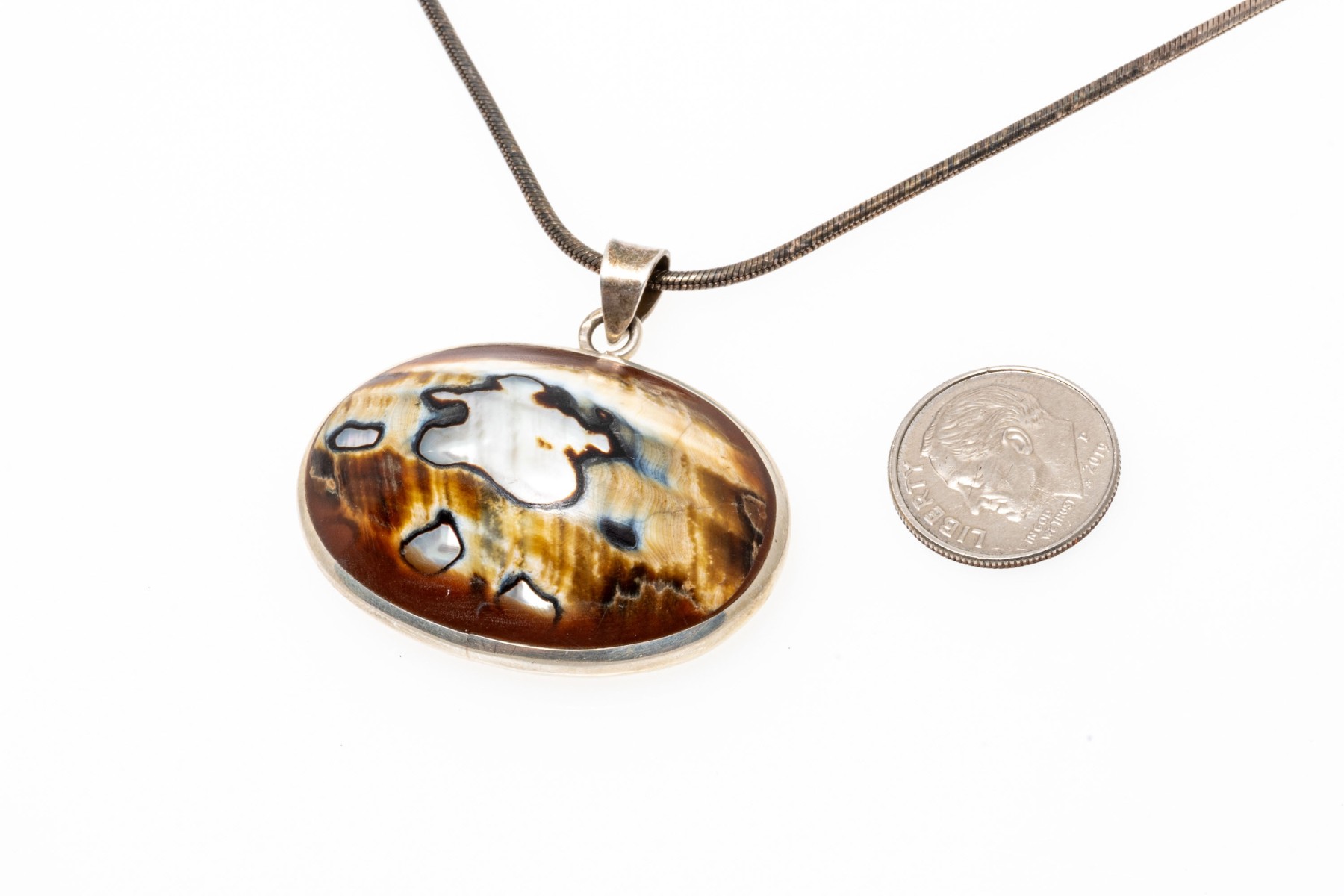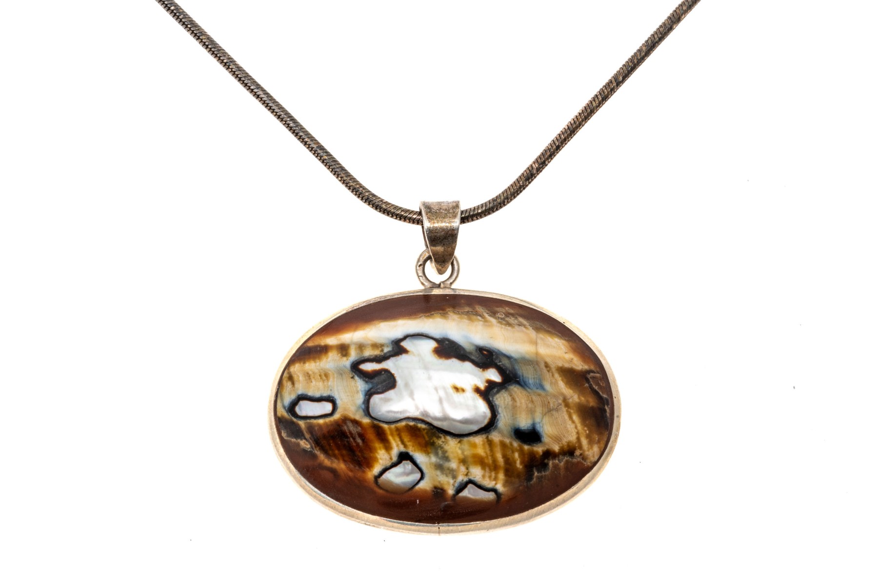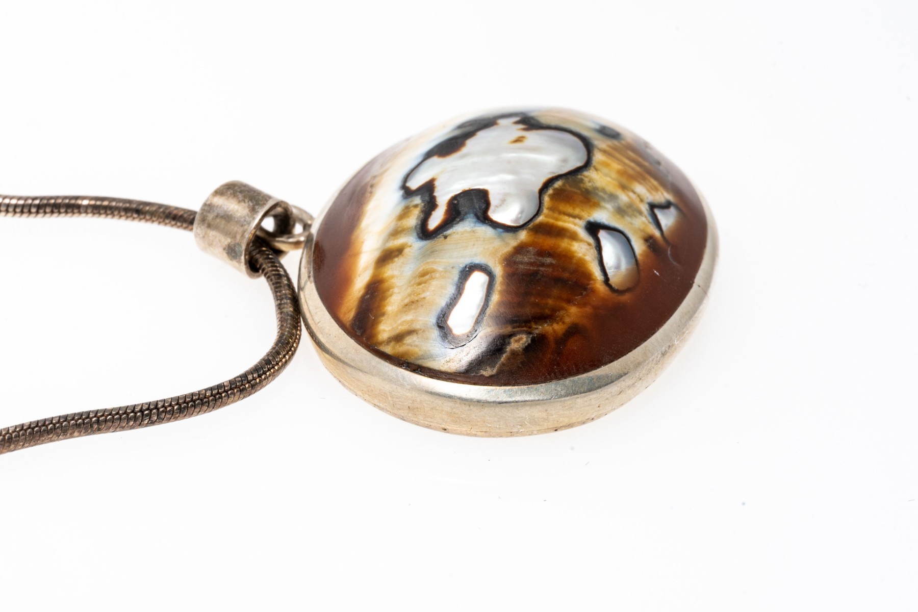 Unique sterling silver pendant necklace. A large mother of pearl pendant is displayed from a snake style chain necklace with a spring ring clasp.