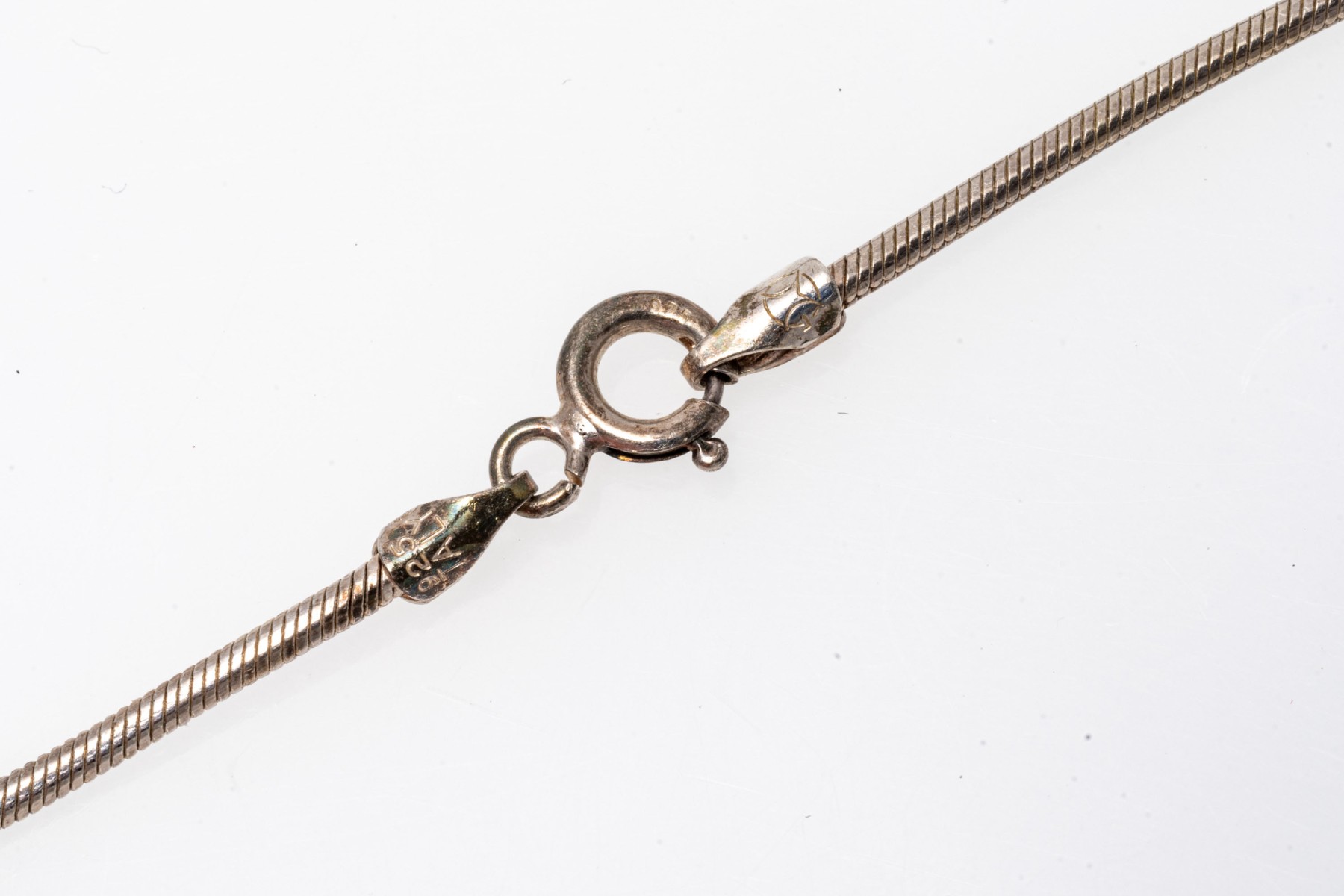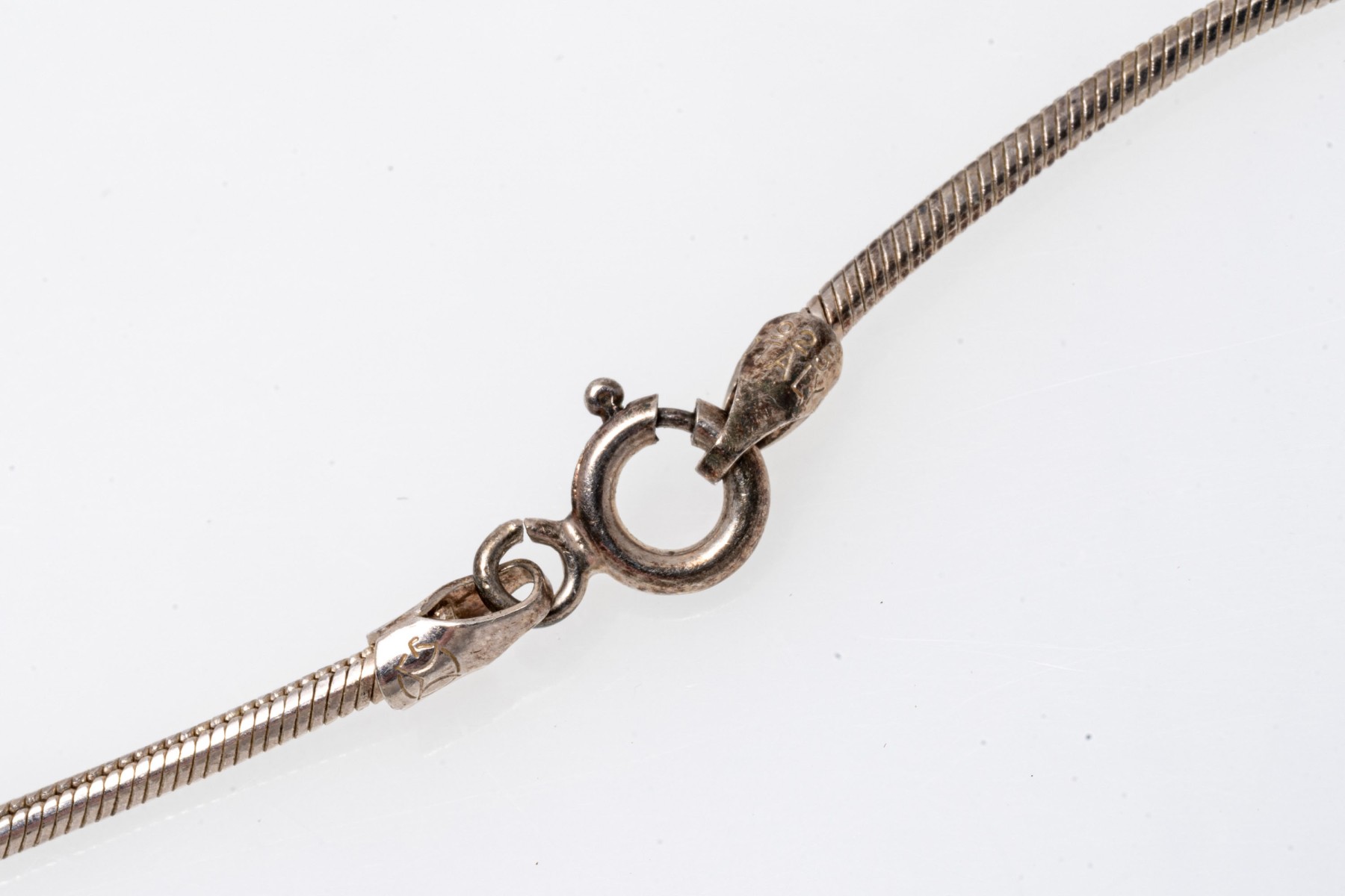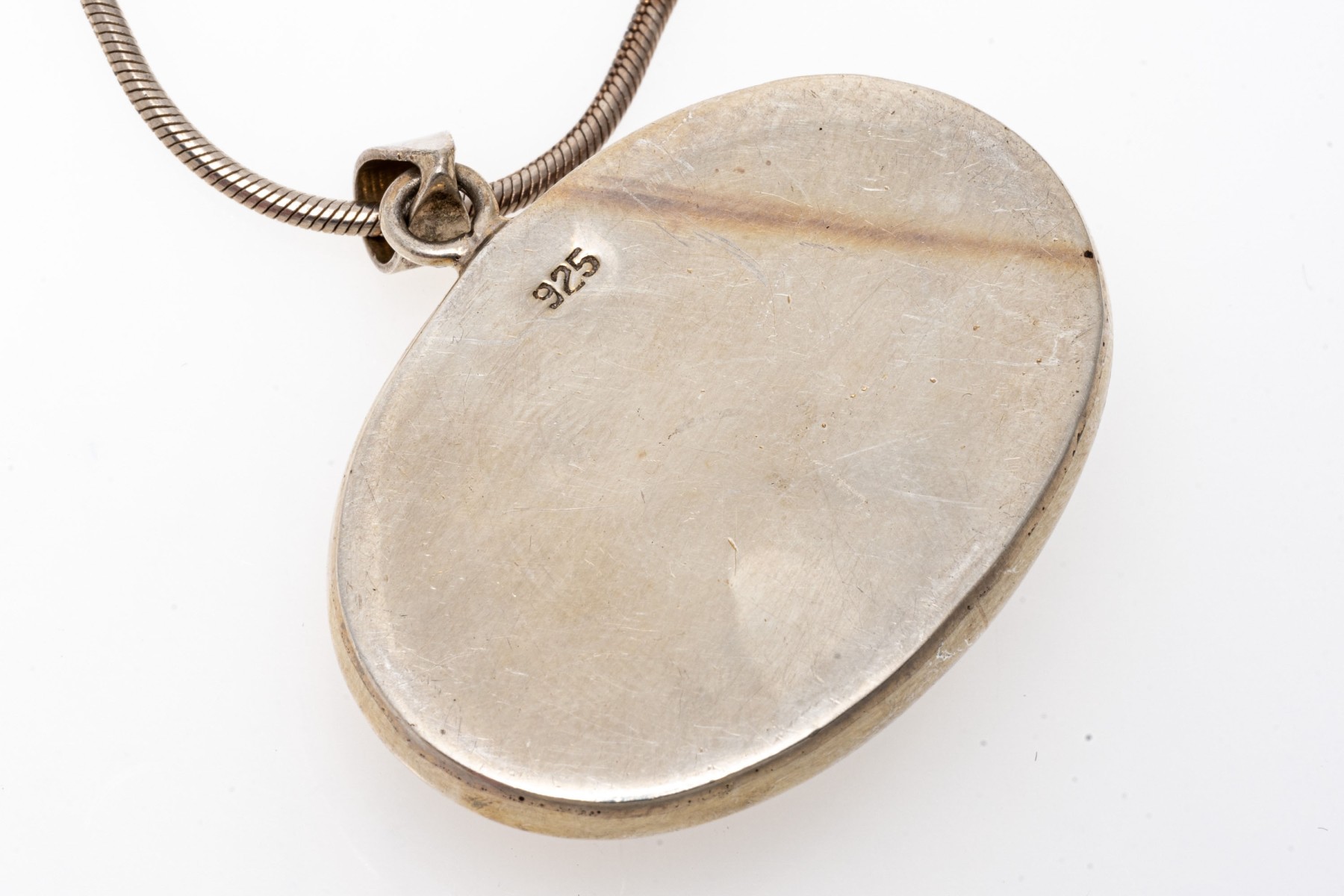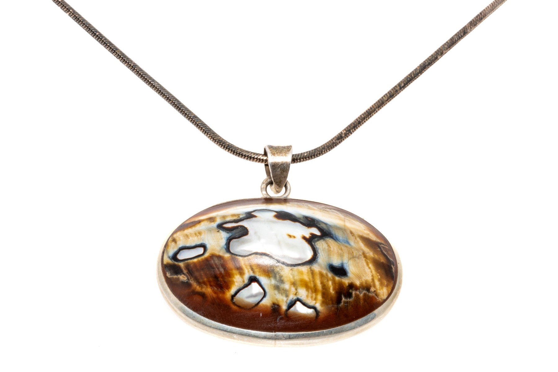 Unique sterling silver pendant necklace. A large mother of pearl pendant is displayed from a snake style chain necklace with a spring ring clasp.