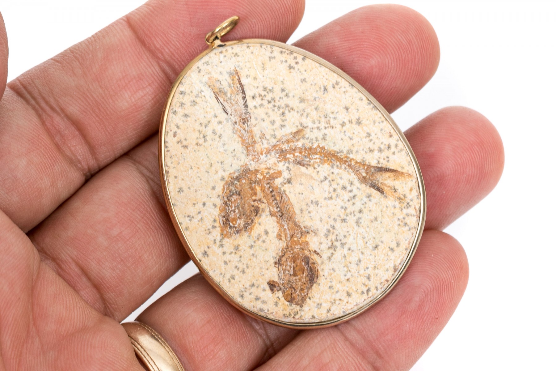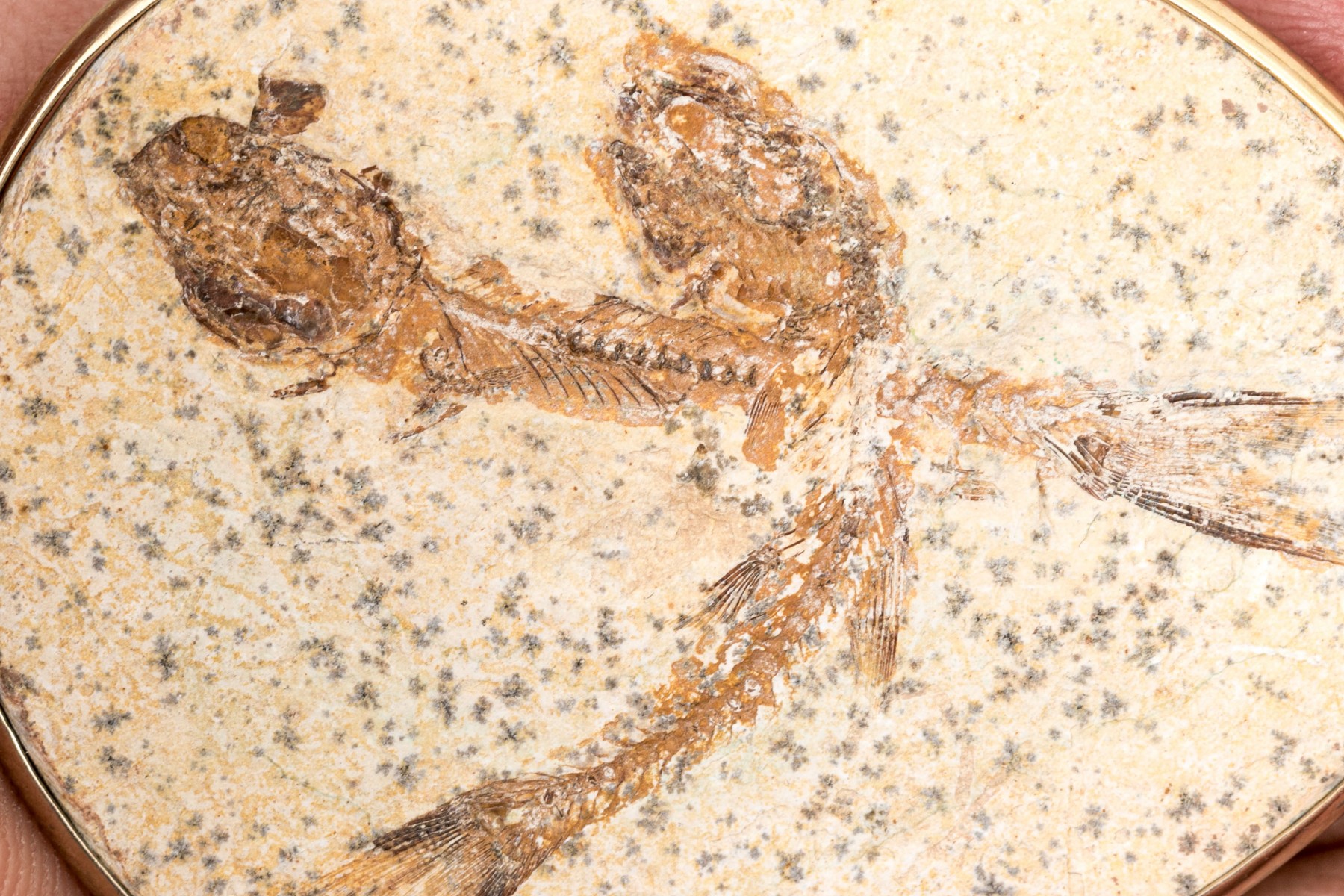 Stone cut and polished displaying two overlapping fish fossils set within a metallic frame.