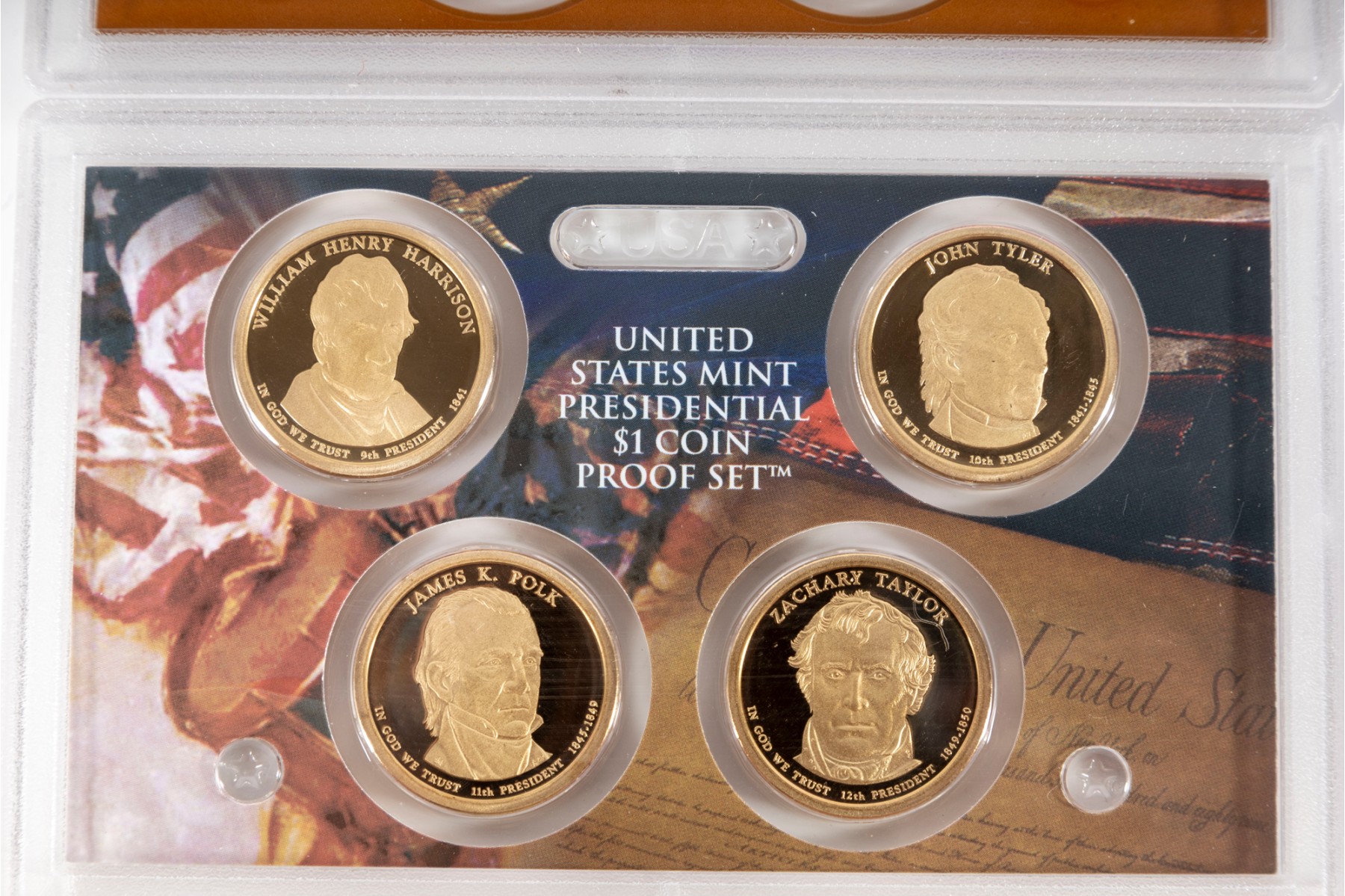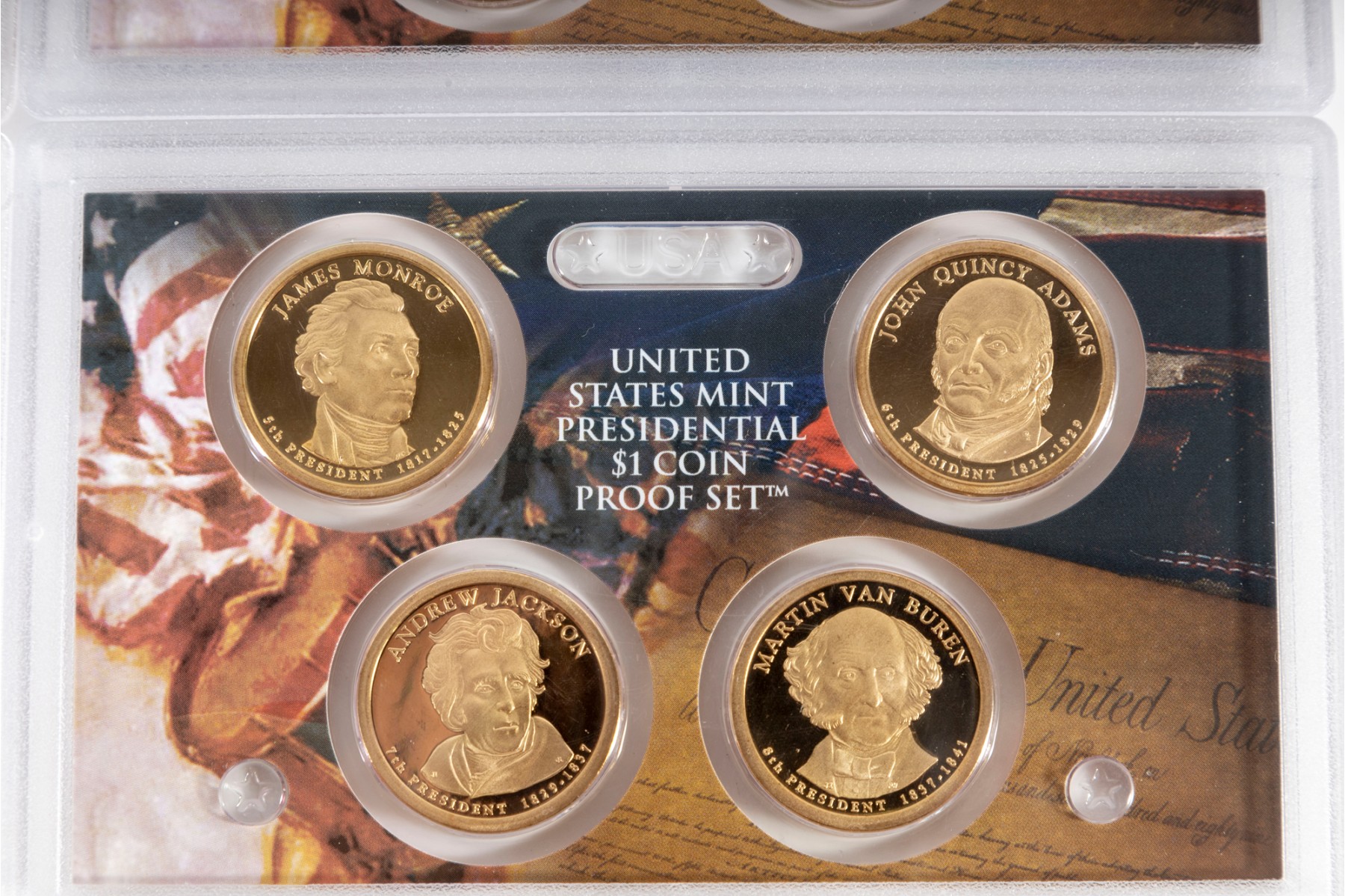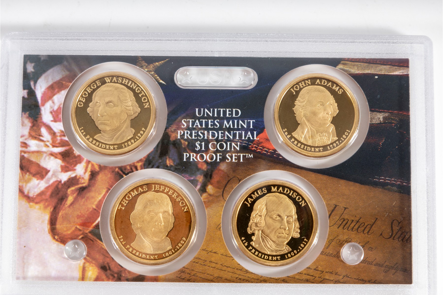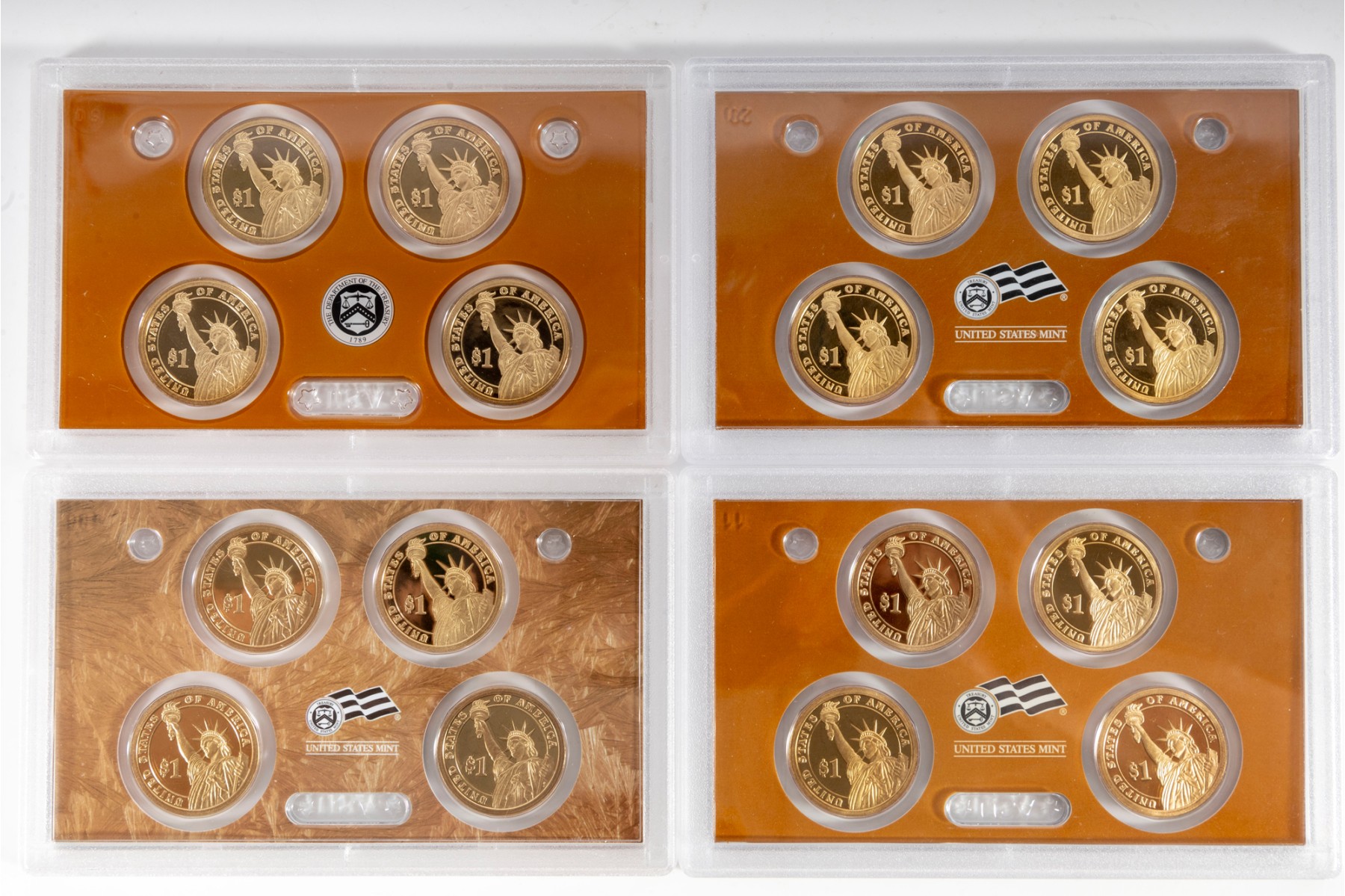 This collection features four United States Mint Presidential Dollar Coin Proof Sets, each containing beautifully struck coins that honor past U.S. presidents. Each set contains four coins.