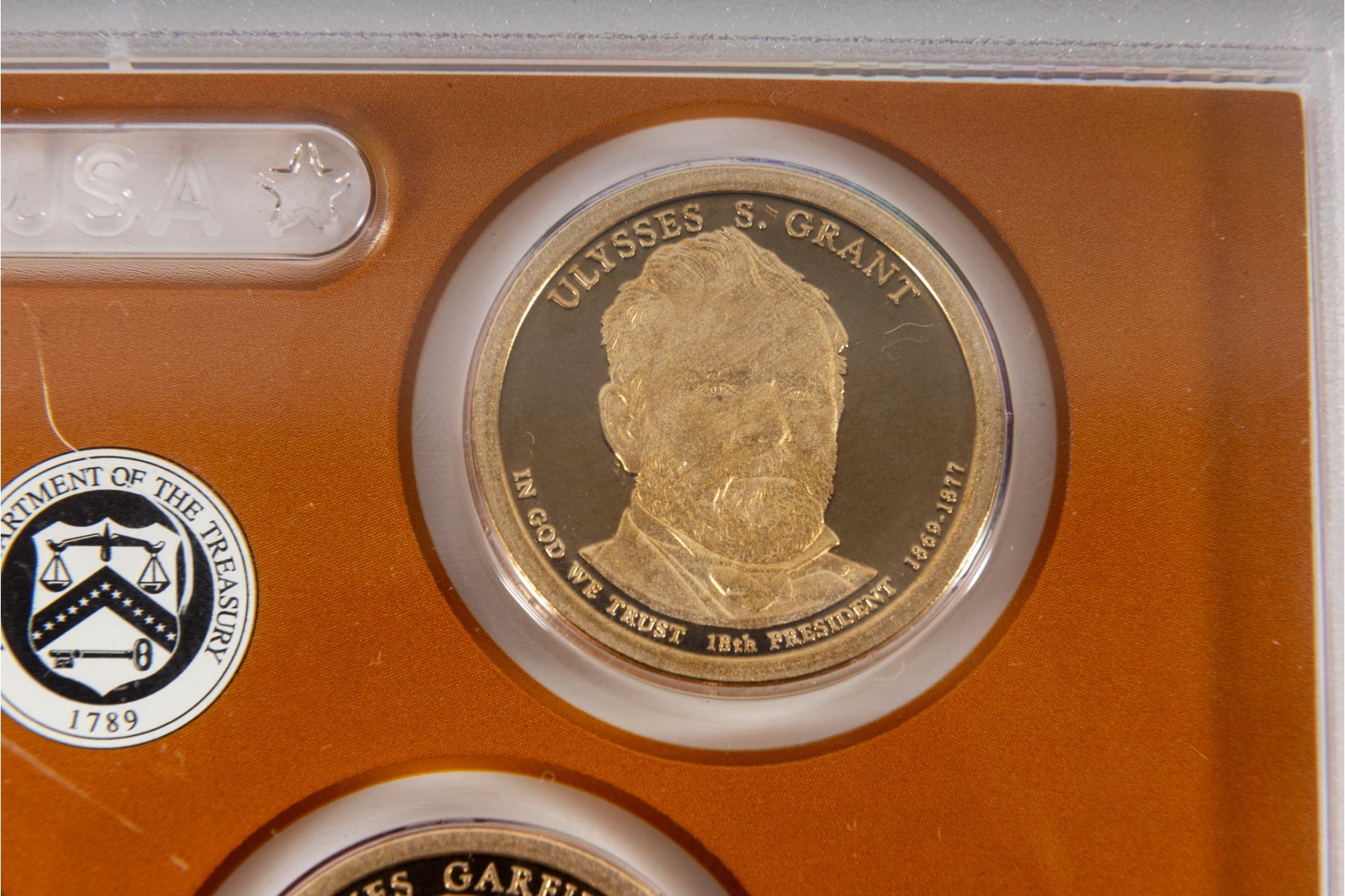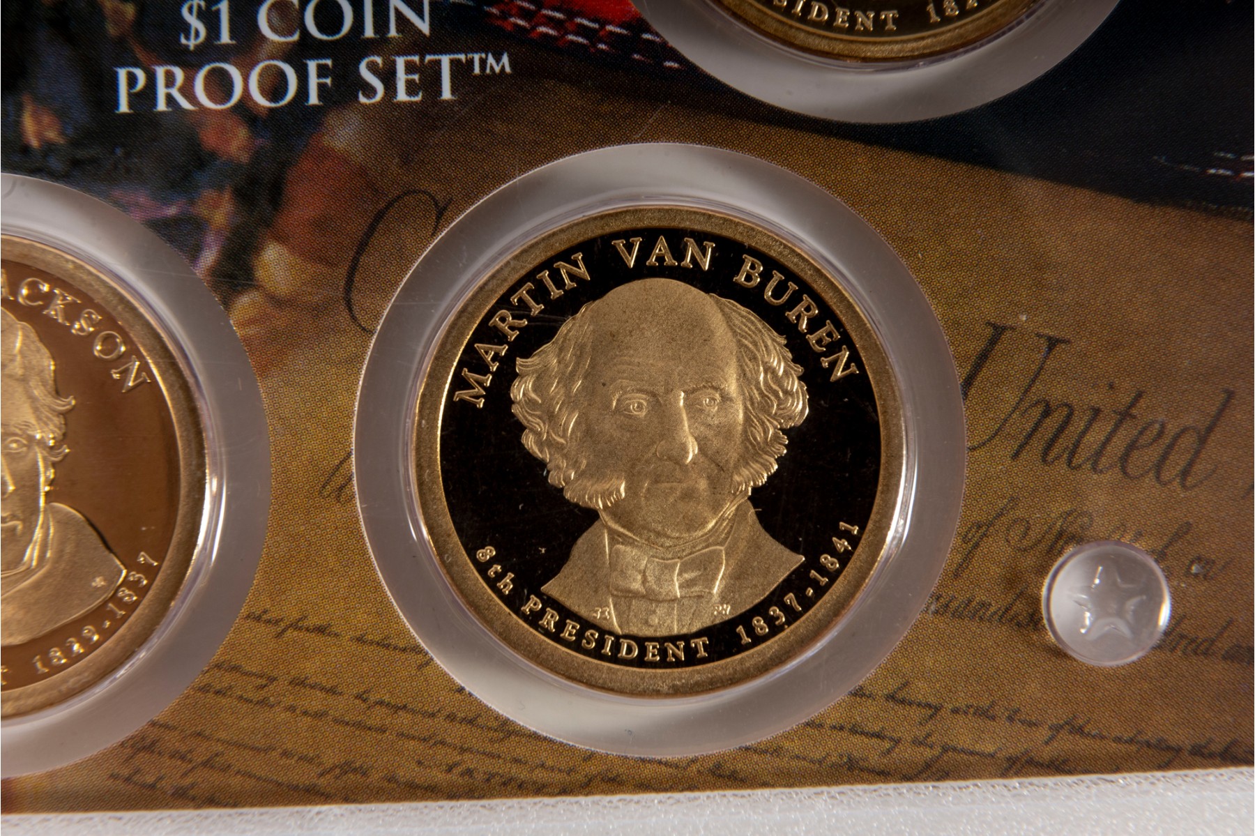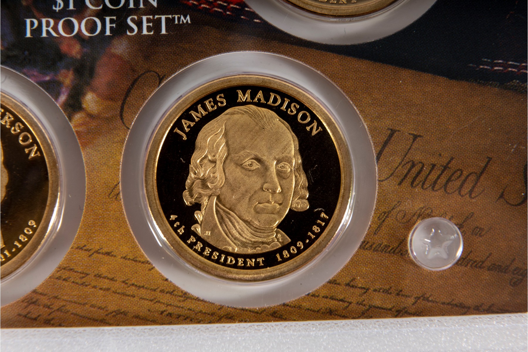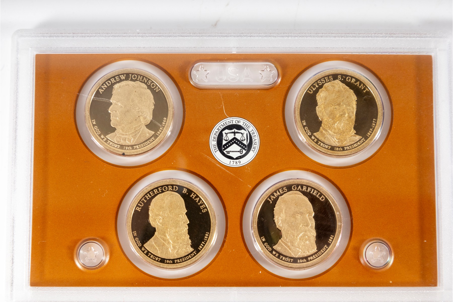 This collection features four United States Mint Presidential Dollar Coin Proof Sets, each containing beautifully struck coins that honor past U.S. presidents. Each set contains four coins.