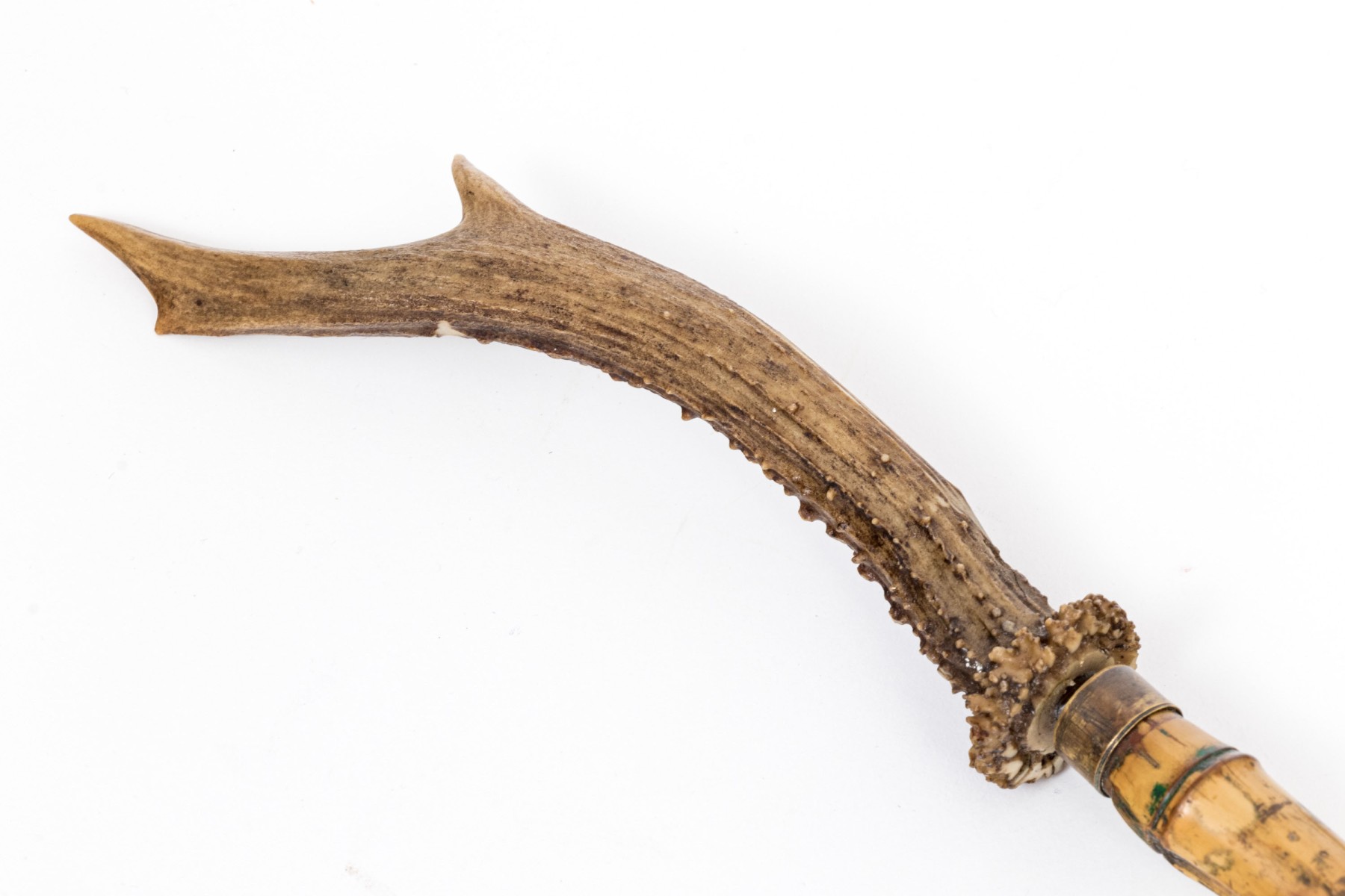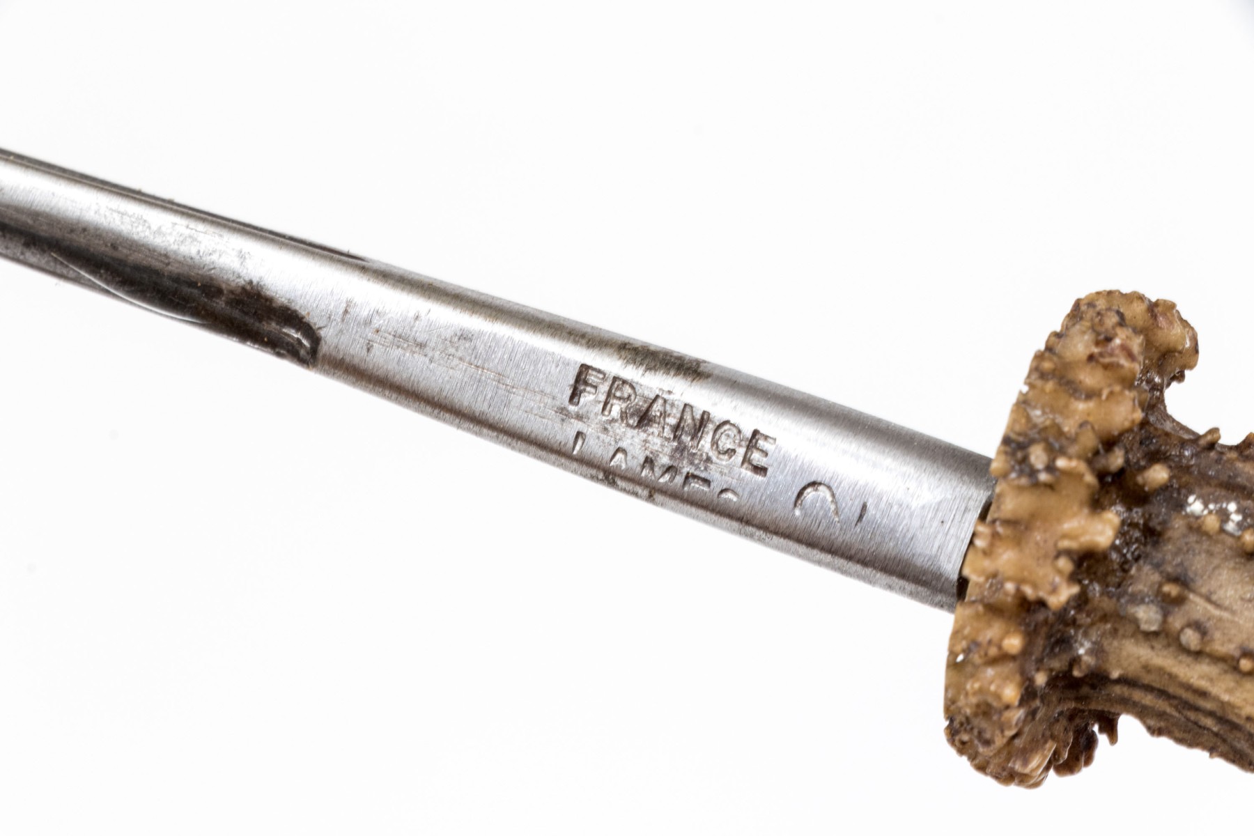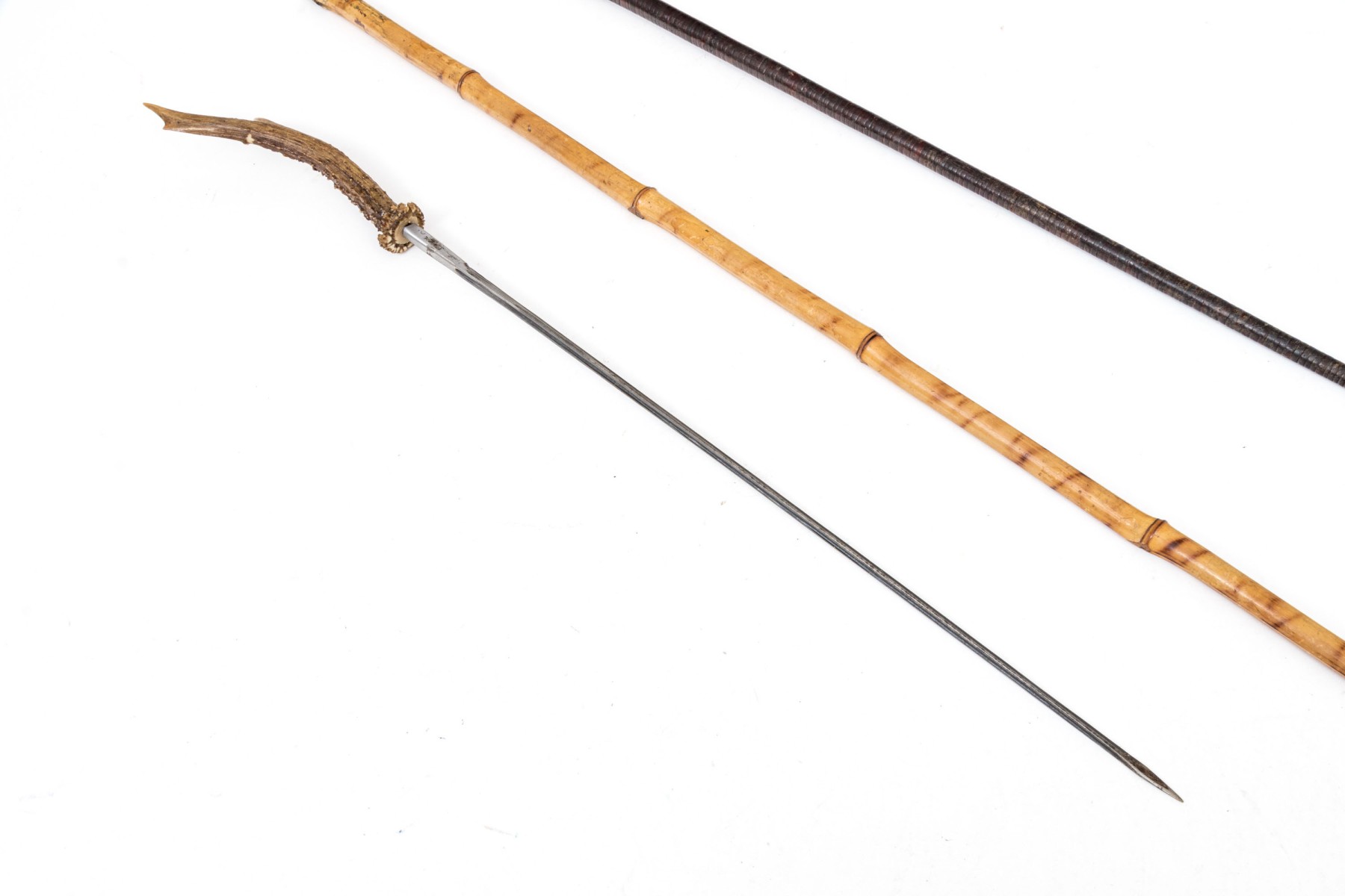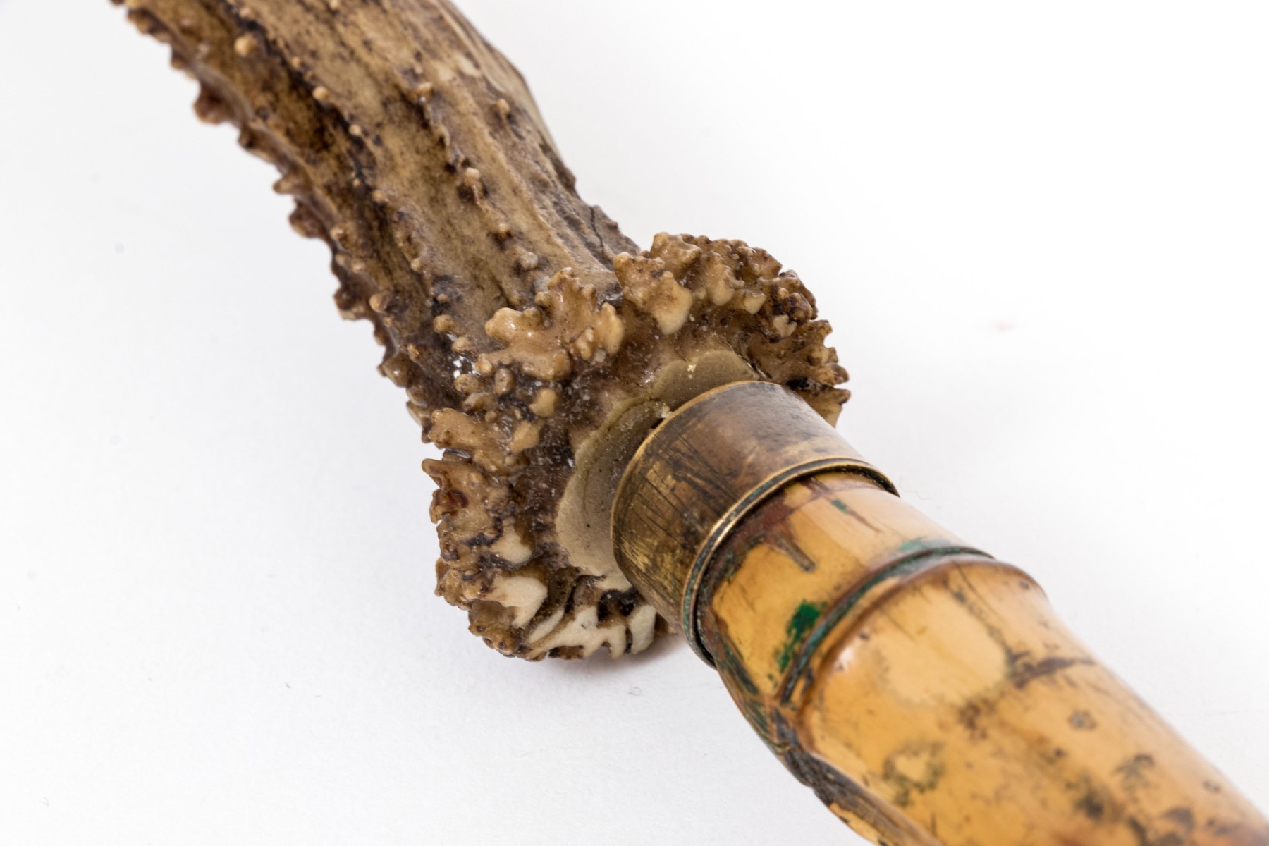 Unusual antique French stag handle sword, with bamboo sheath which makes it into a walking stick, with a three sides blade with blood grooves, finished with a brass collar. Paired with a second antique caine