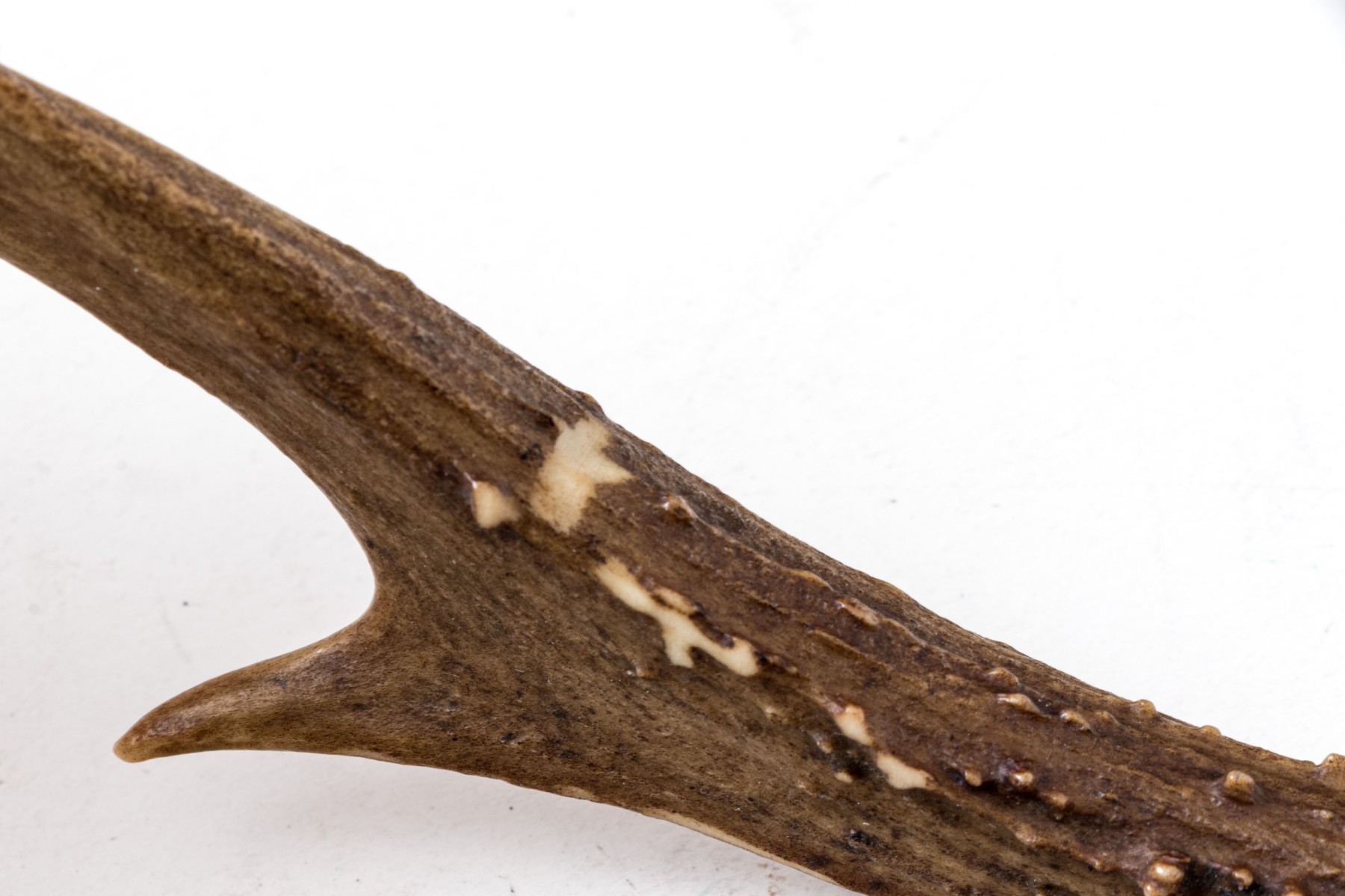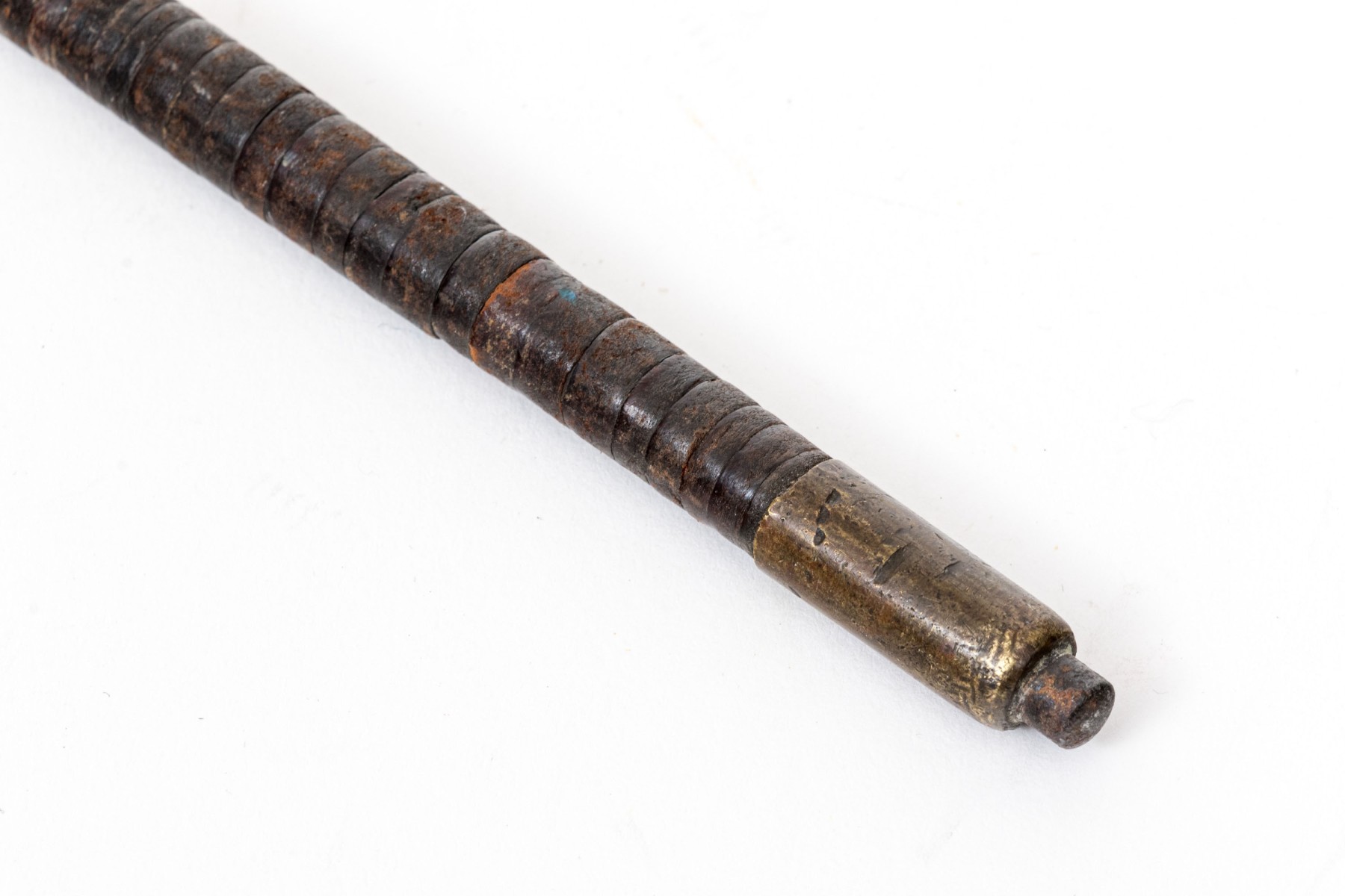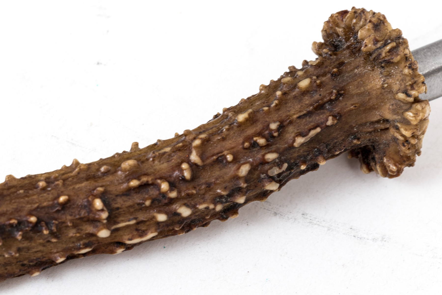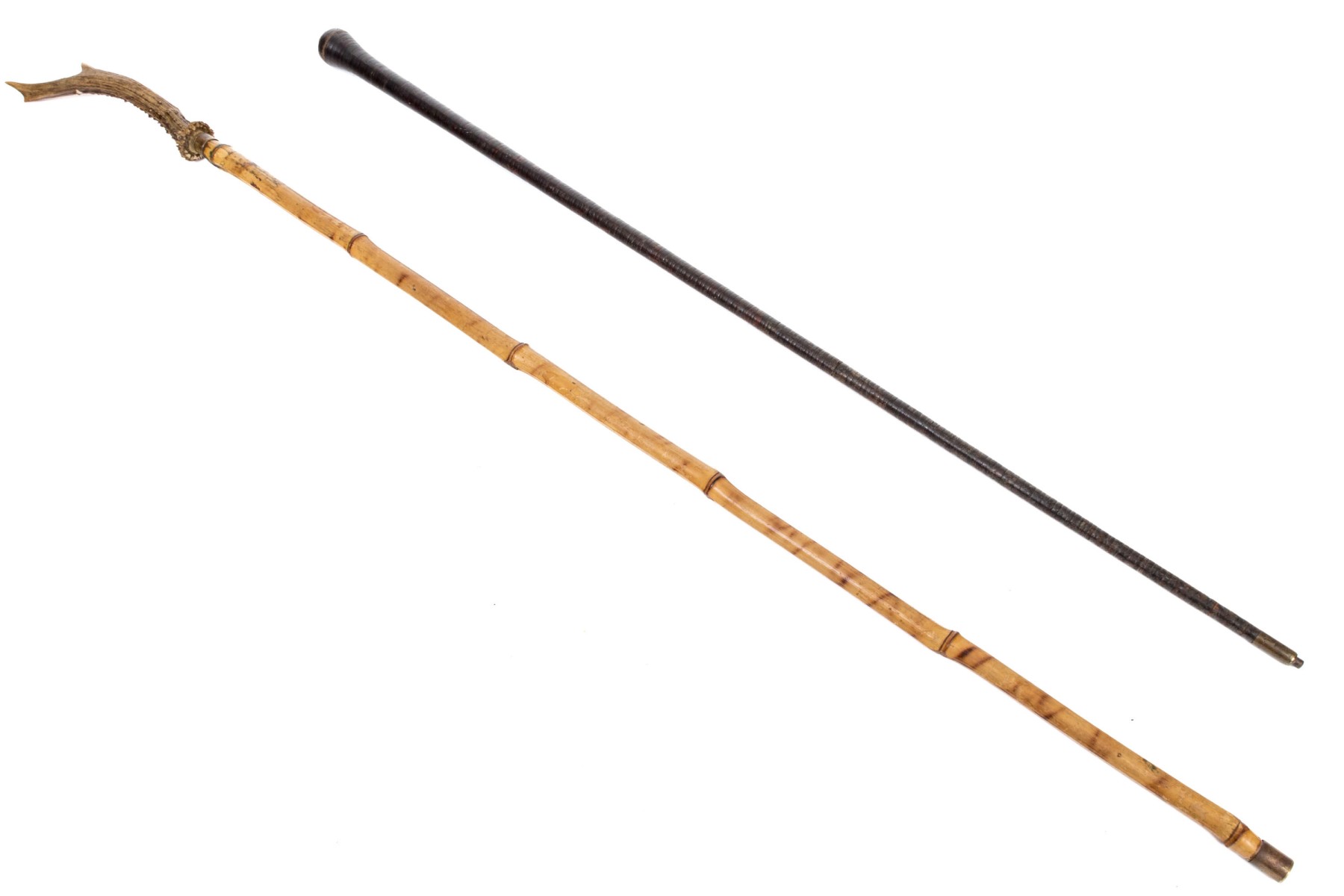 Unusual antique French stag handle sword, with bamboo sheath which makes it into a walking stick, with a three sides blade with blood grooves, finished with a brass collar. Paired with a second antique caine