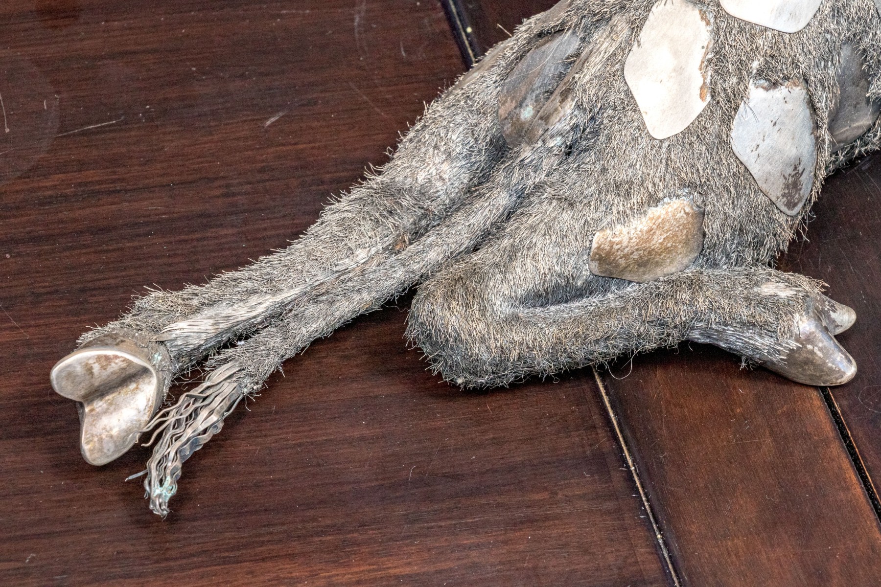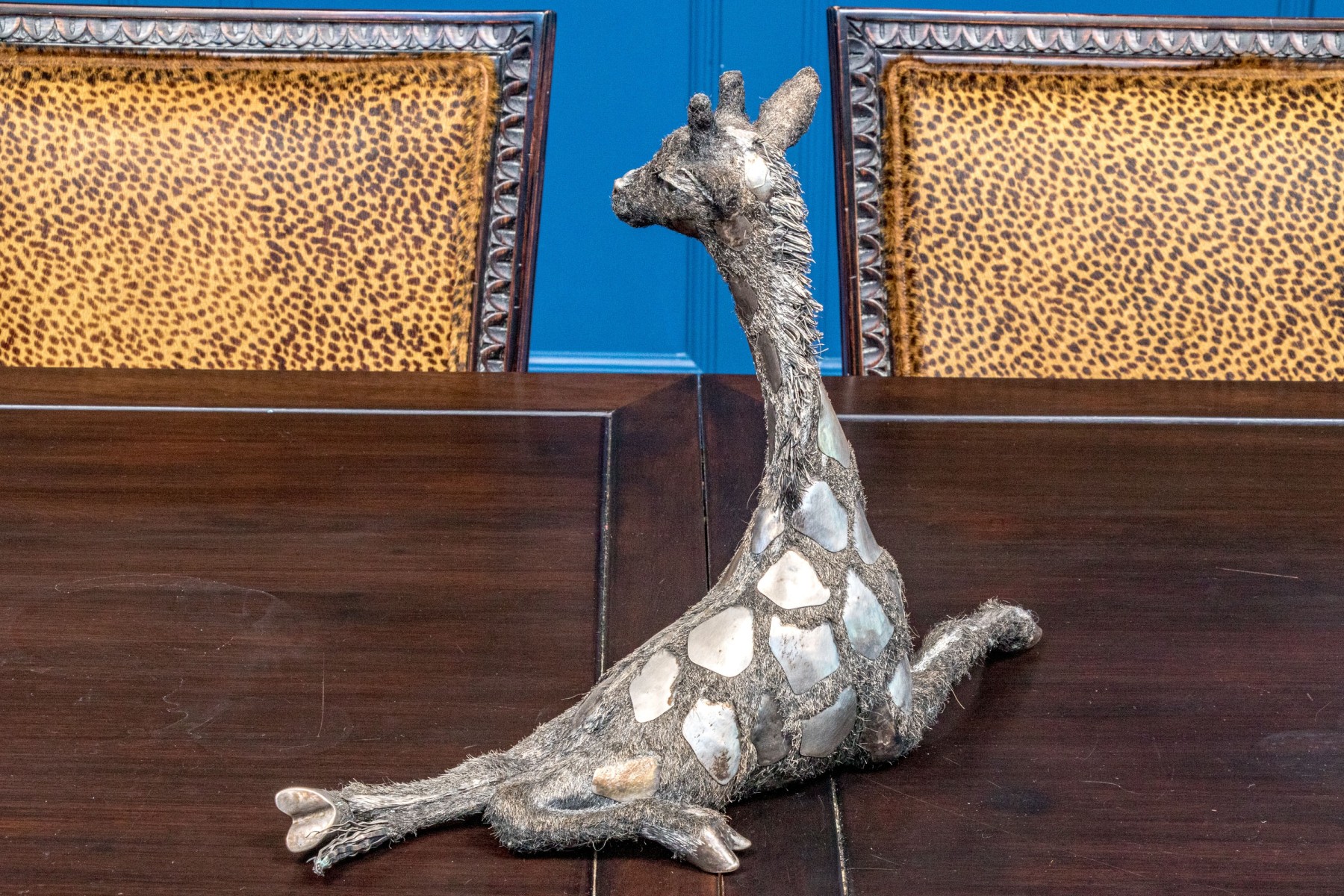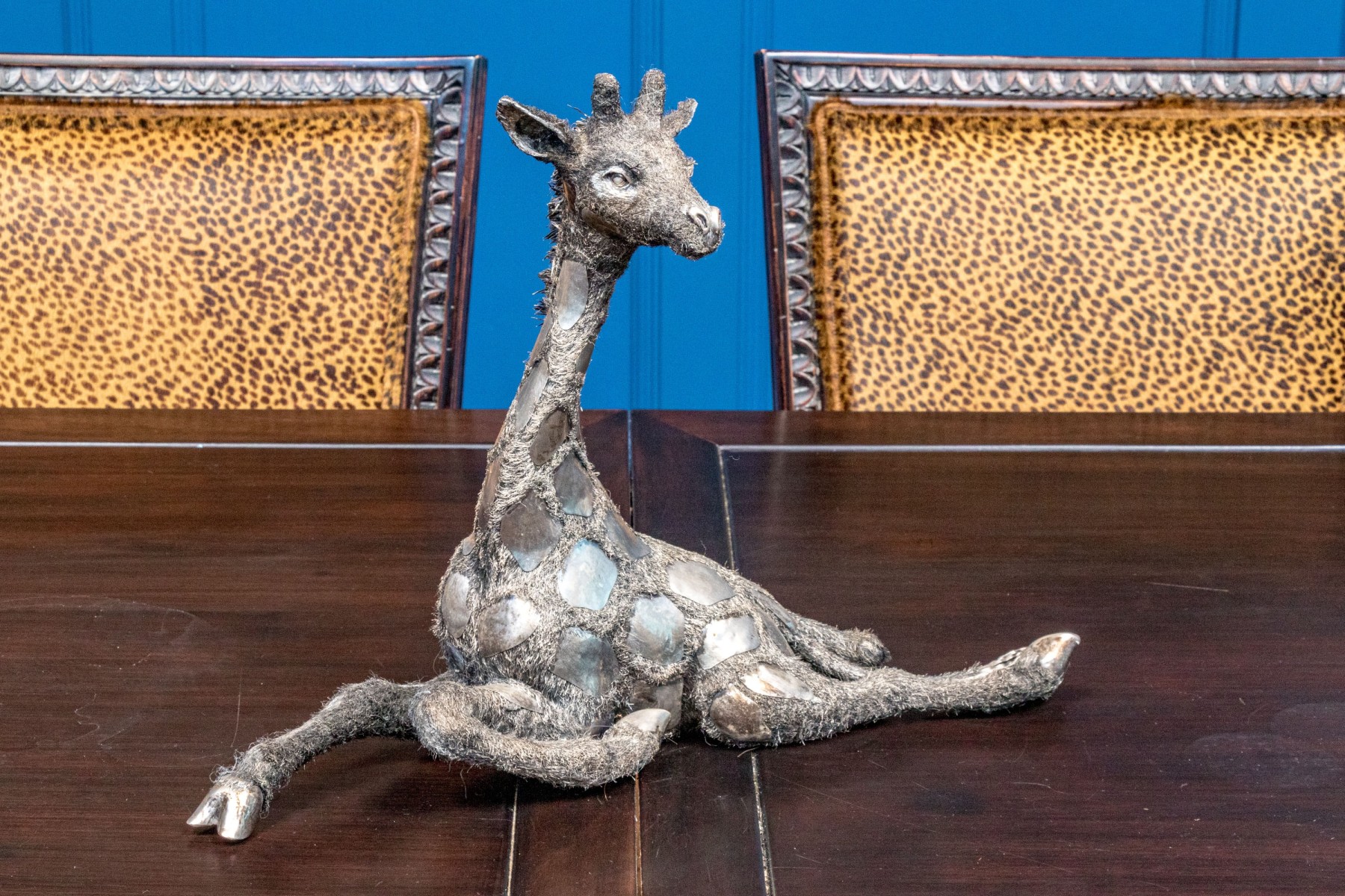 Sterling silver sculpture of a giraffe. The giraffe sits in an elegant pose with one front leg curled and the other legs splayed out, exquisitely detailed with fine silver wire fur creating excellent detail and beautiful contrast with smooth patches. Marked on the underbelly.