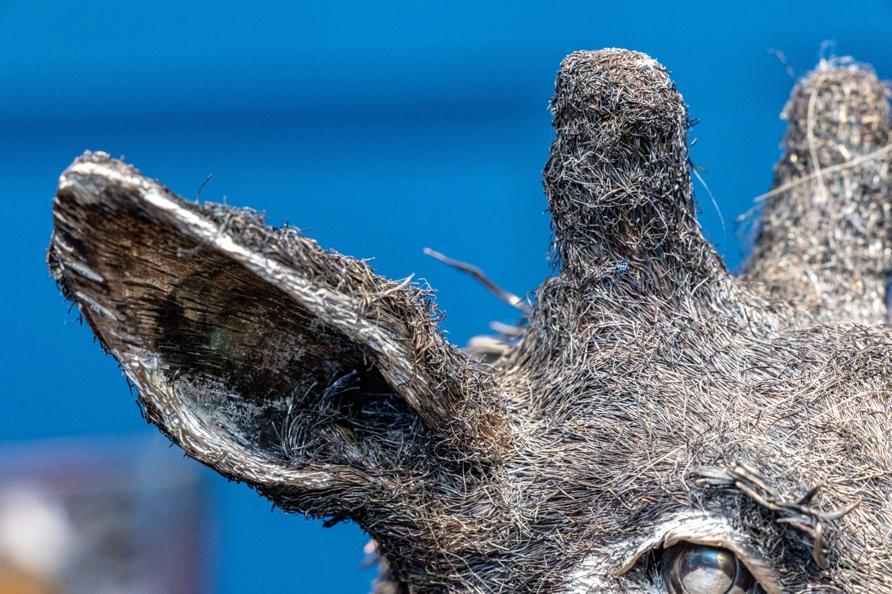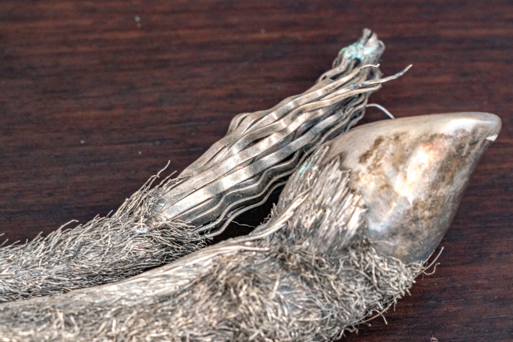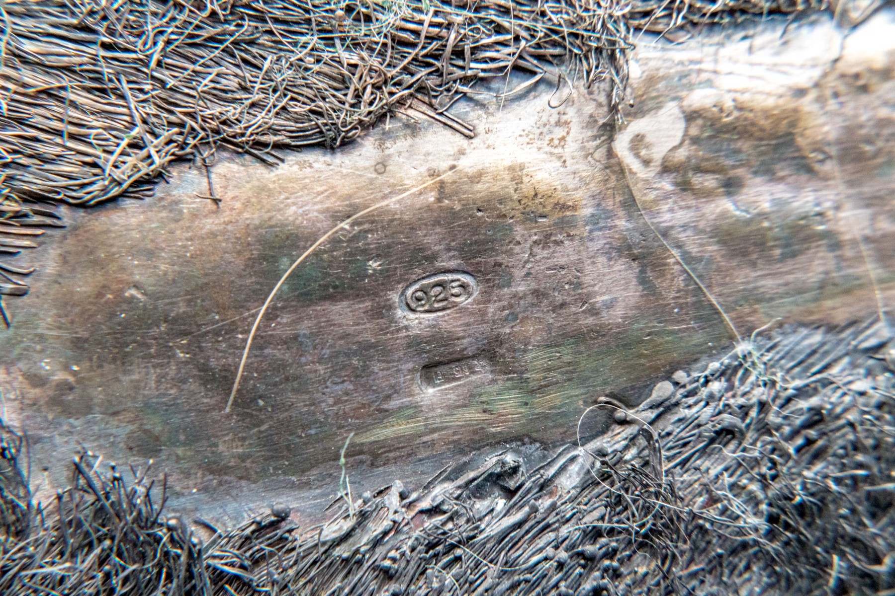 Sterling silver sculpture of a giraffe. The giraffe sits in an elegant pose with one front leg curled and the other legs splayed out, exquisitely detailed with fine silver wire fur creating excellent detail and beautiful contrast with smooth patches. Marked on the underbelly.